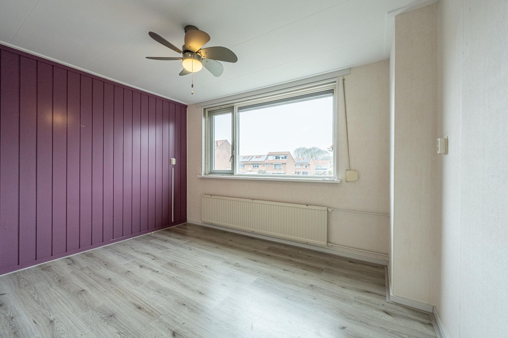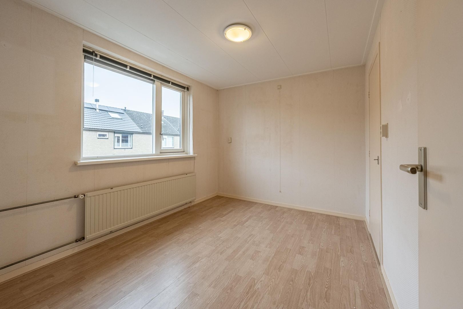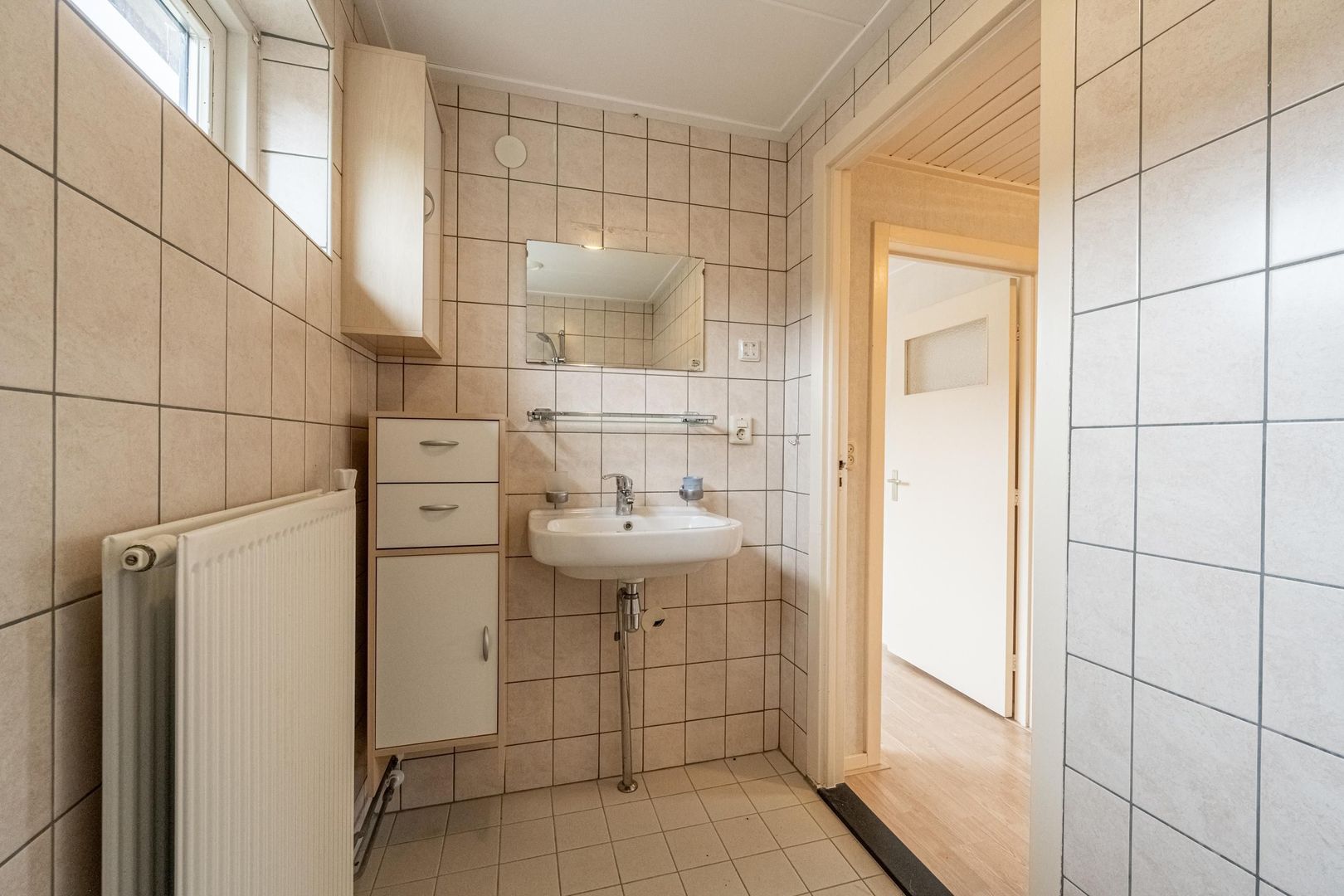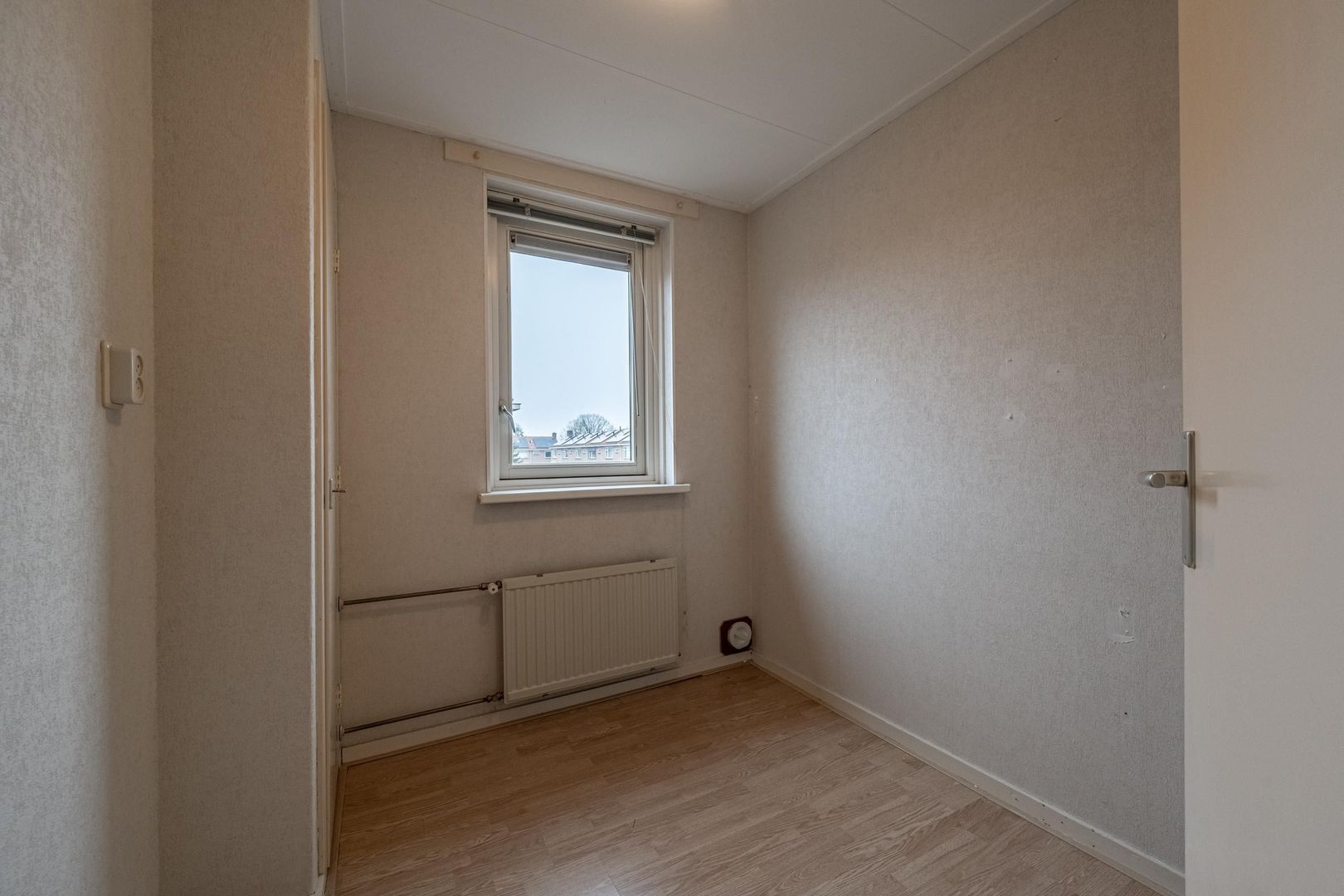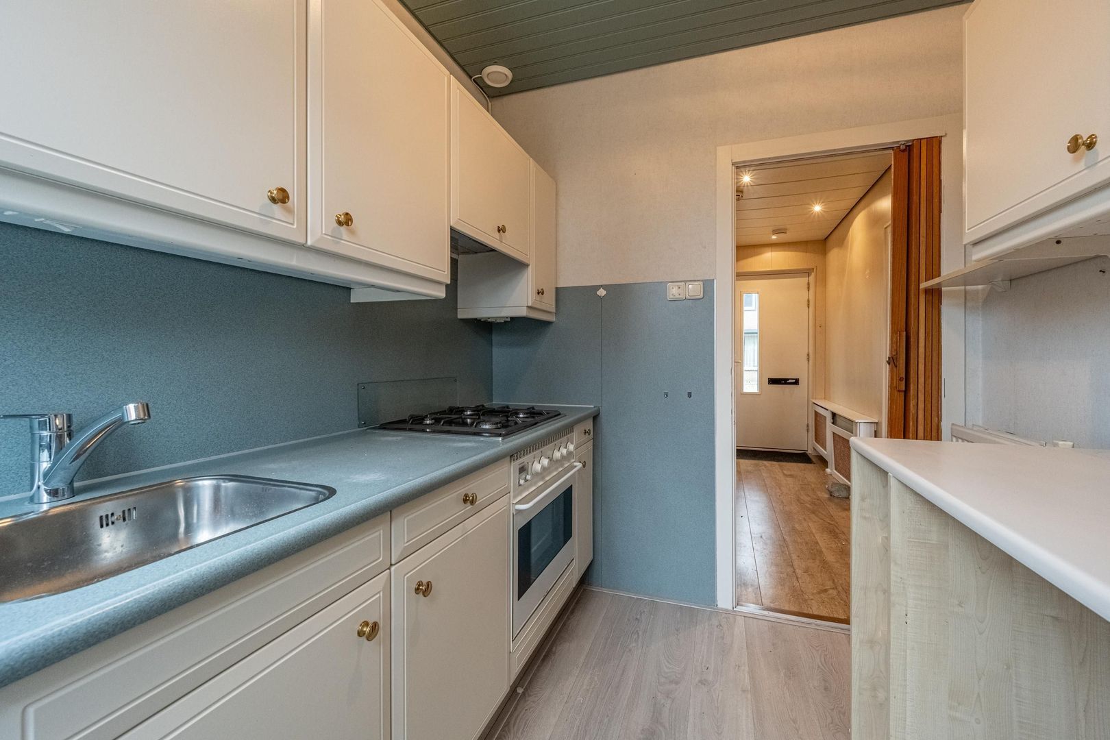 Lichte doorzon woonkamer met leuk zijraam. Dichte keuken met eenvoudige, maar nette wandopstelling.