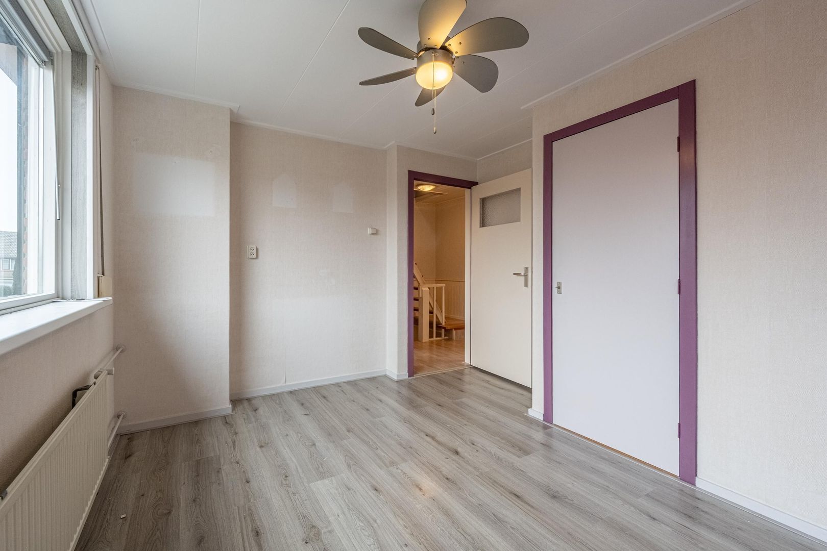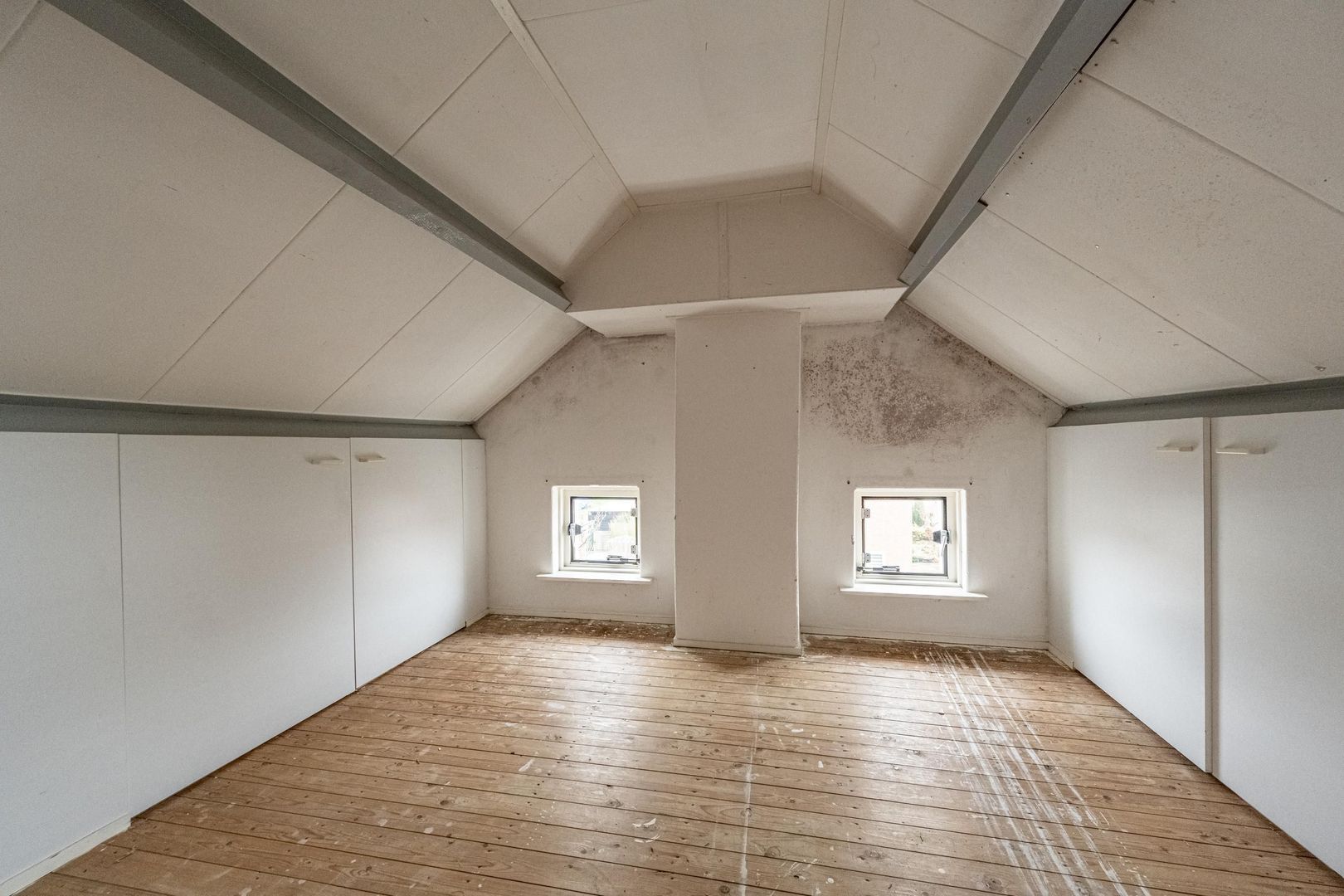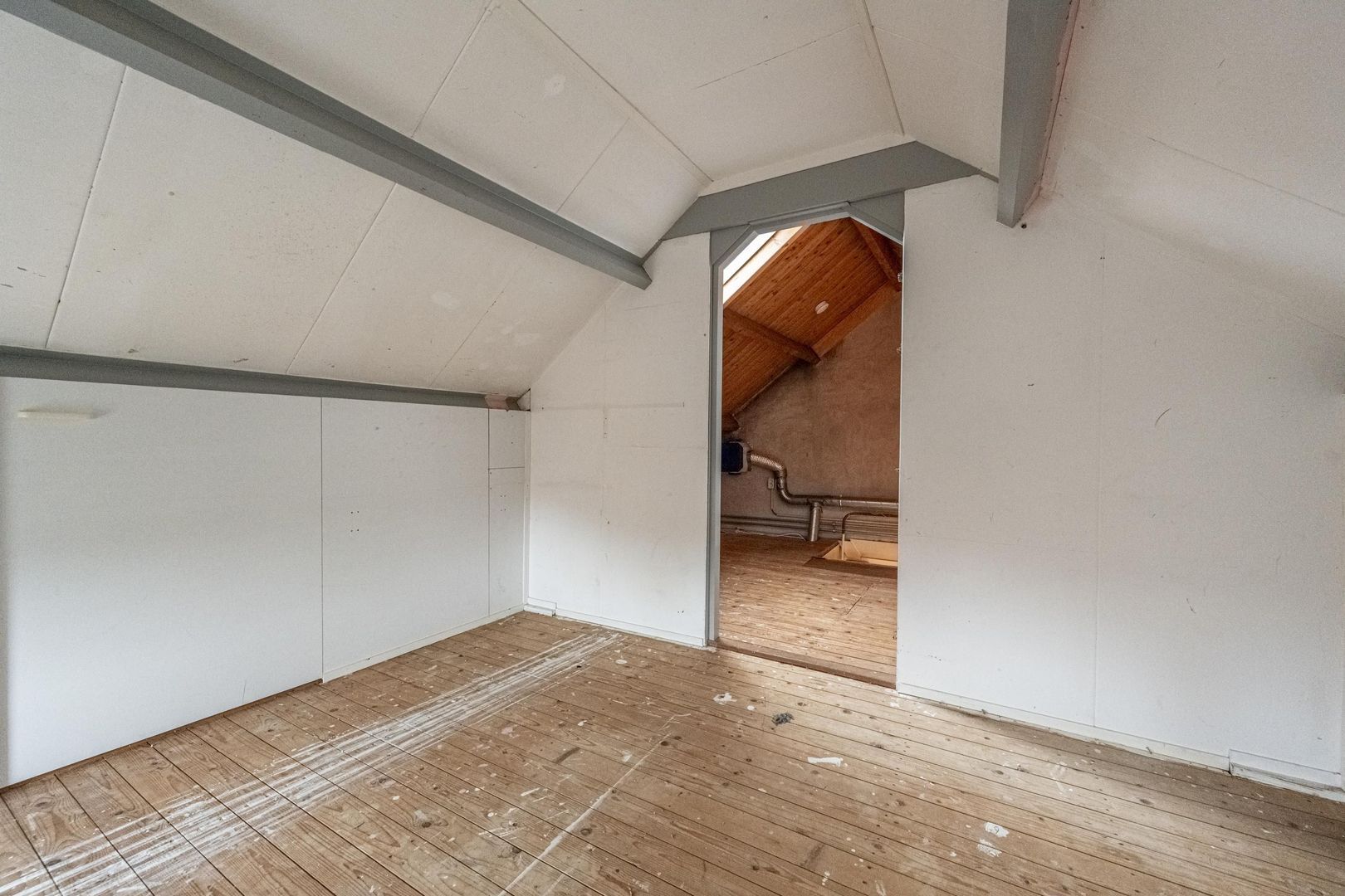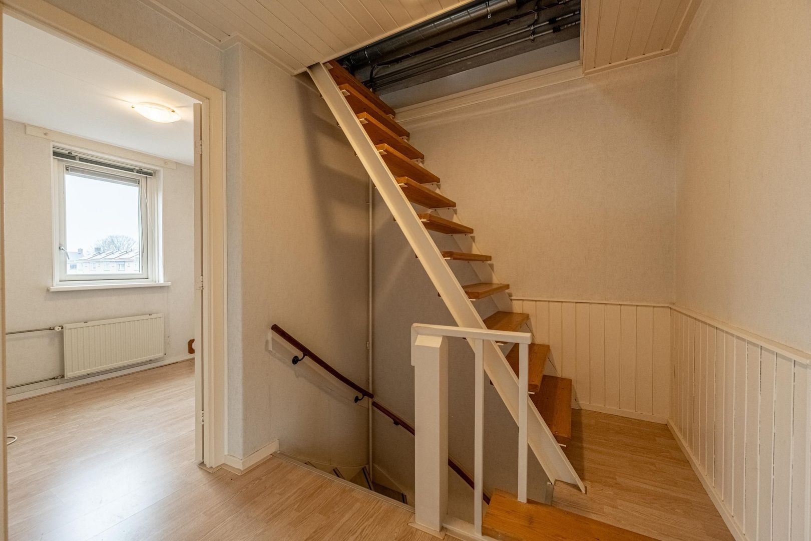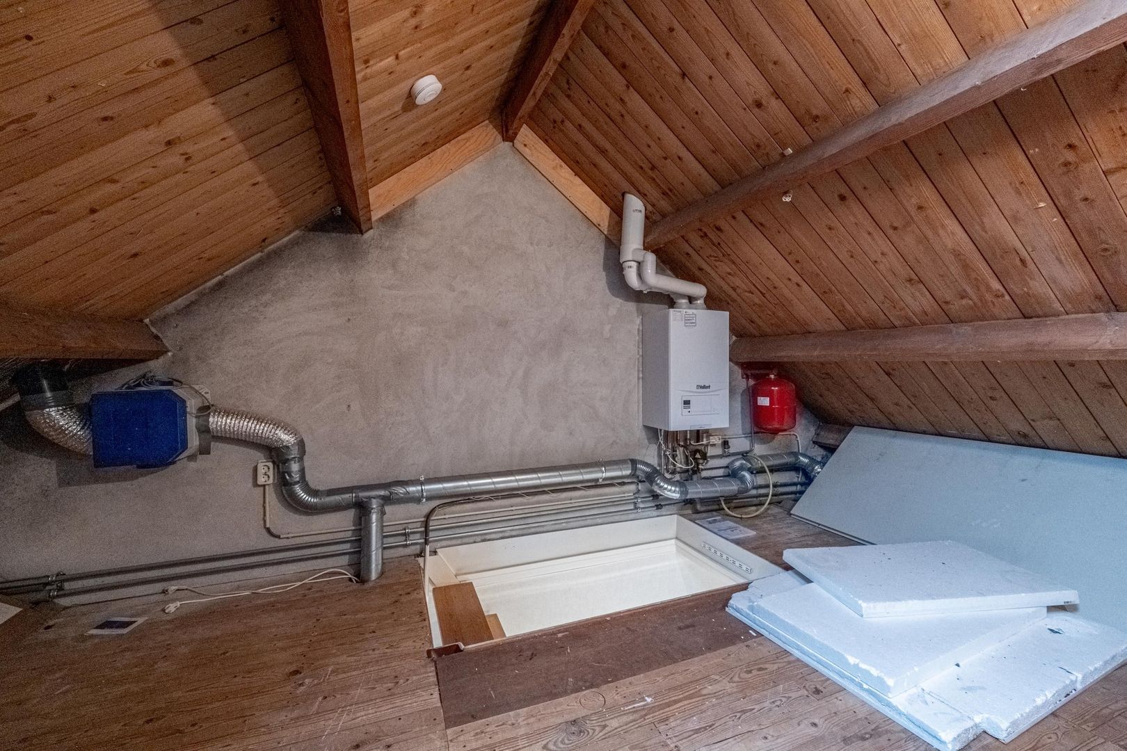 Er is een vast trap naar de tweede verdieping gemaakt. Hier is een zolderkamer met 2 zijramen en de opstelplaats van de cv-ketel (Vaillant 2018) en mechanische ventilatie-unit.