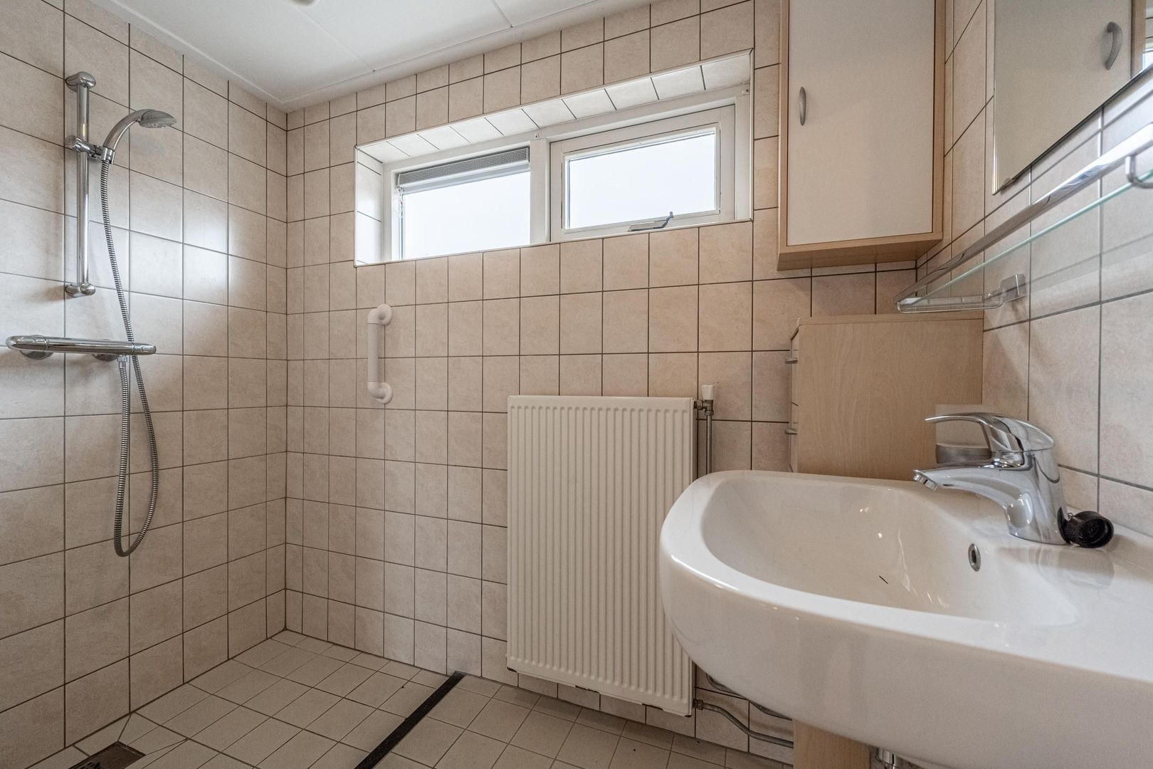 Op de verdieping zijn drie slaapkamers en een badkamer. Deze is voorzien van een doucheruimte, wastafel en een raam voor daglicht en ventilatie.