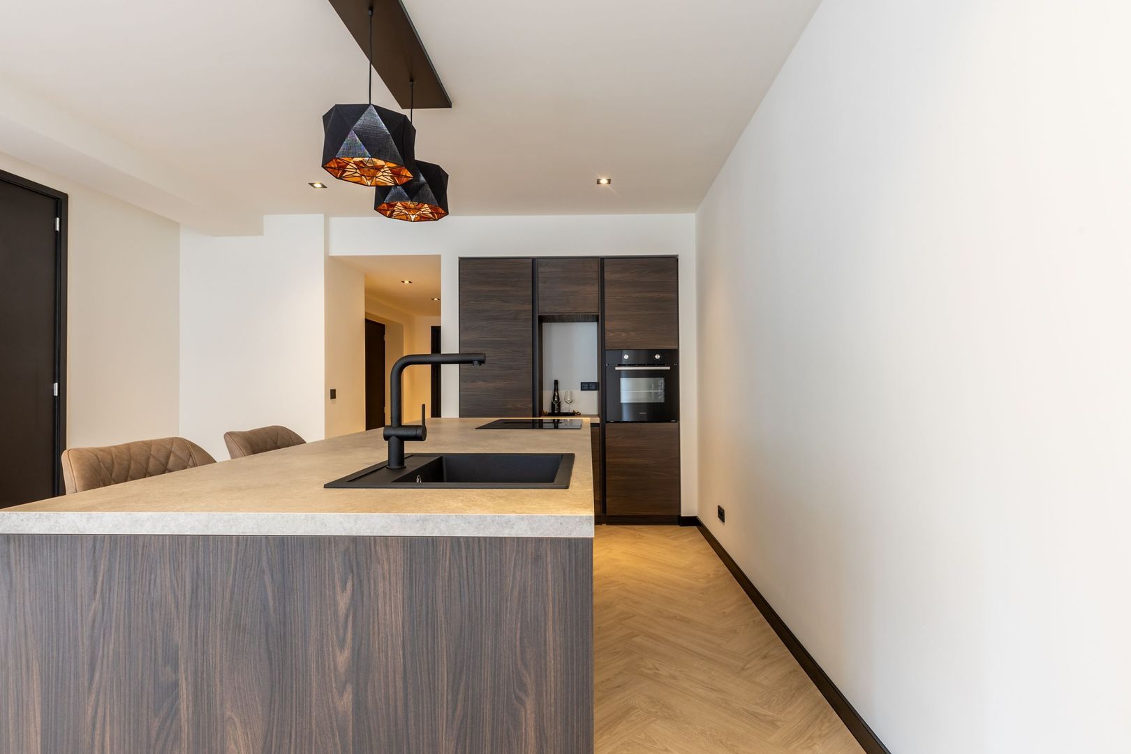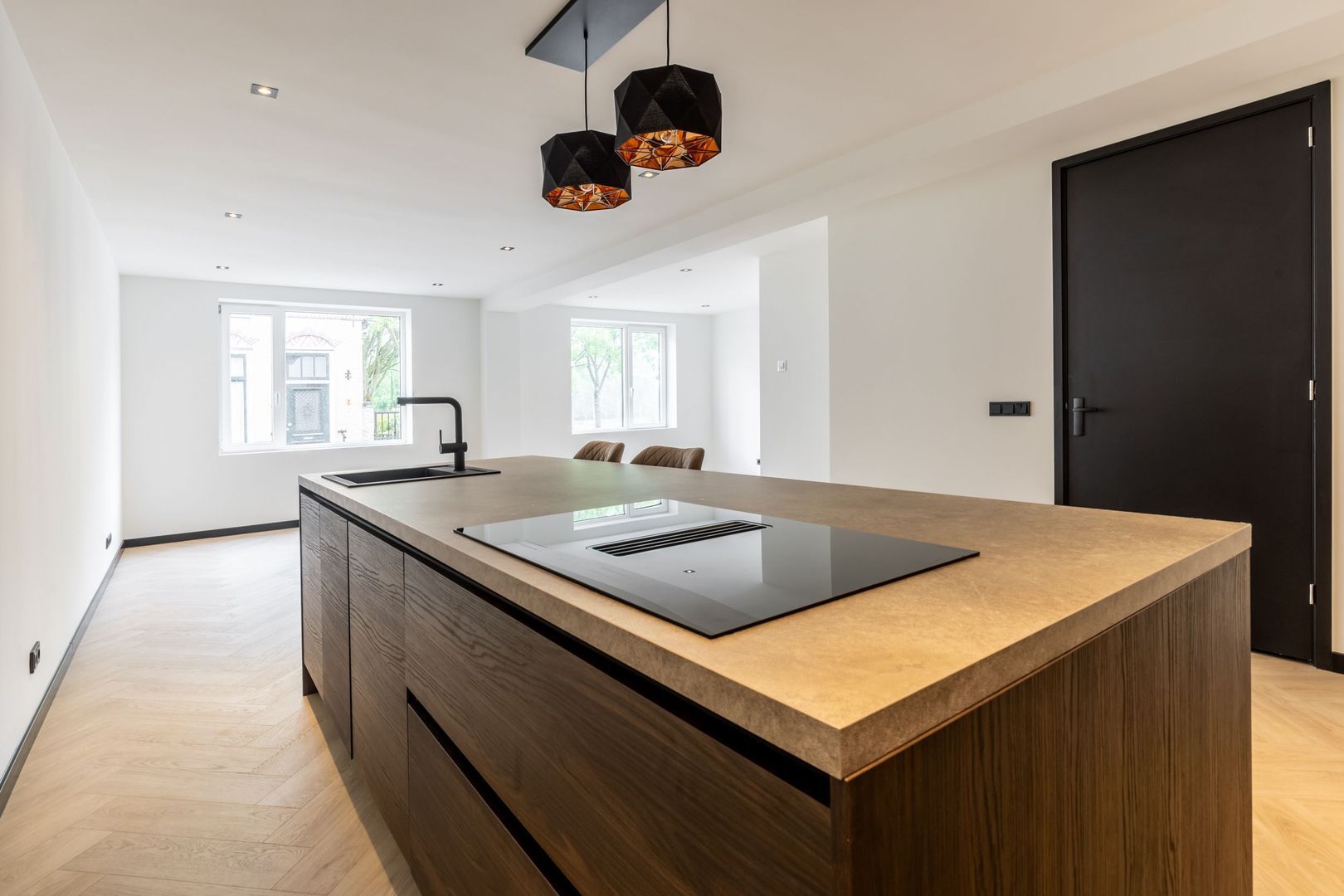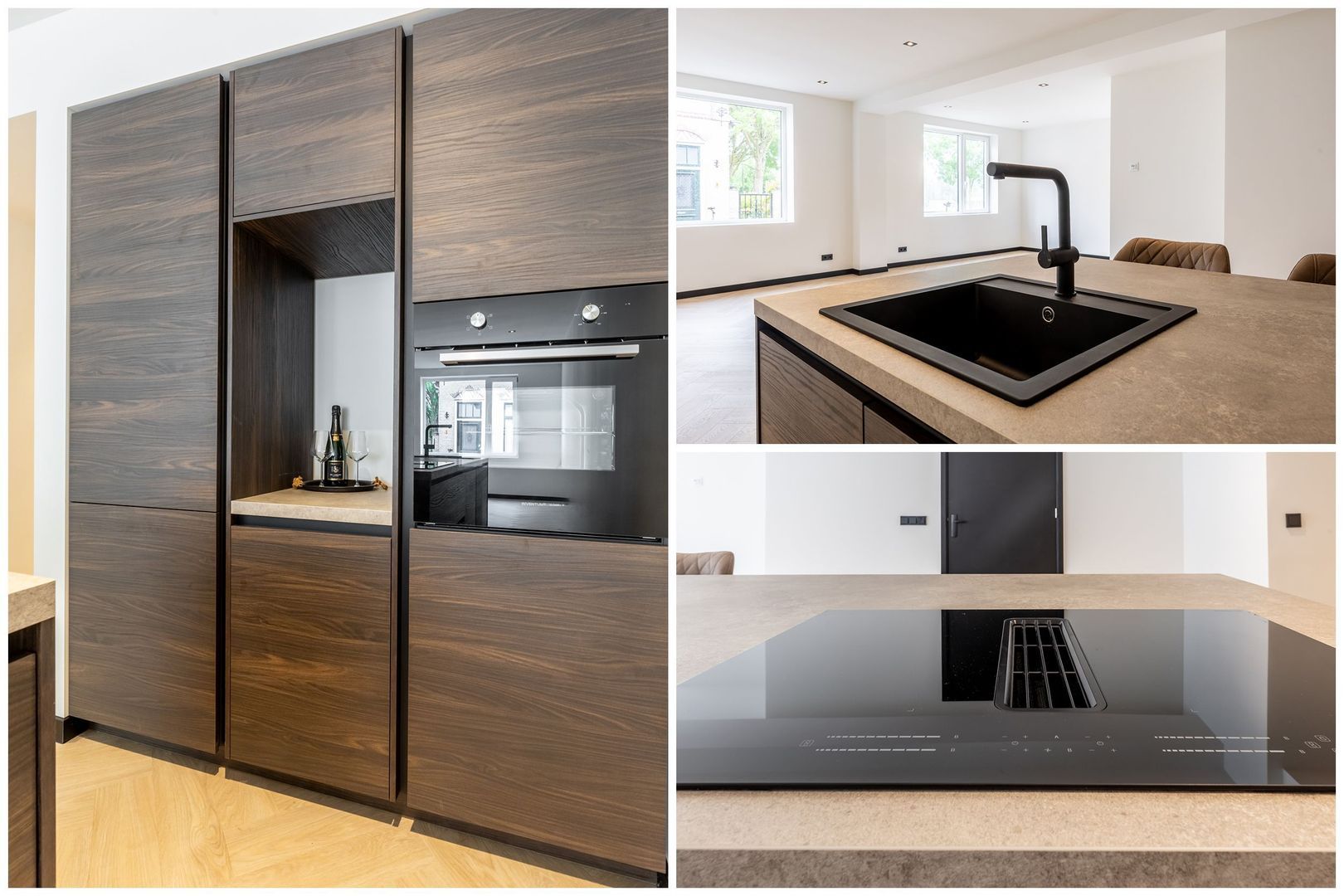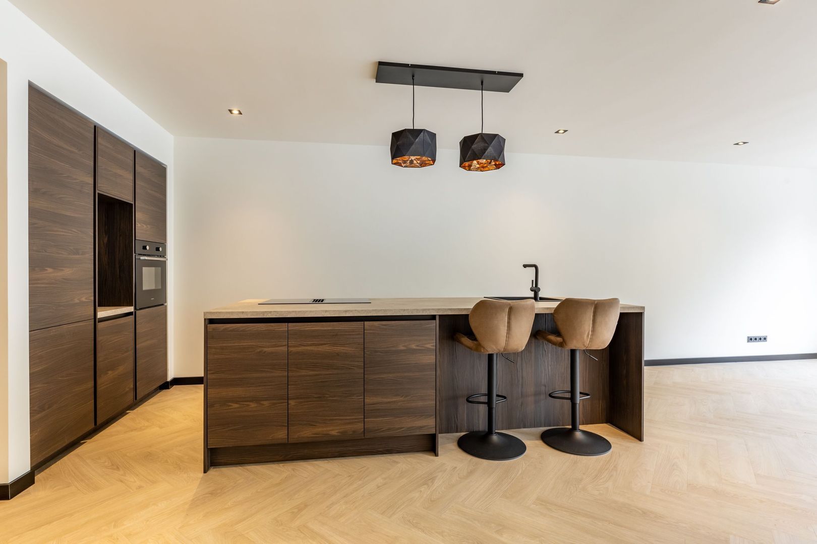De open keuken heeft een luxe inrichting en bestaat uit een (spoel/kook)eiland met inductie kookplaat met geïntegreerde afzuiging en een wandopstelling met kasten en inbouwapparatuur.