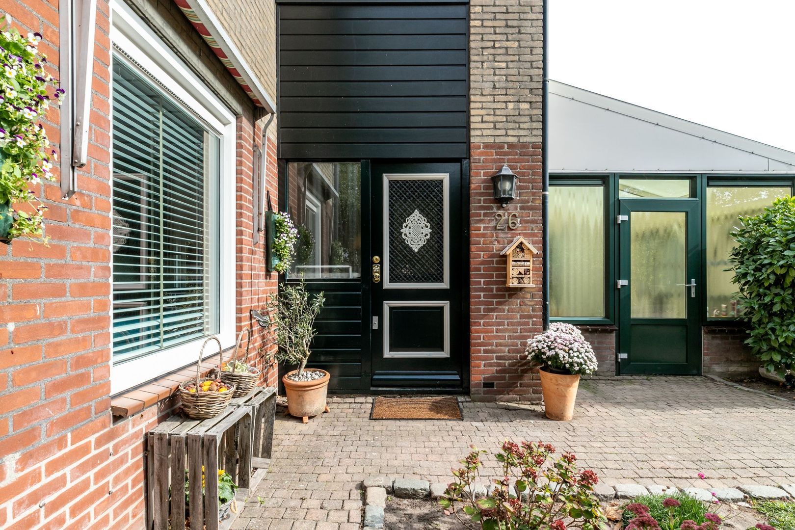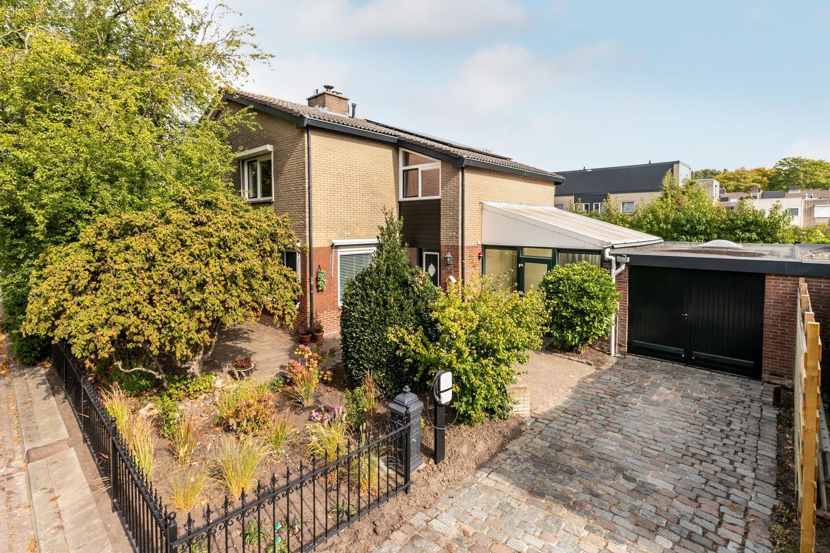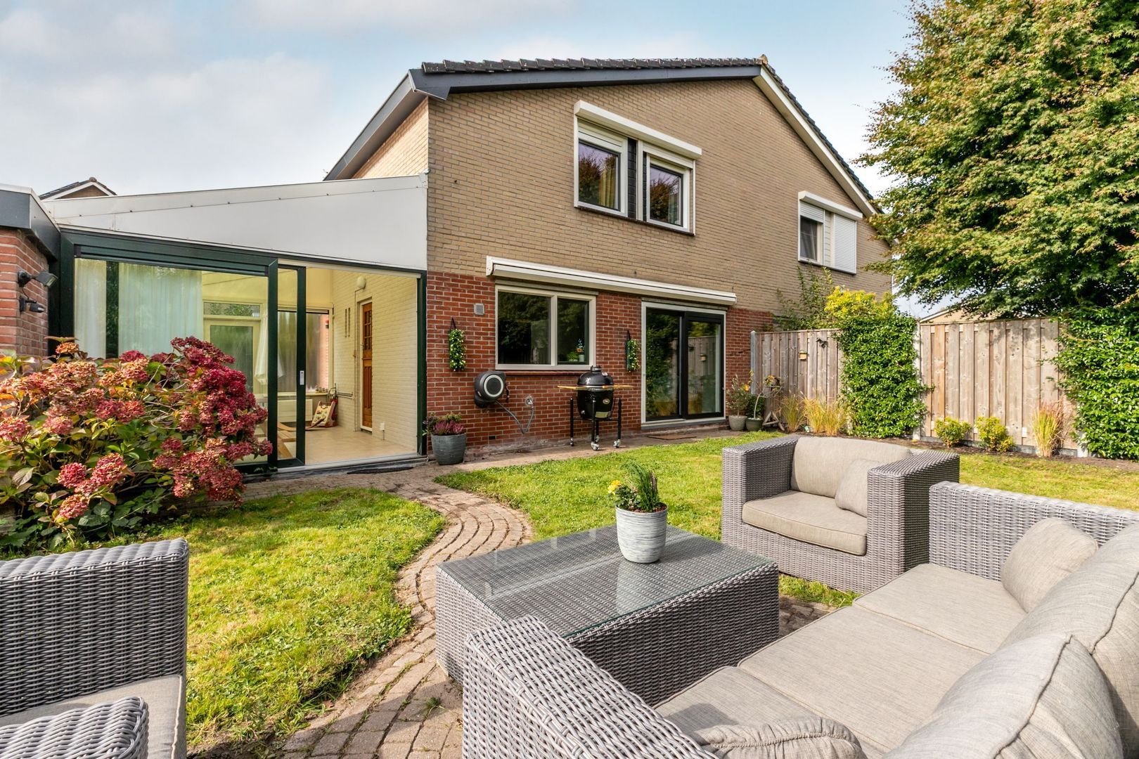 Eigentijds afgewerkte twee-onder-een-kapwoning met aangebouwde serre en garage.