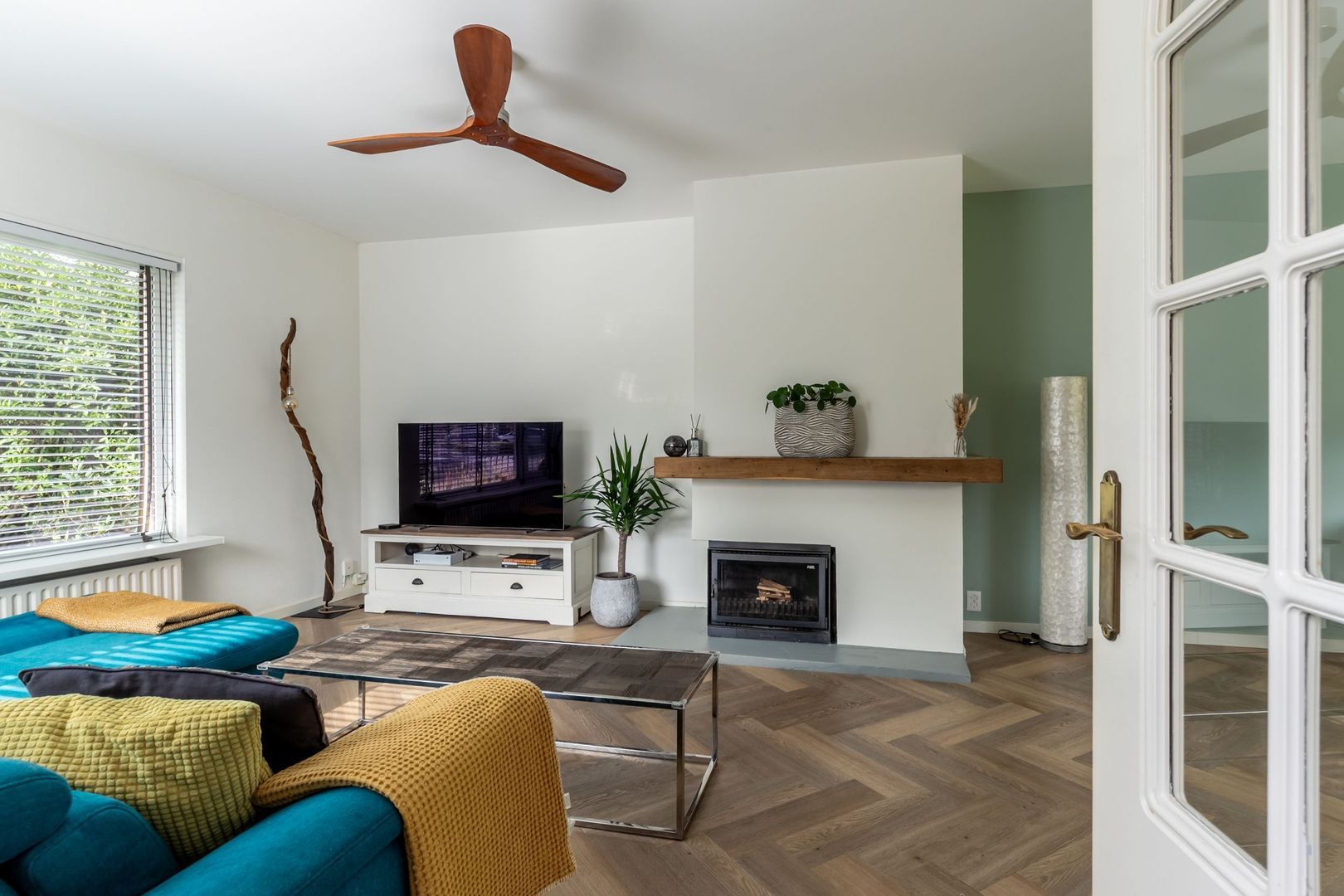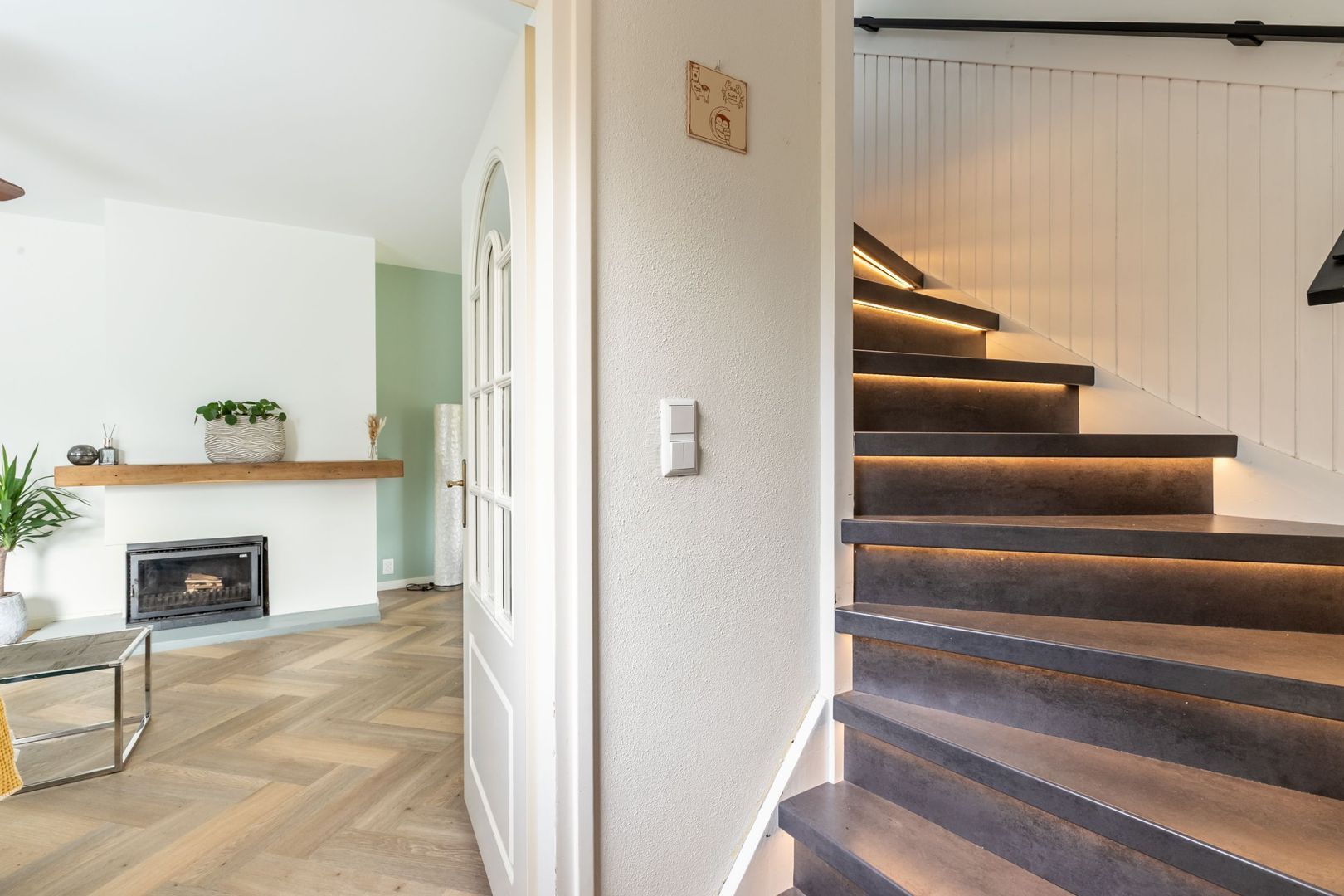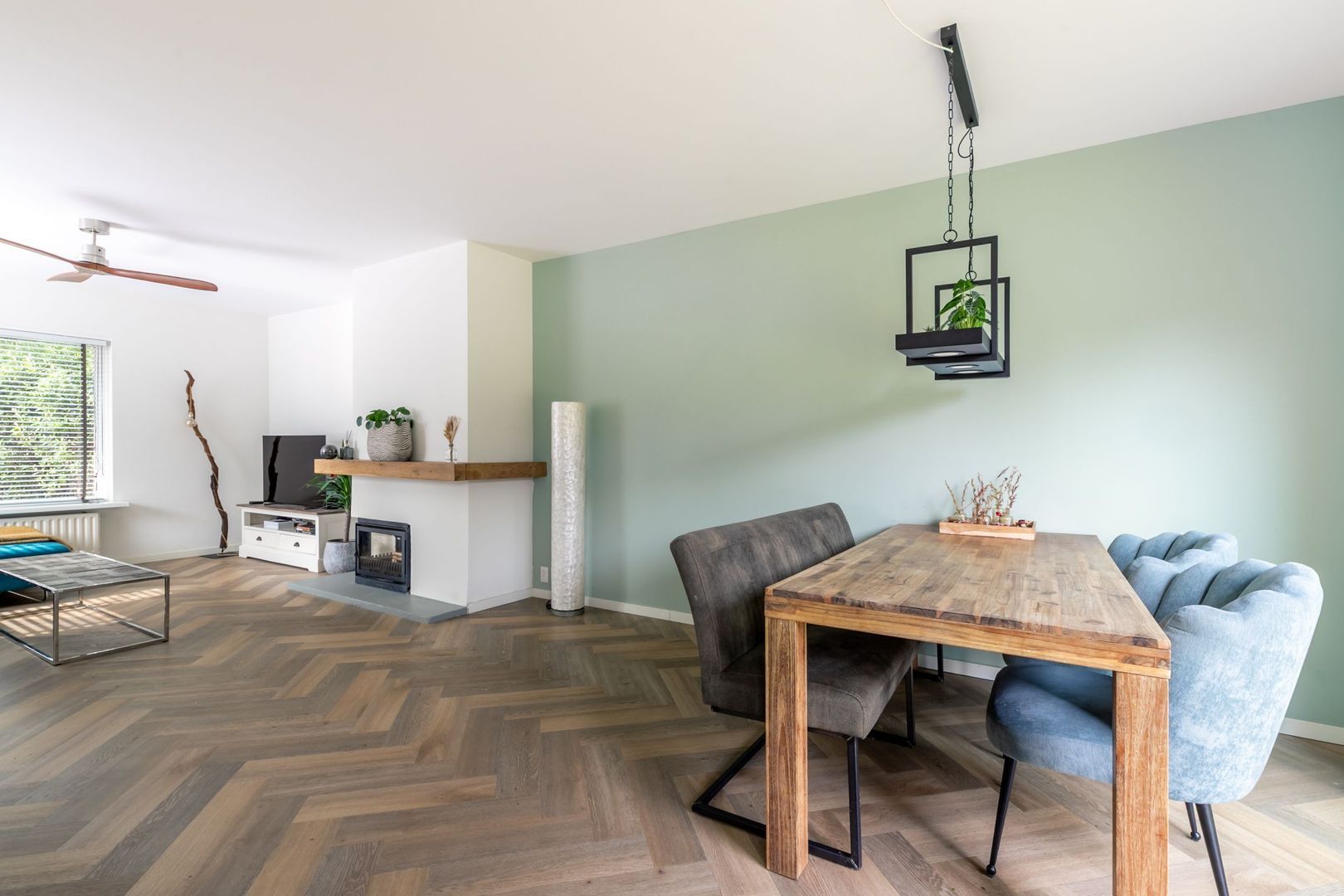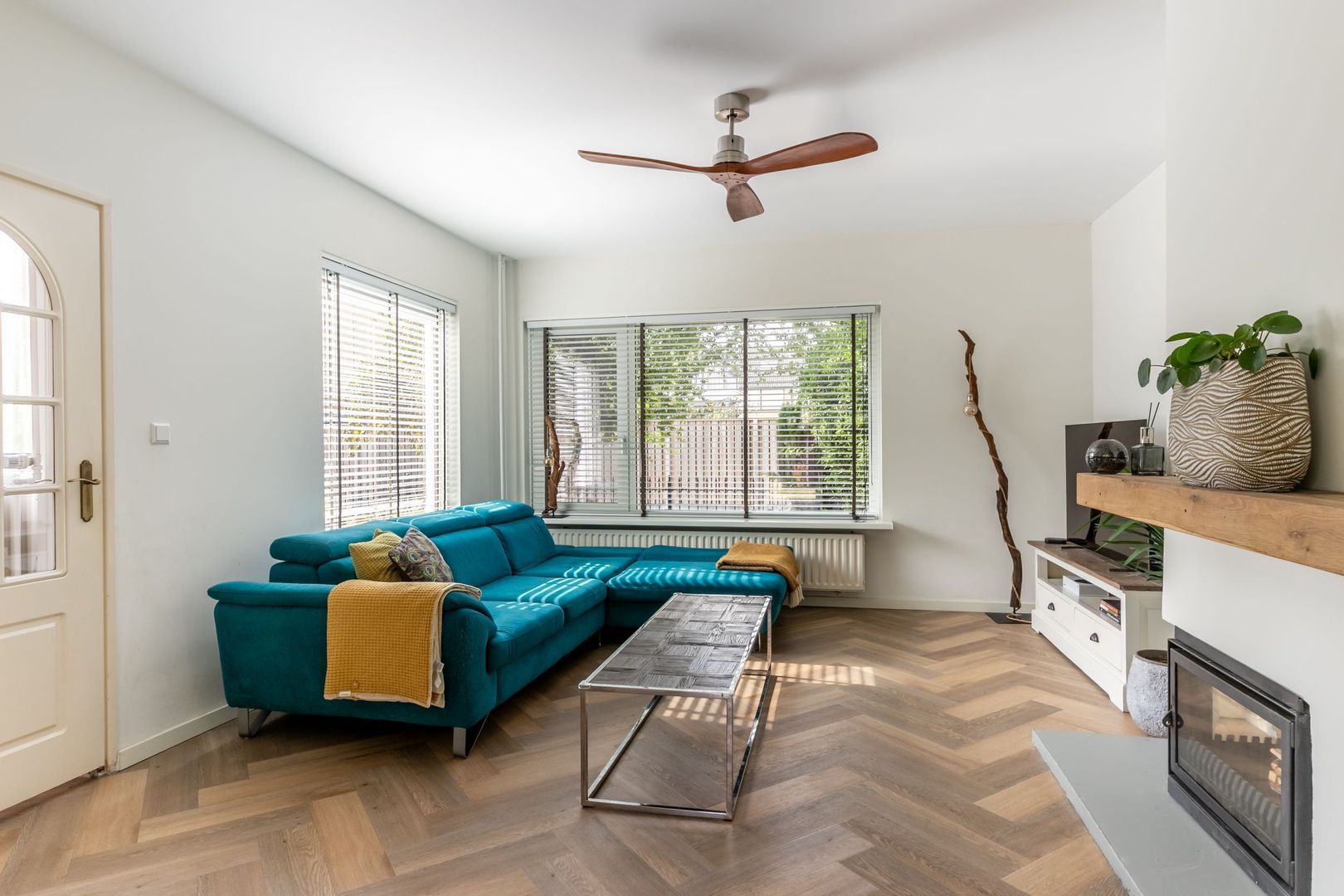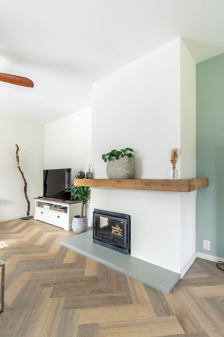 De woonkamer kenmerkt zich door een prettige lichtinval, een gezellige schouw met openhaard en een schuifpui naar de tuin.