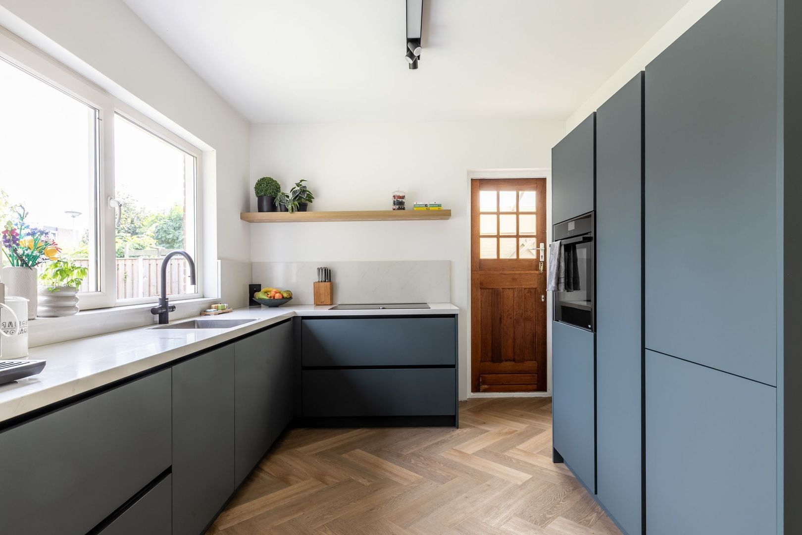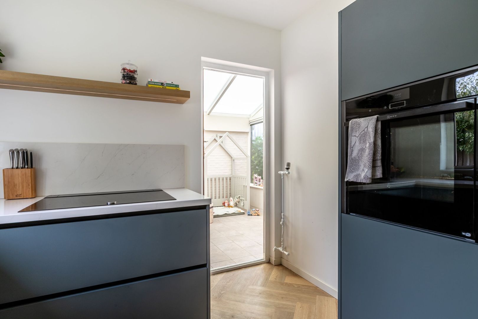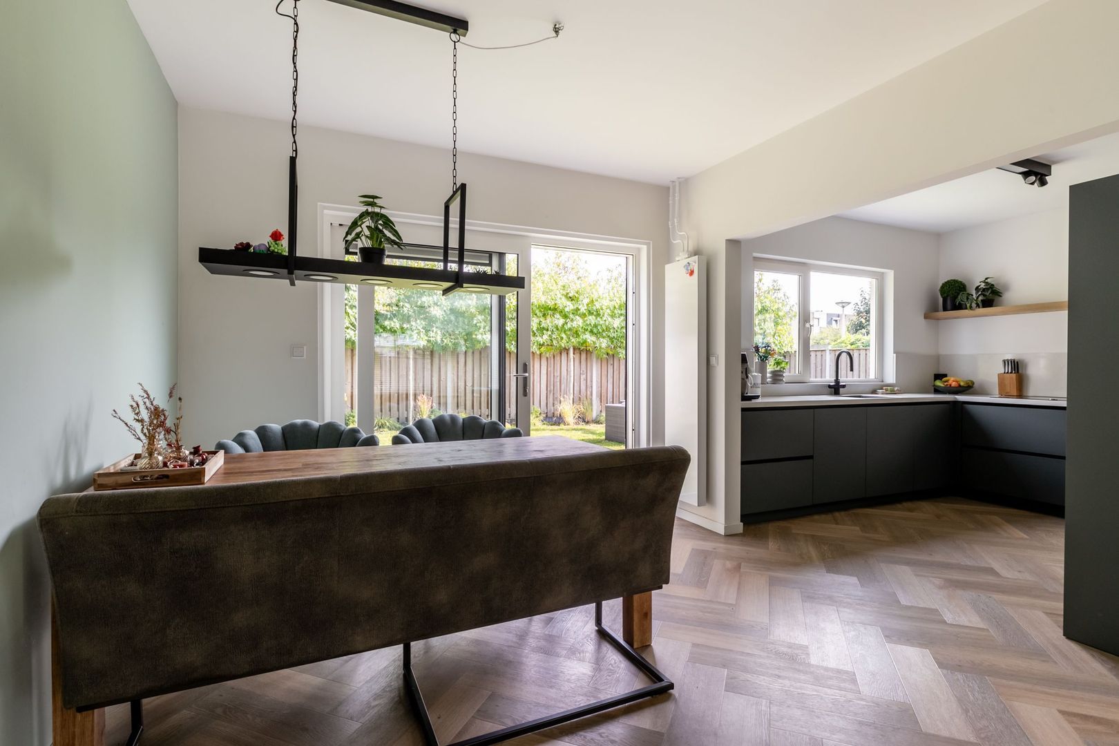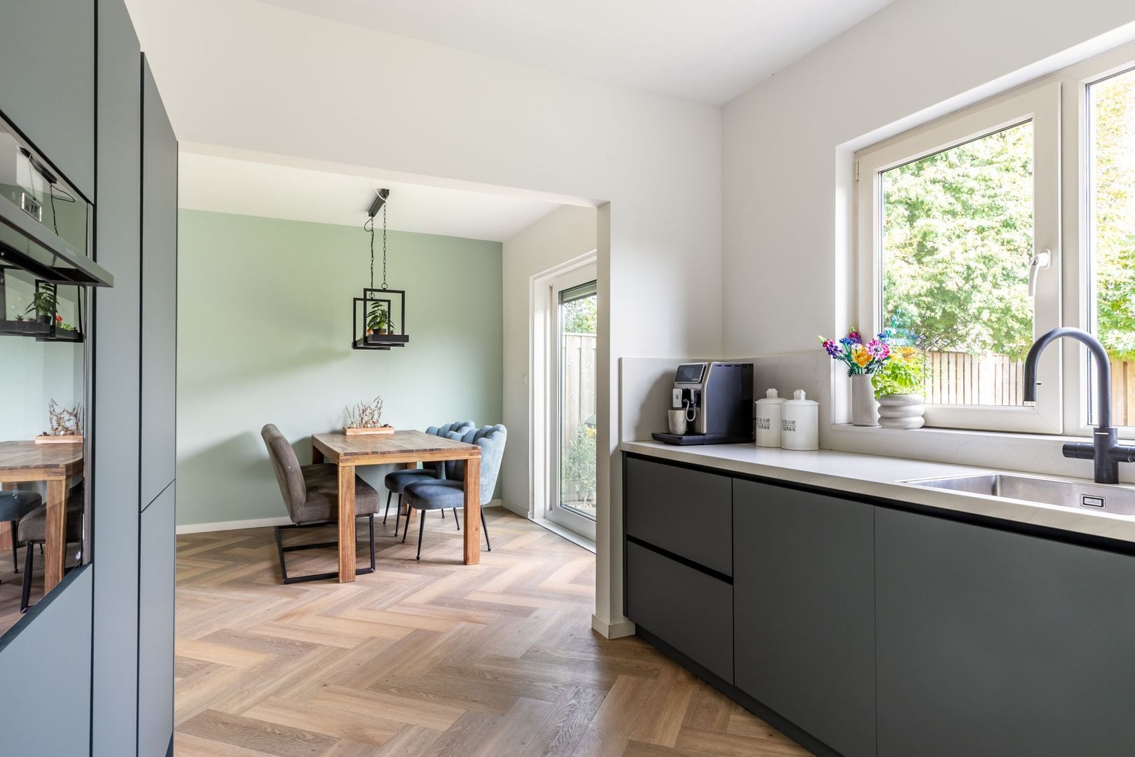 De keuken is royaal van formaat. Met een L-vormige inrichting en een wandopstelling is er genoeg bergruimte en plaats voor de hoogwaardige Neff inbouwapparatuur, zoals een vierpits kookplaat met geïntegreerde afzuigkap, vaatwasser, stoomoven, Unito kokend waterkraan en de koel-vriescombinatie. De kleurstelling, het marmerlook aanrechtblad en de greeploze deuren zijn helemaal van nu.