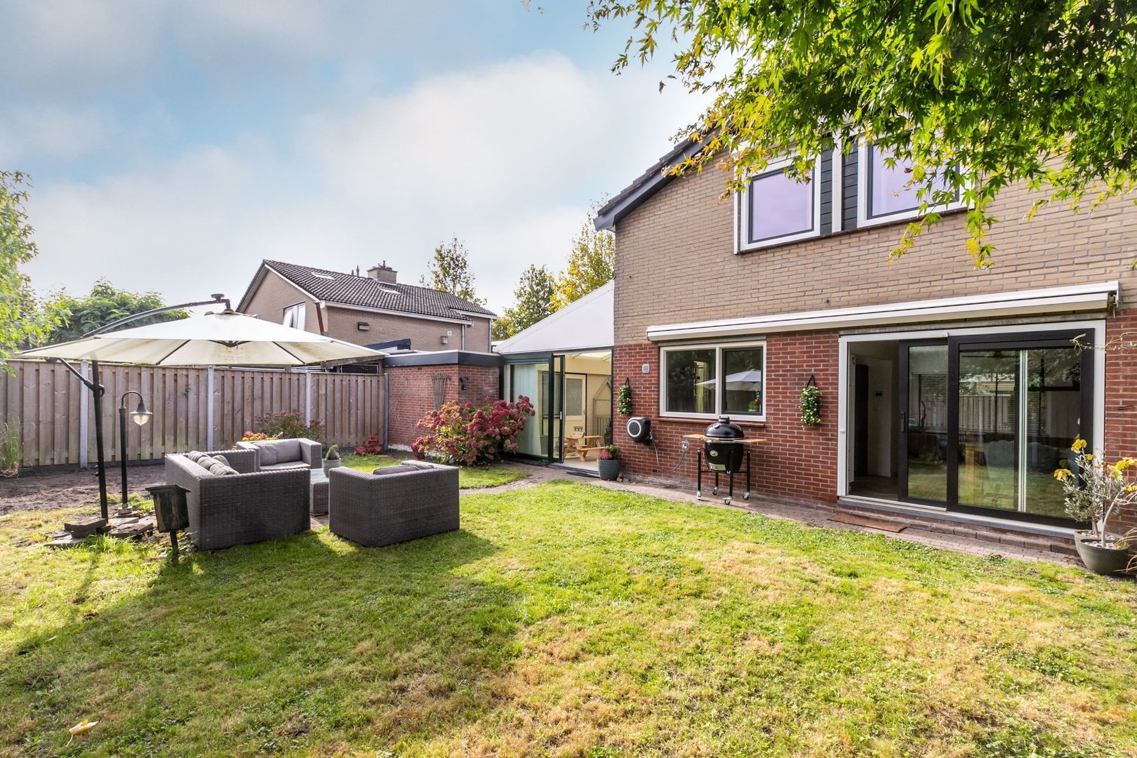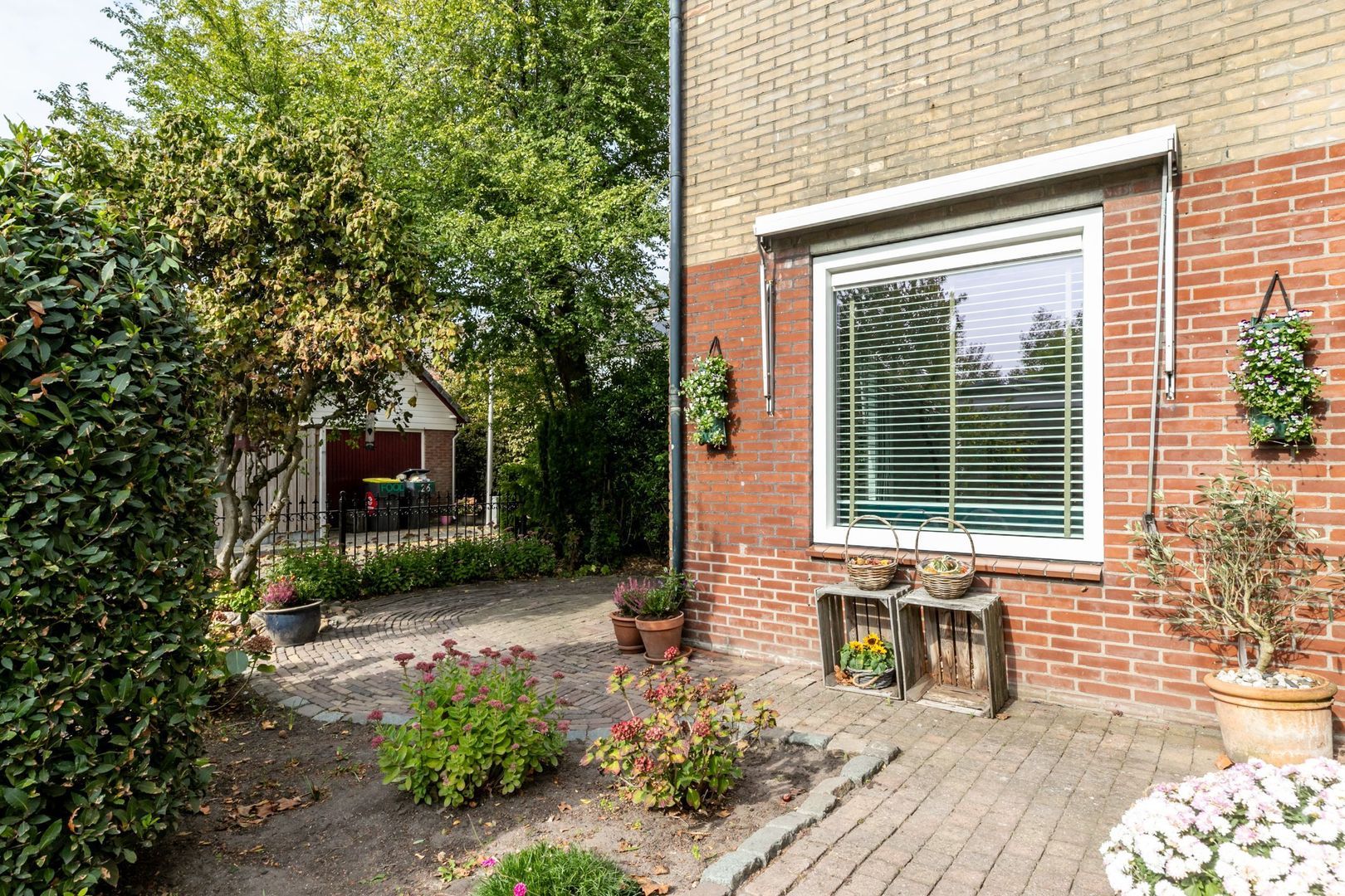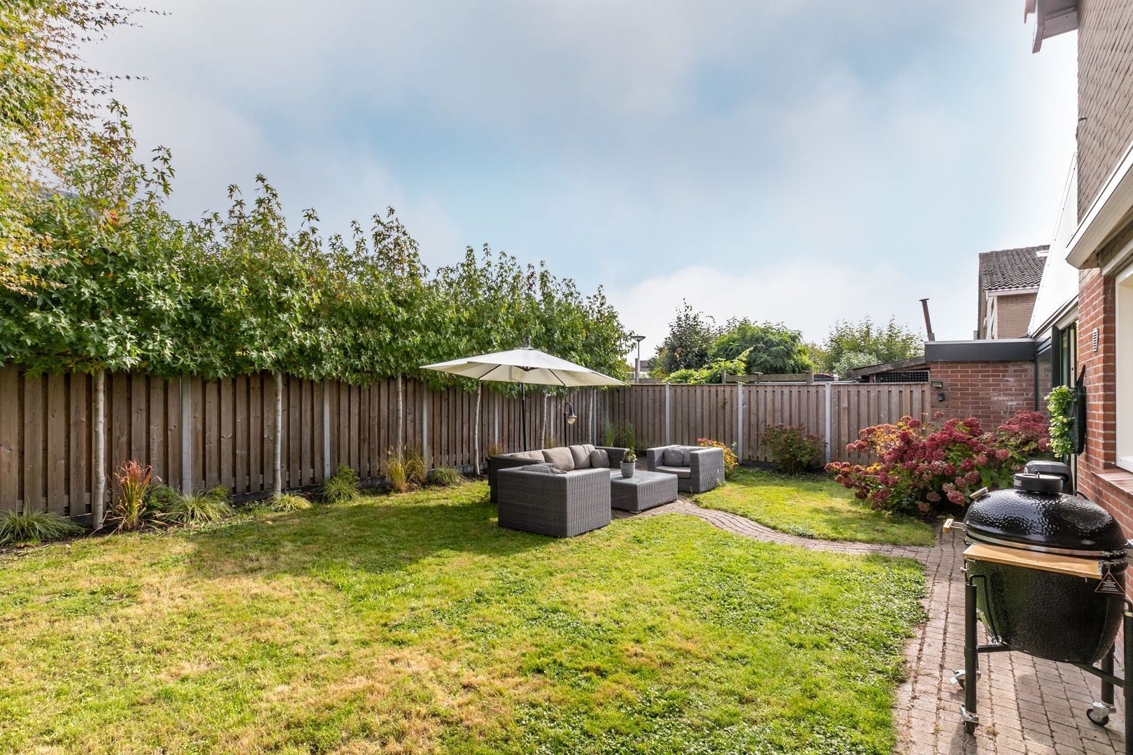 De achtertuin ligt op het oosten. Deze is maar liefst 14 meter breed en biedt dus ruimte voor volop tuinplezier.