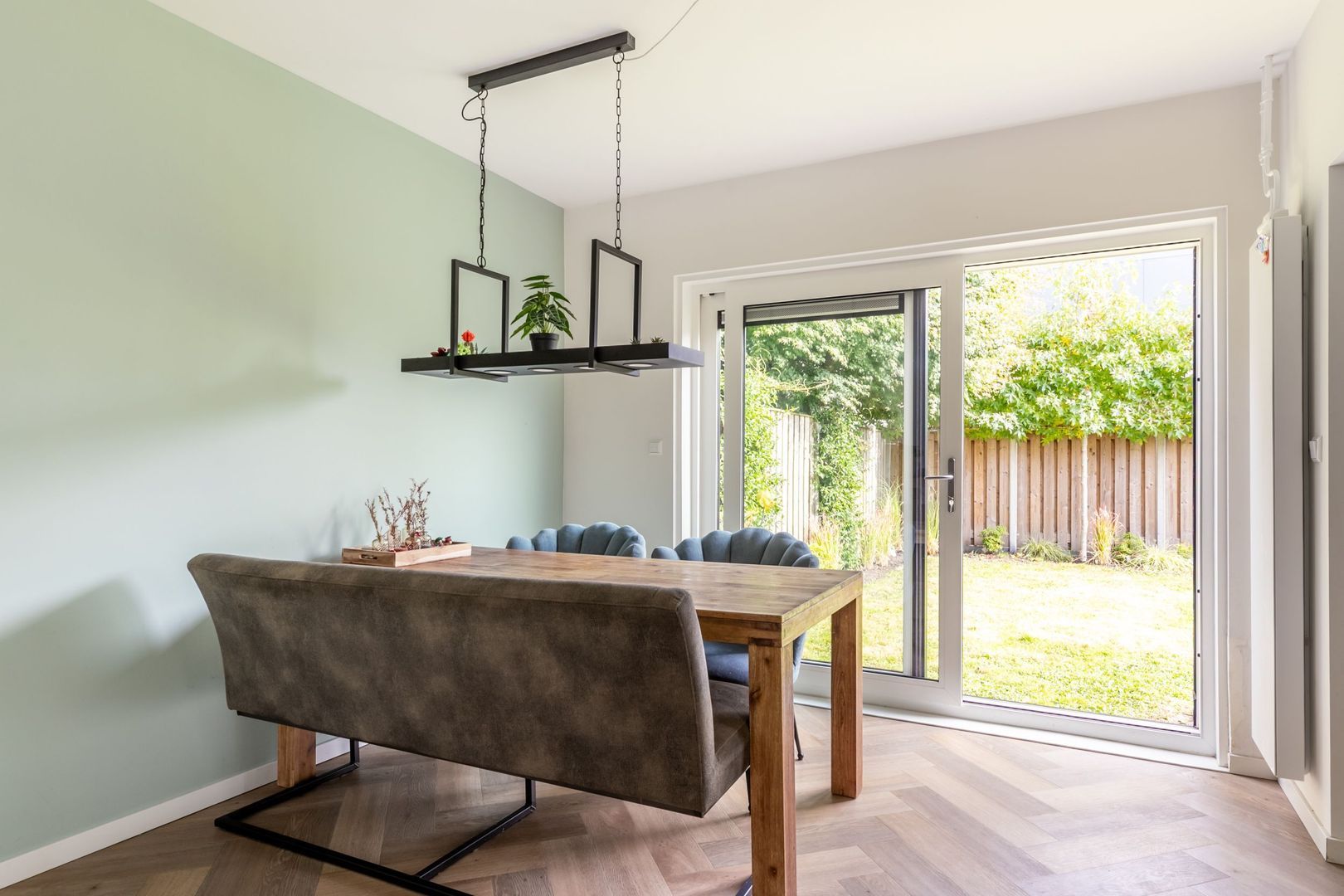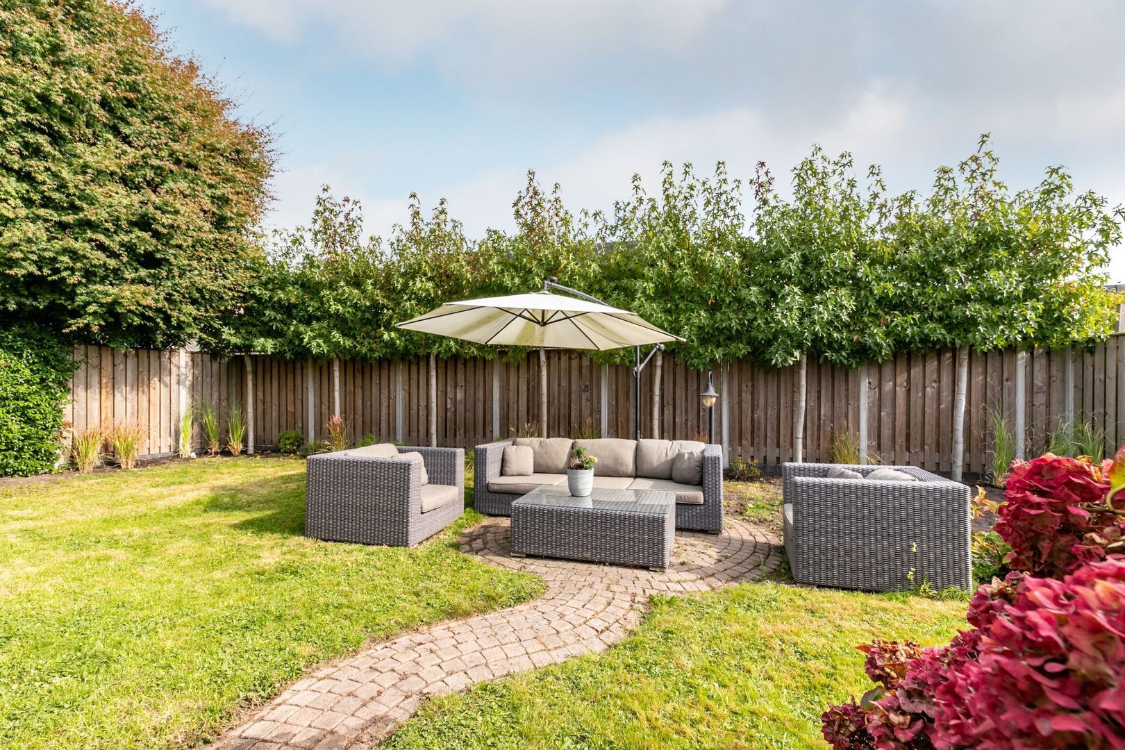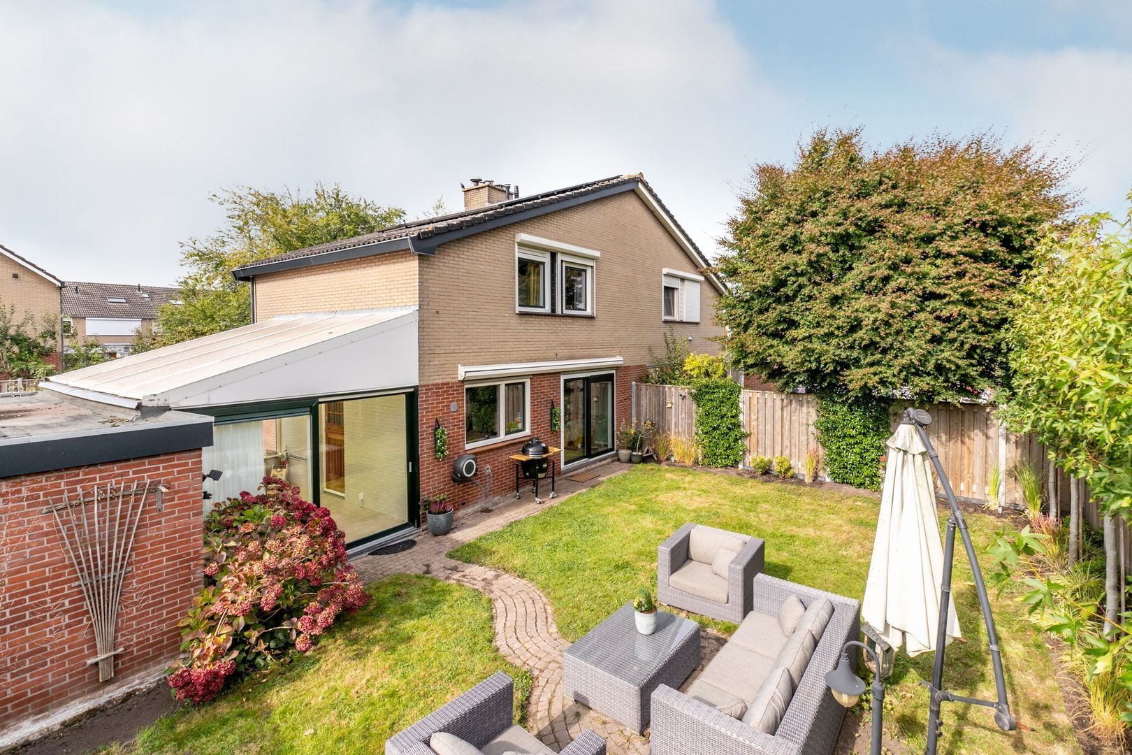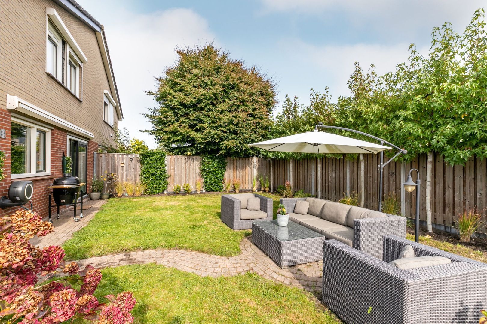 De achtertuin ligt op het oosten. Deze is maar liefst 14 meter breed en biedt dus ruimte voor volop tuinplezier.
