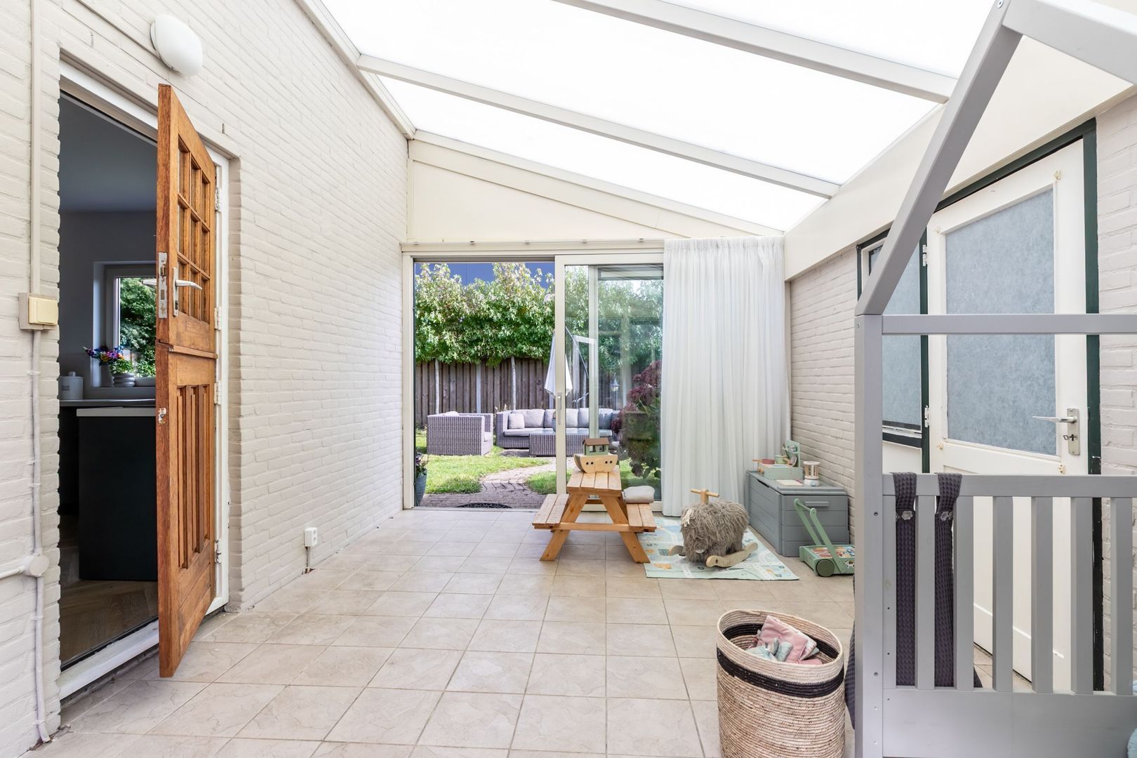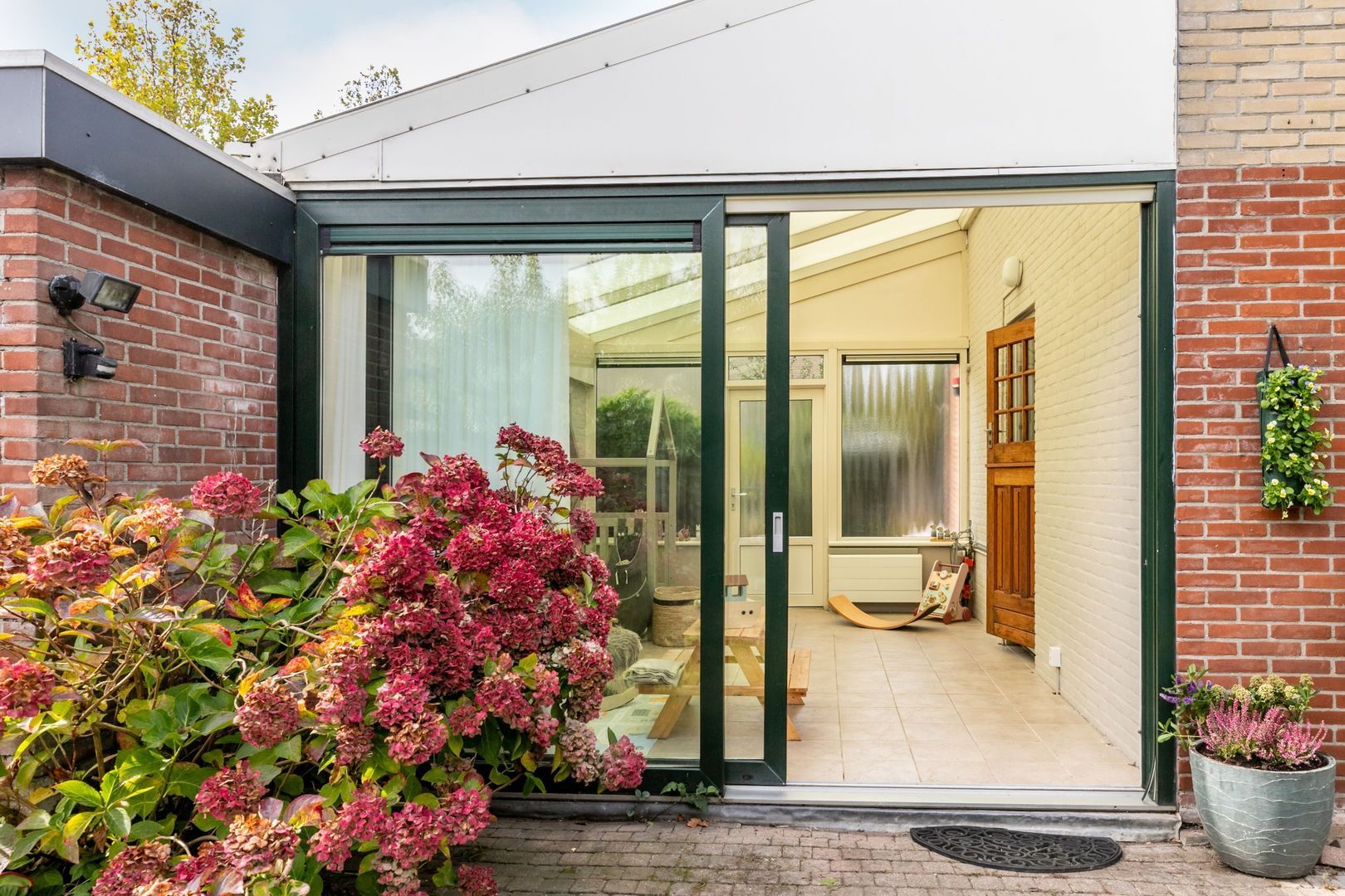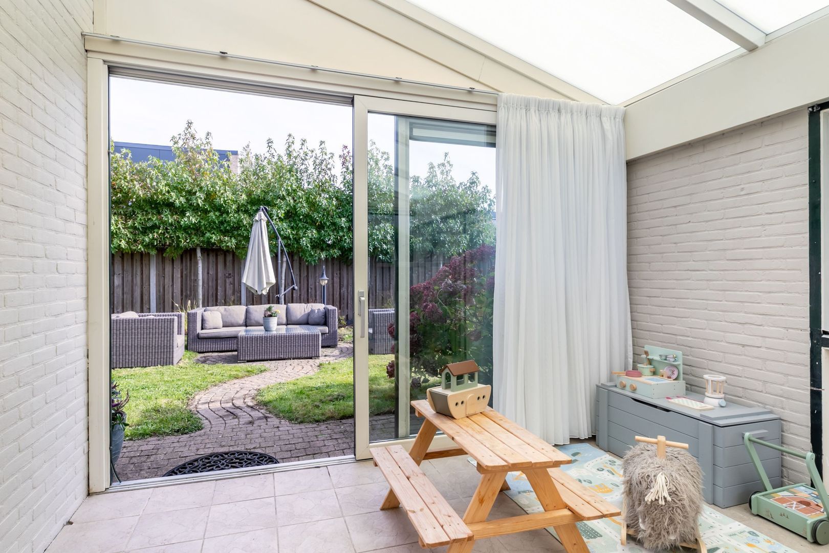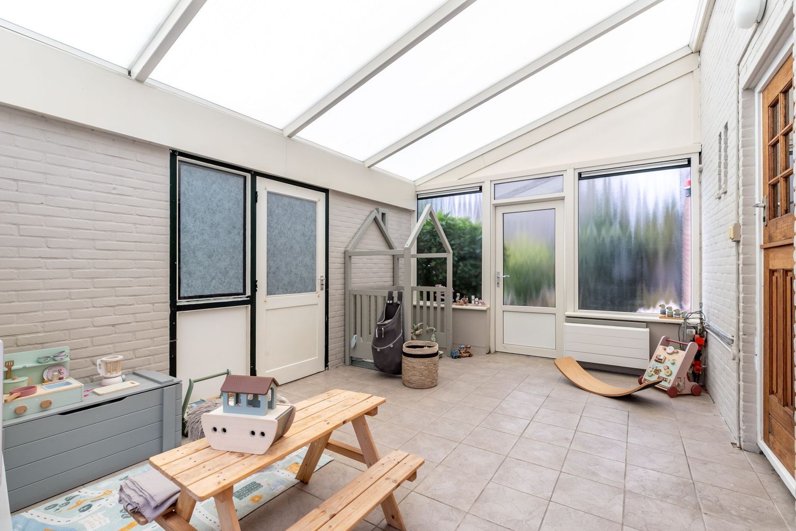 De aangebouwde serre verbindt de woning met de garage. Dit is een heerlijke plek die bijvoorbeeld kan worden gebruikt als speelkamer. Ook deze ruimte heeft een schuifpui naar de tuin. Tevens ligt hier comfortabele vloerverwarming.
