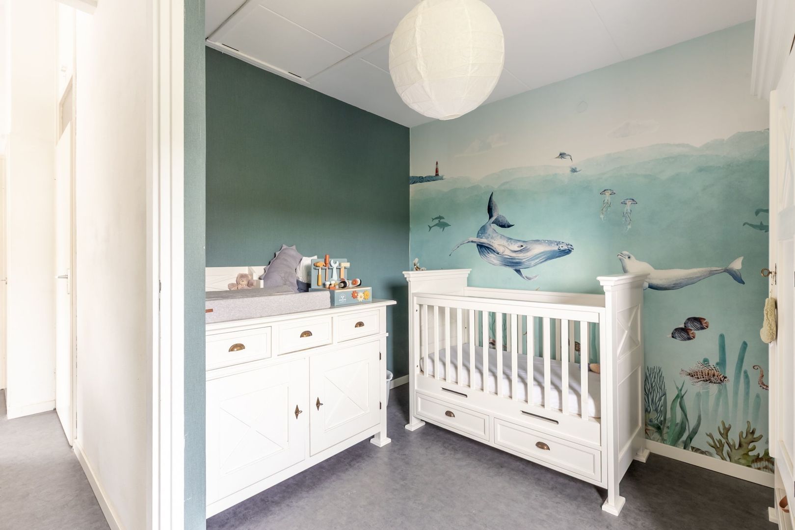 De aansluiting voor de wasmachine bevindt zich in een praktische kast op de overloop.