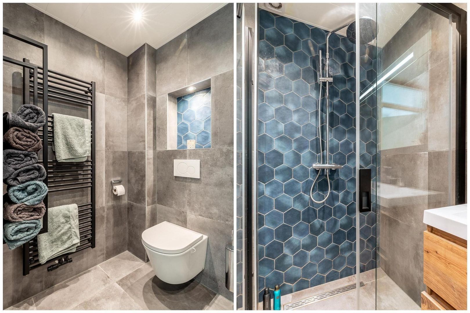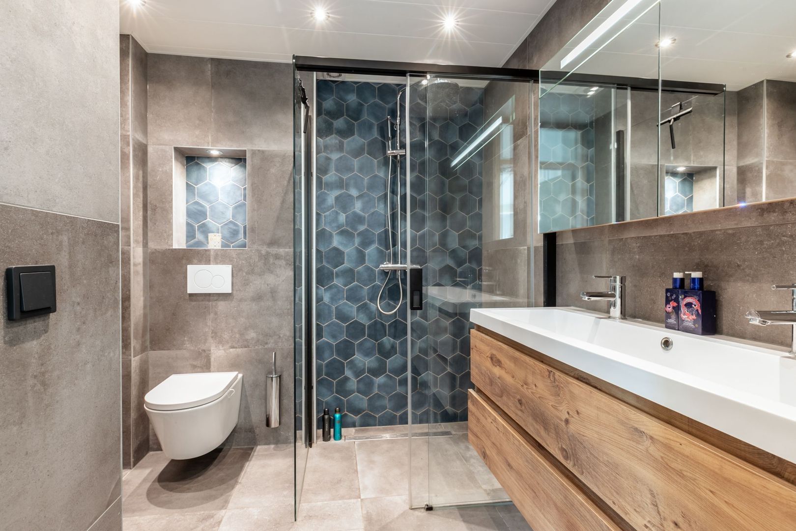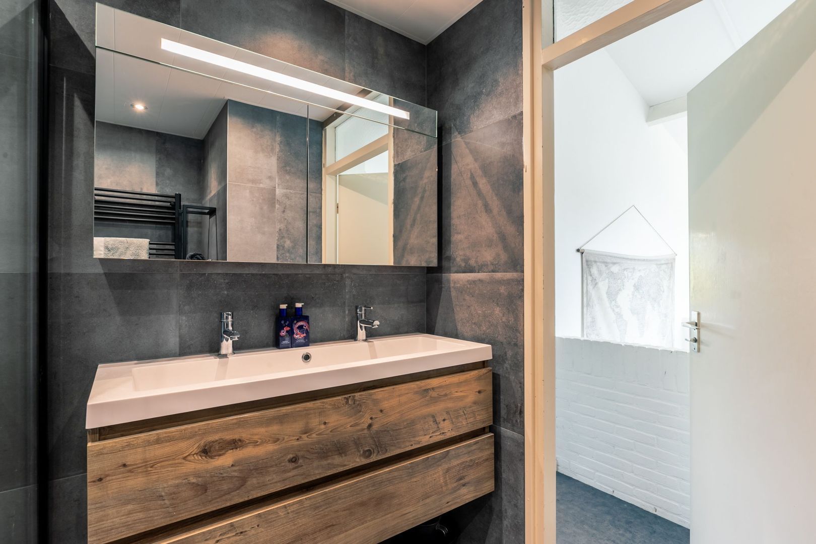 De badkamer is een plaatje; de ruime inloopdouche met een fraai betegelde achterwand, een tweede toilet en een groot wastafelmeubel met dubbele kranen en een spiegelkast zijn in 2023 gerealiseerd.