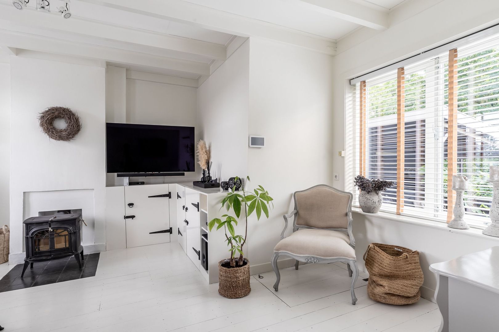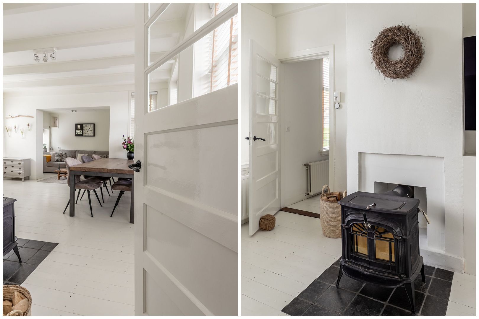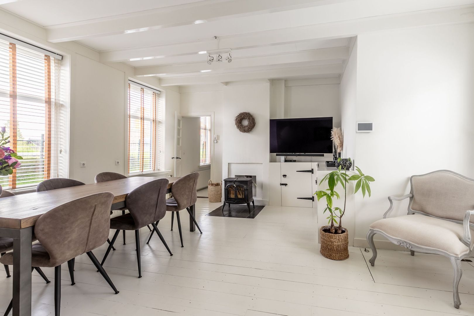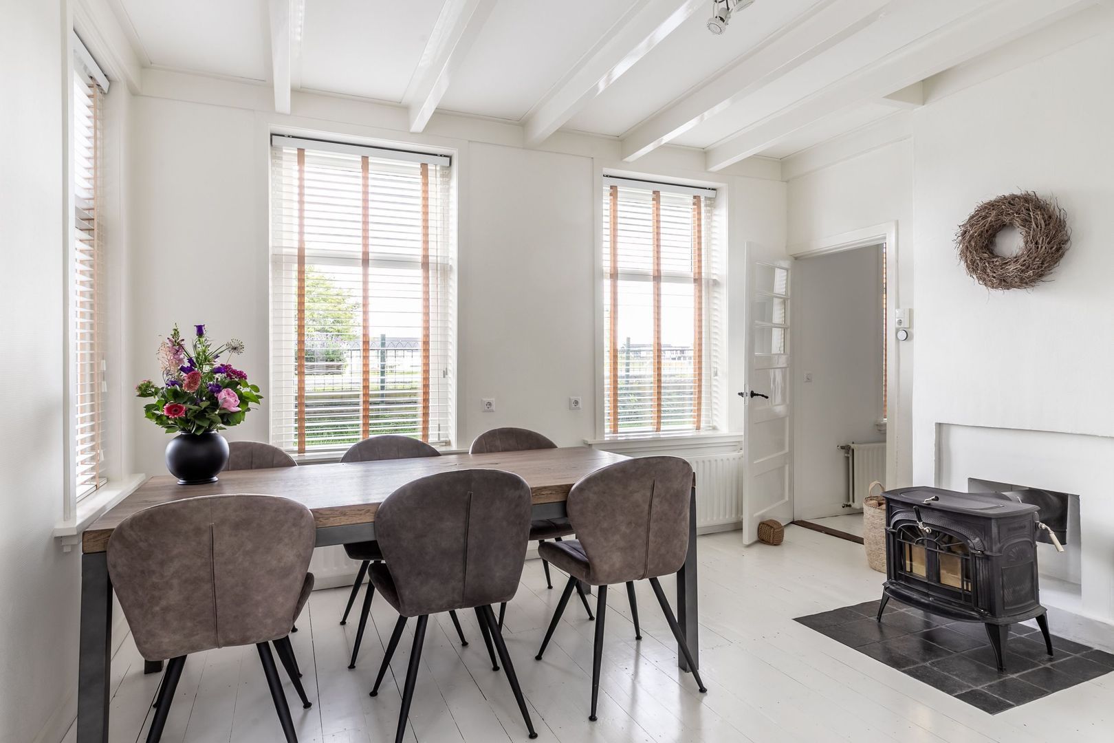 De gezellige woonkamer -met houtkachel- is mooi licht en strak afgewerkt en biedt een leuk uitzicht op zowel de tuin als de dijk. De houtkachel zorgt voor extra sfeer en comfortabele warmte.