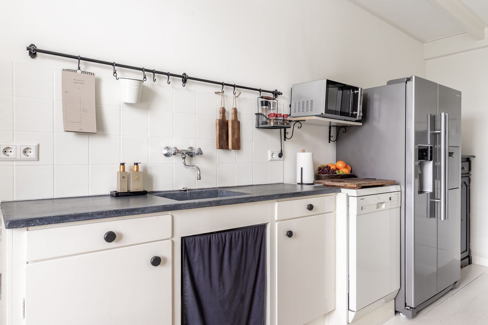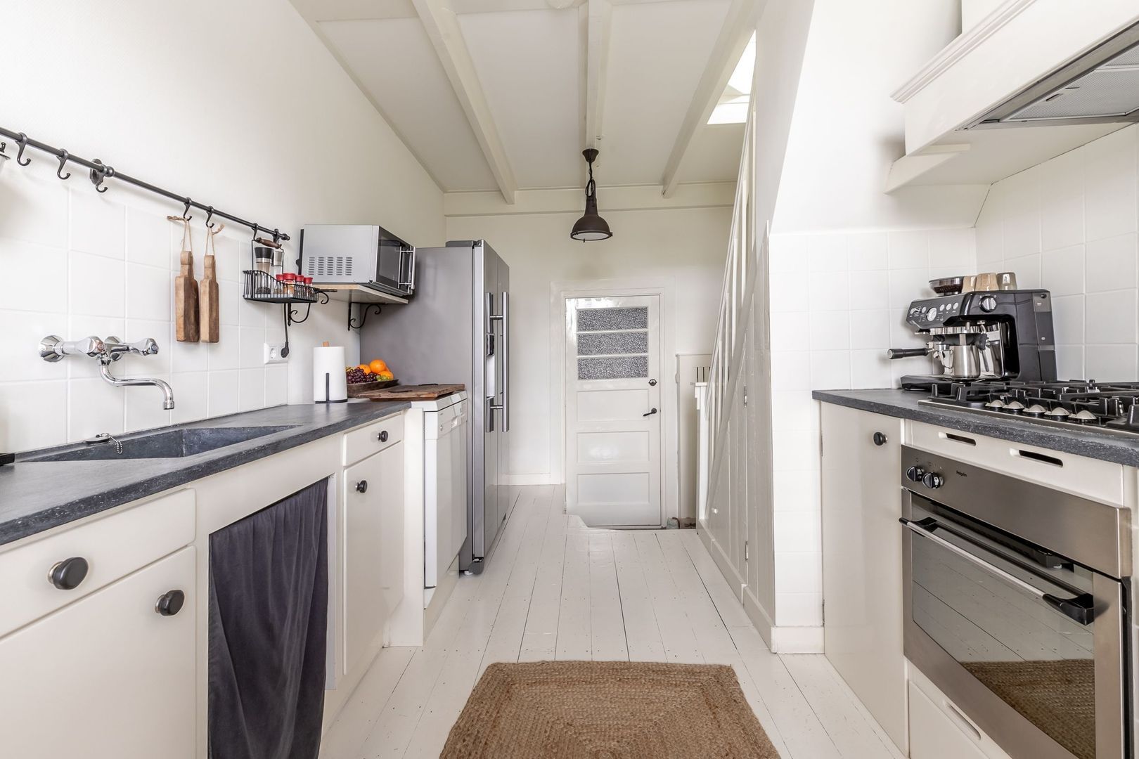 De keuken is ingericht met een dubbelzijdige wandopstelling. Uitgevoerd in wit met granito aanrechtblad, inbouwapparatuur en een vaatwasser. De Amerikaanse koelkast kan worden overgenomen.