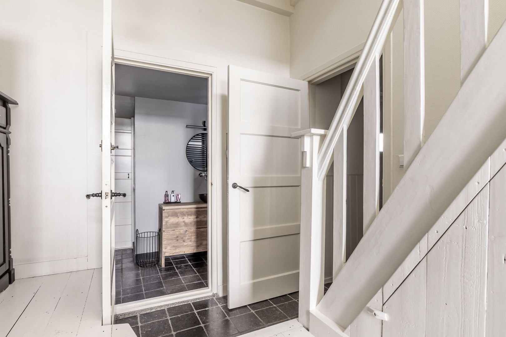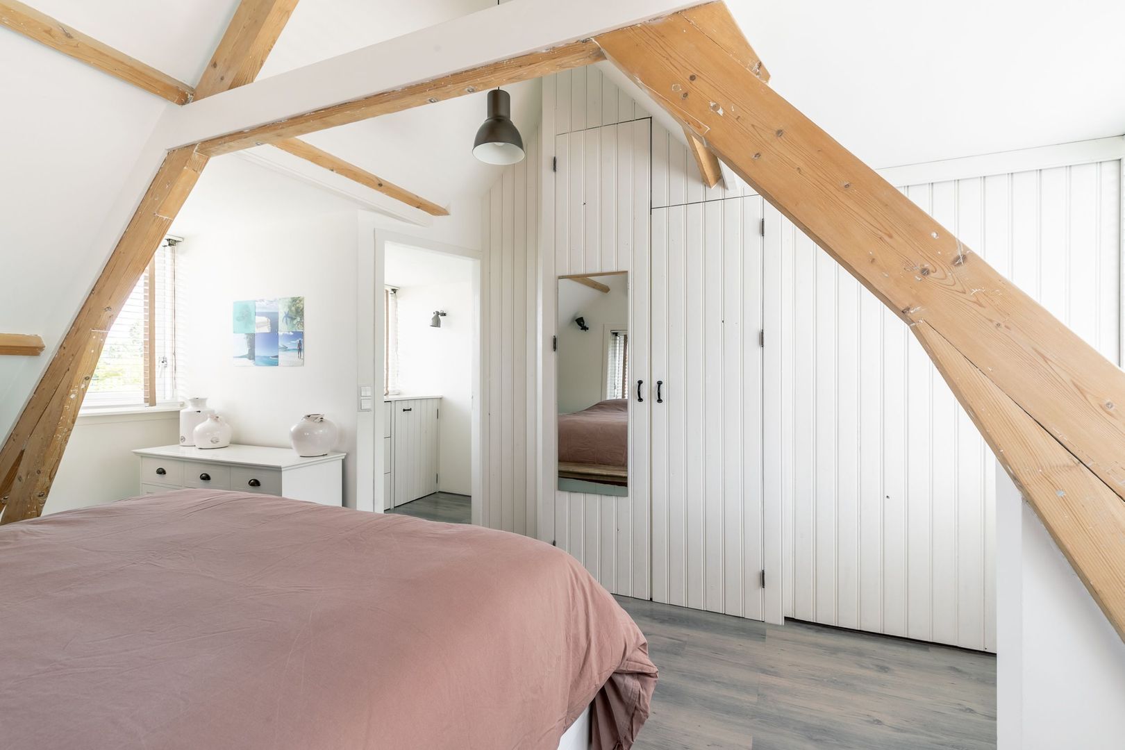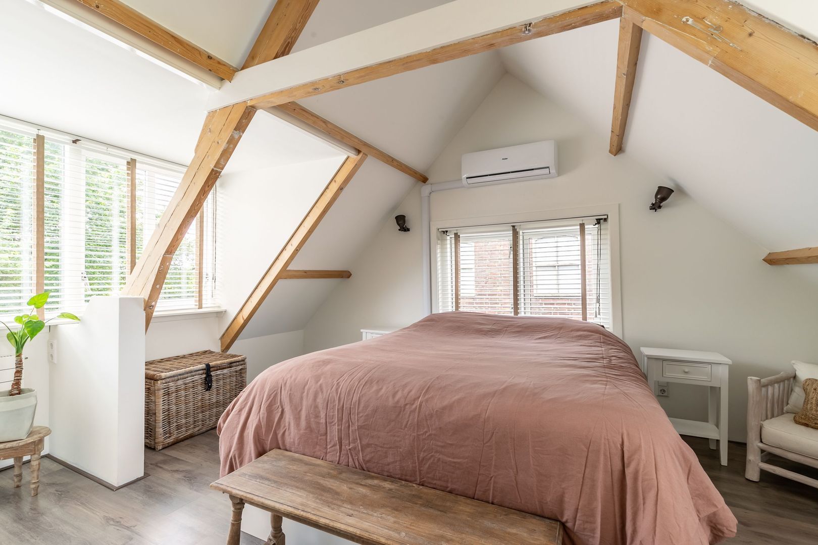 Op de grootste slaapkamer (met airco) is de originele spantconstructie zichtbaar gemaakt, wat de kamer een extra dimensie geeft. De vaste kasten zijn in een bij de woning passende stijl gemaakt.