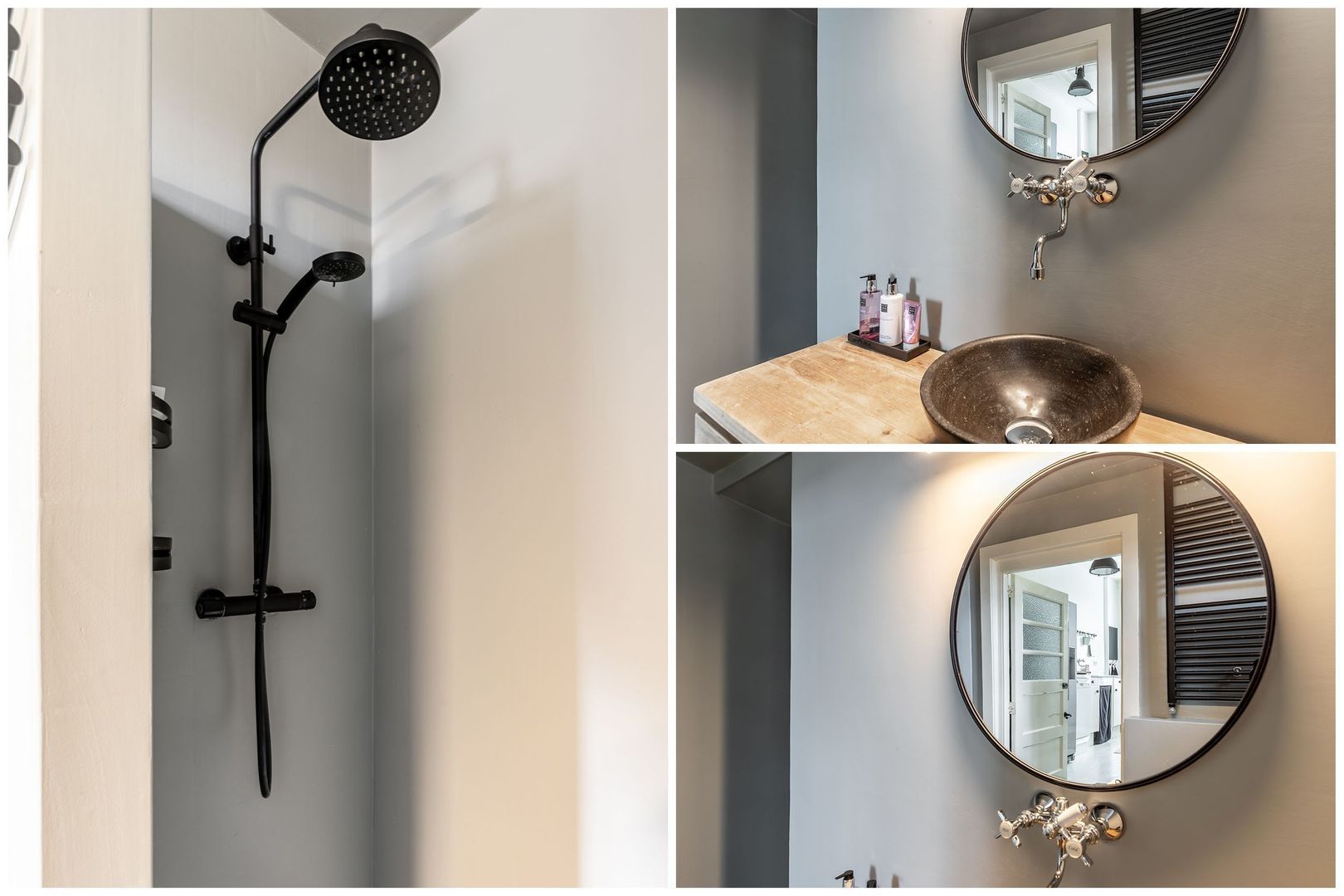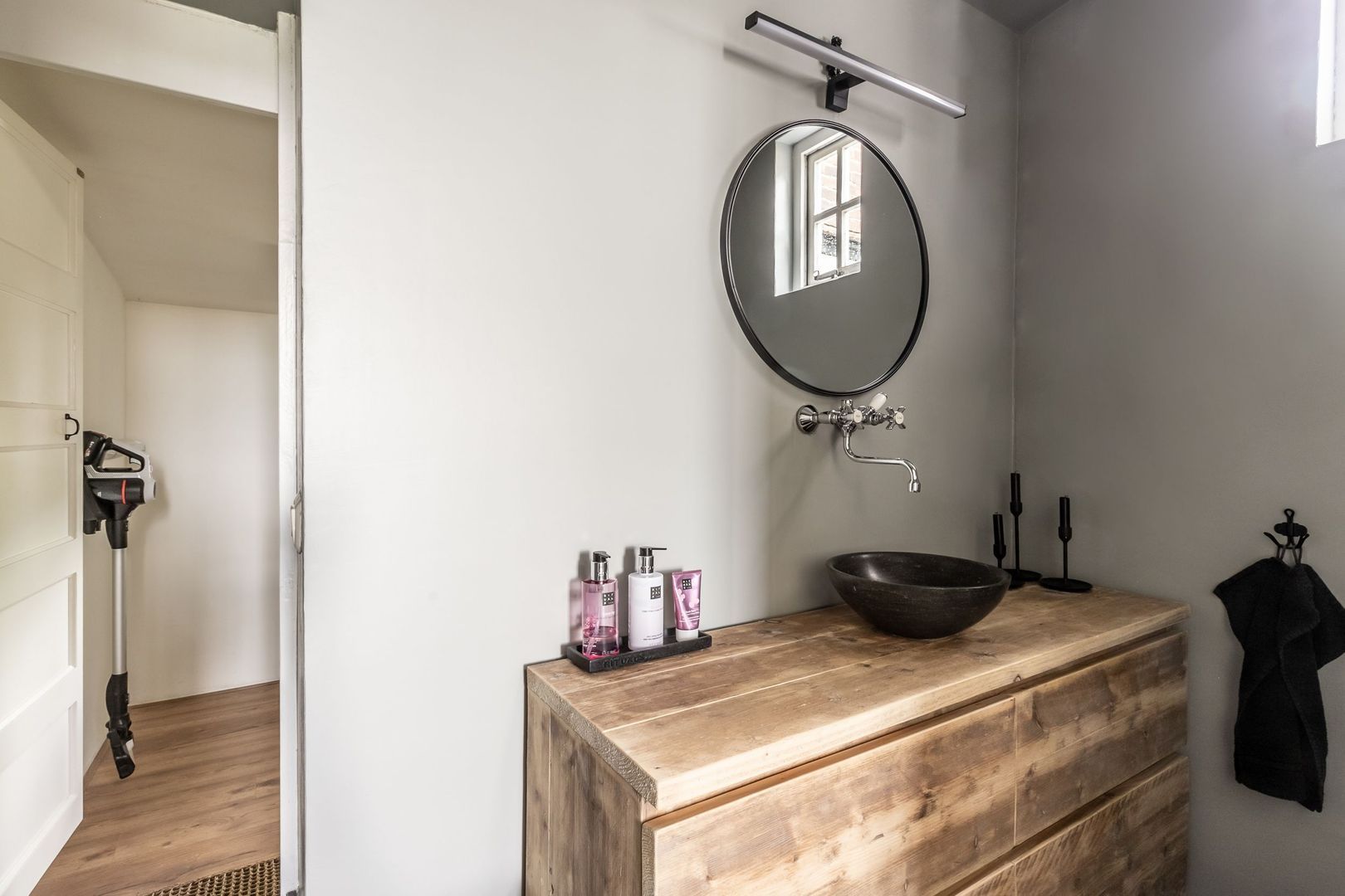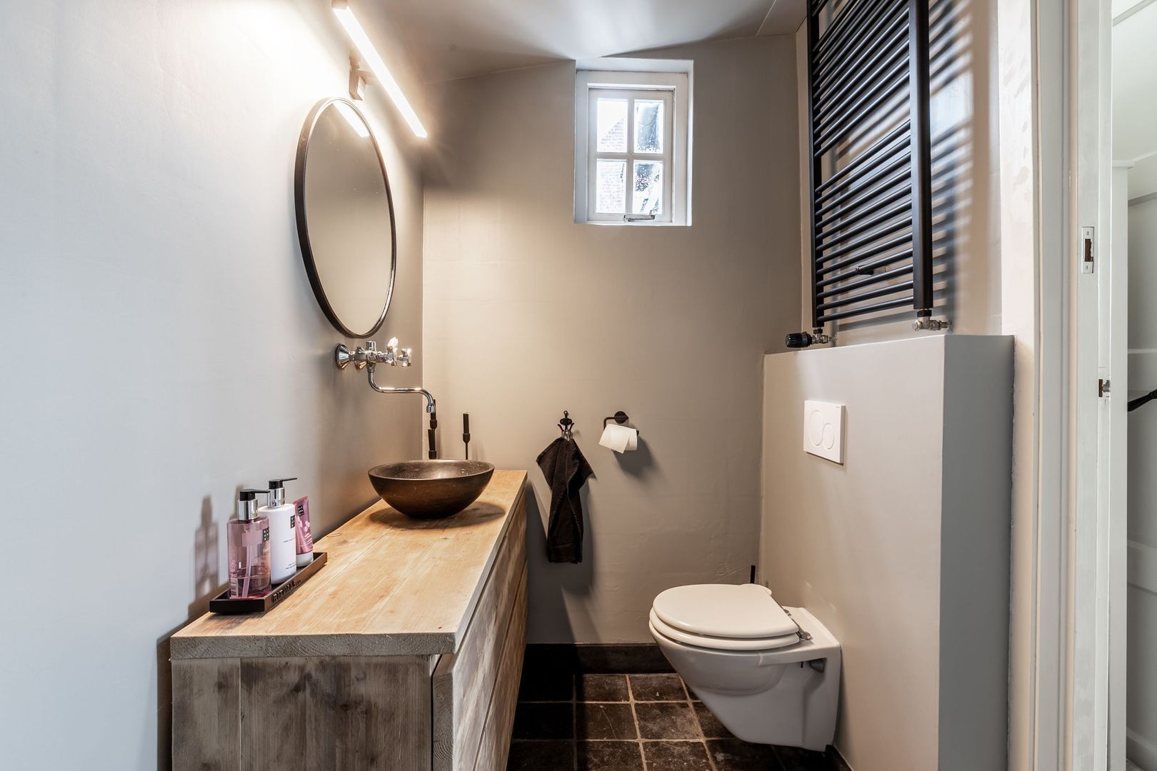 De badkamer is voorzien van mooi strak stucwerk en biedt plaats aan een heerlijke inloopdouche, een stoer badmeubel met waskom en een toilet.