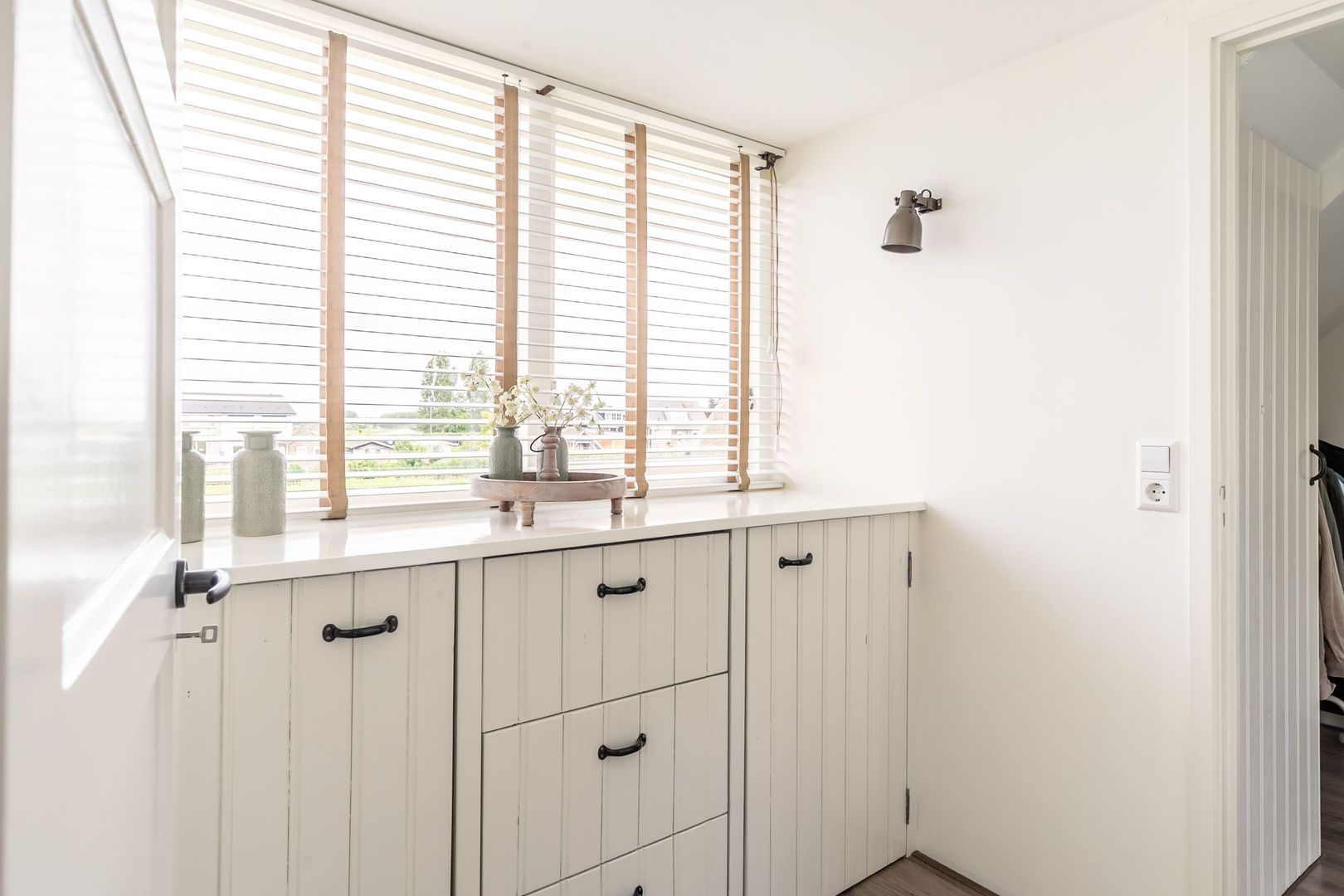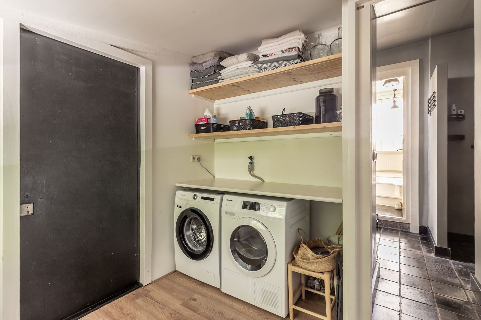 De aanbouw (voormalige berging) is verbouwd tot een praktische wasruimte, waarin een infrarood paneel zorgt voor de nodige verwarming.