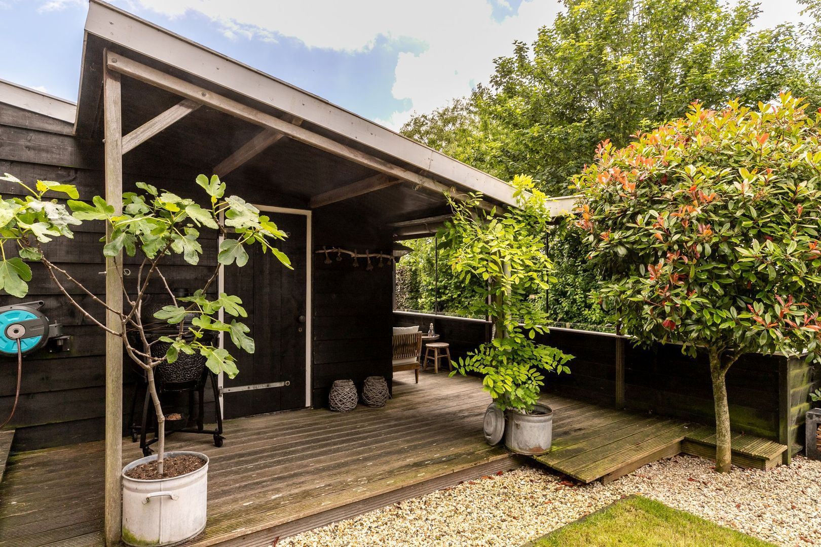 Een ruime overkapping met plaats voor veel vrienden of familie, maakt het geheel compleet.