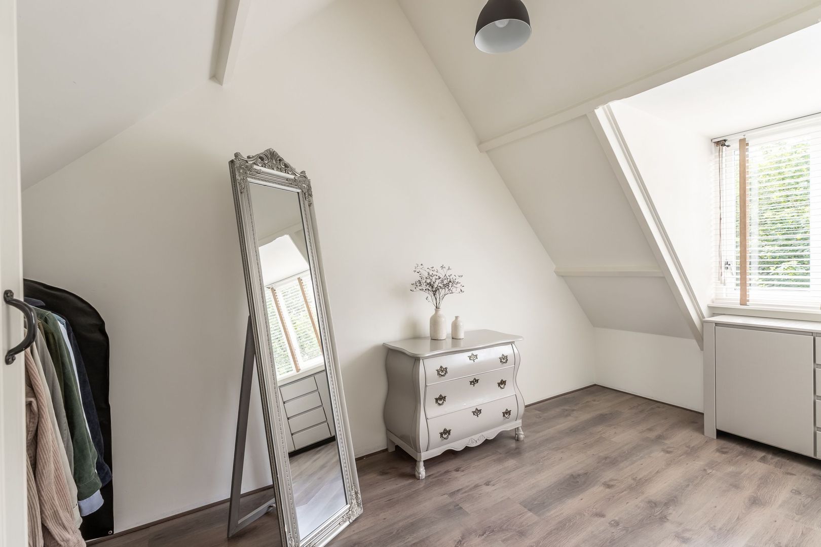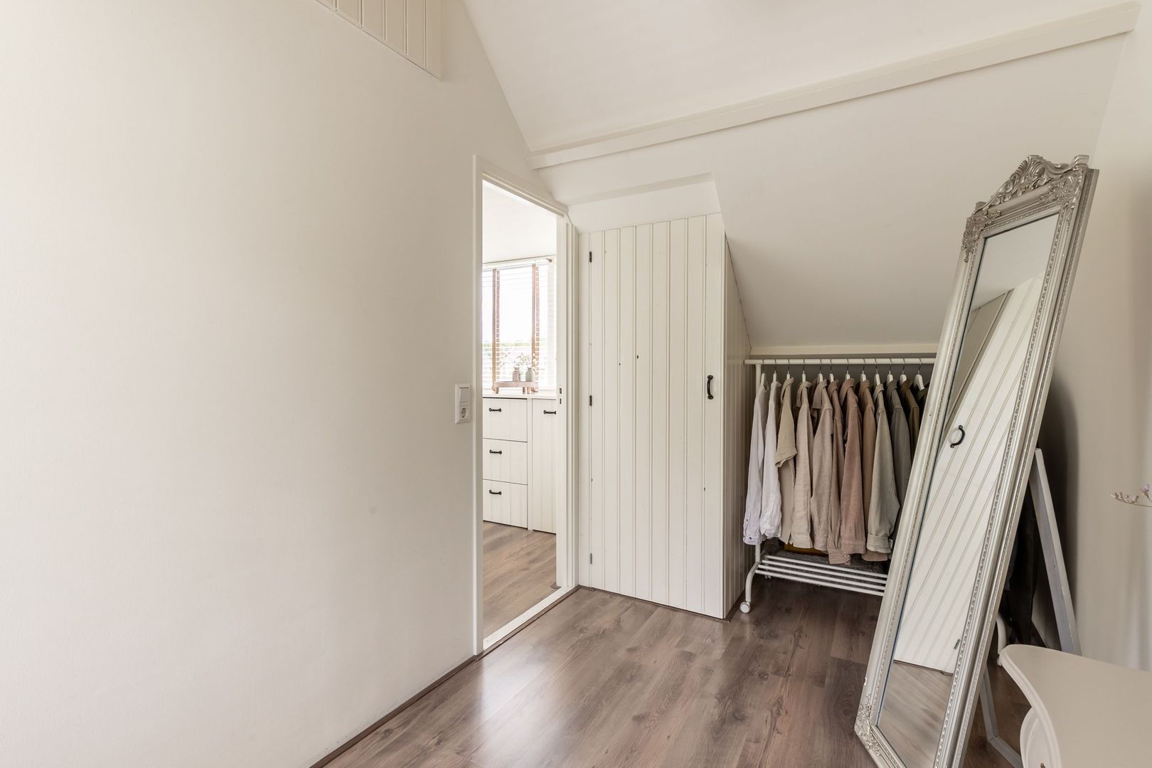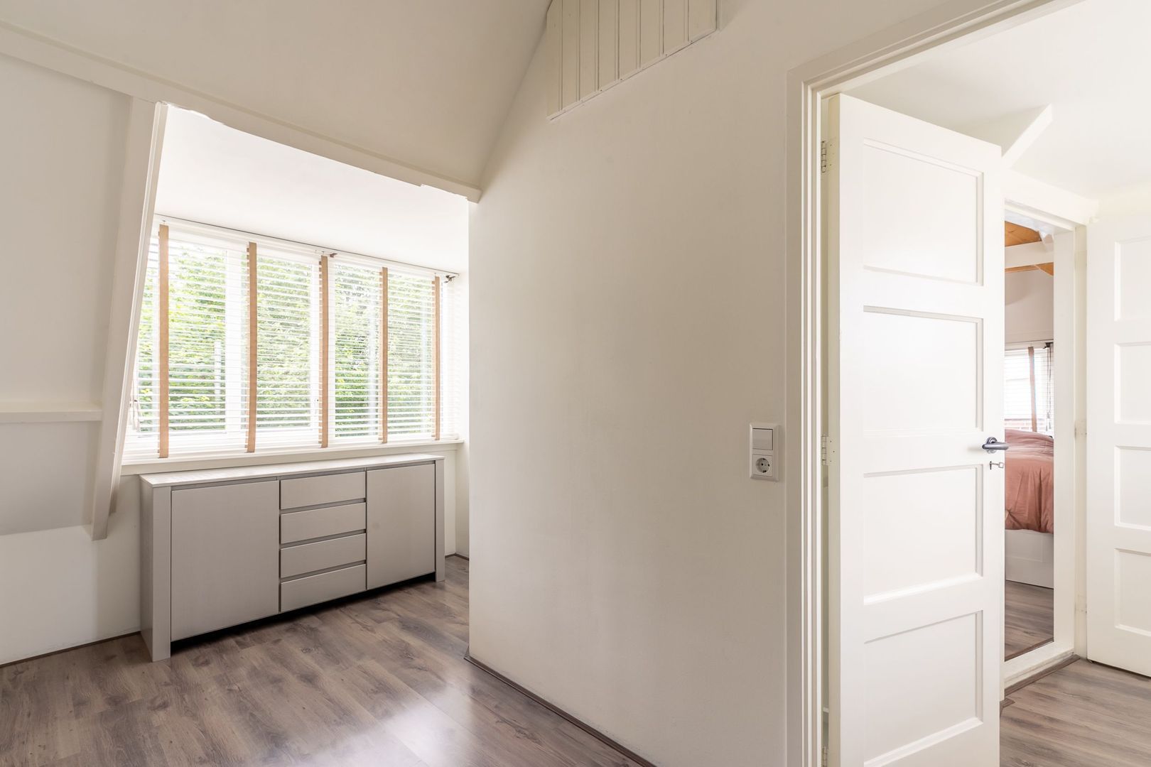 De vloer is afgewerkt met laminaat en de wanden zijn strak gestuct.