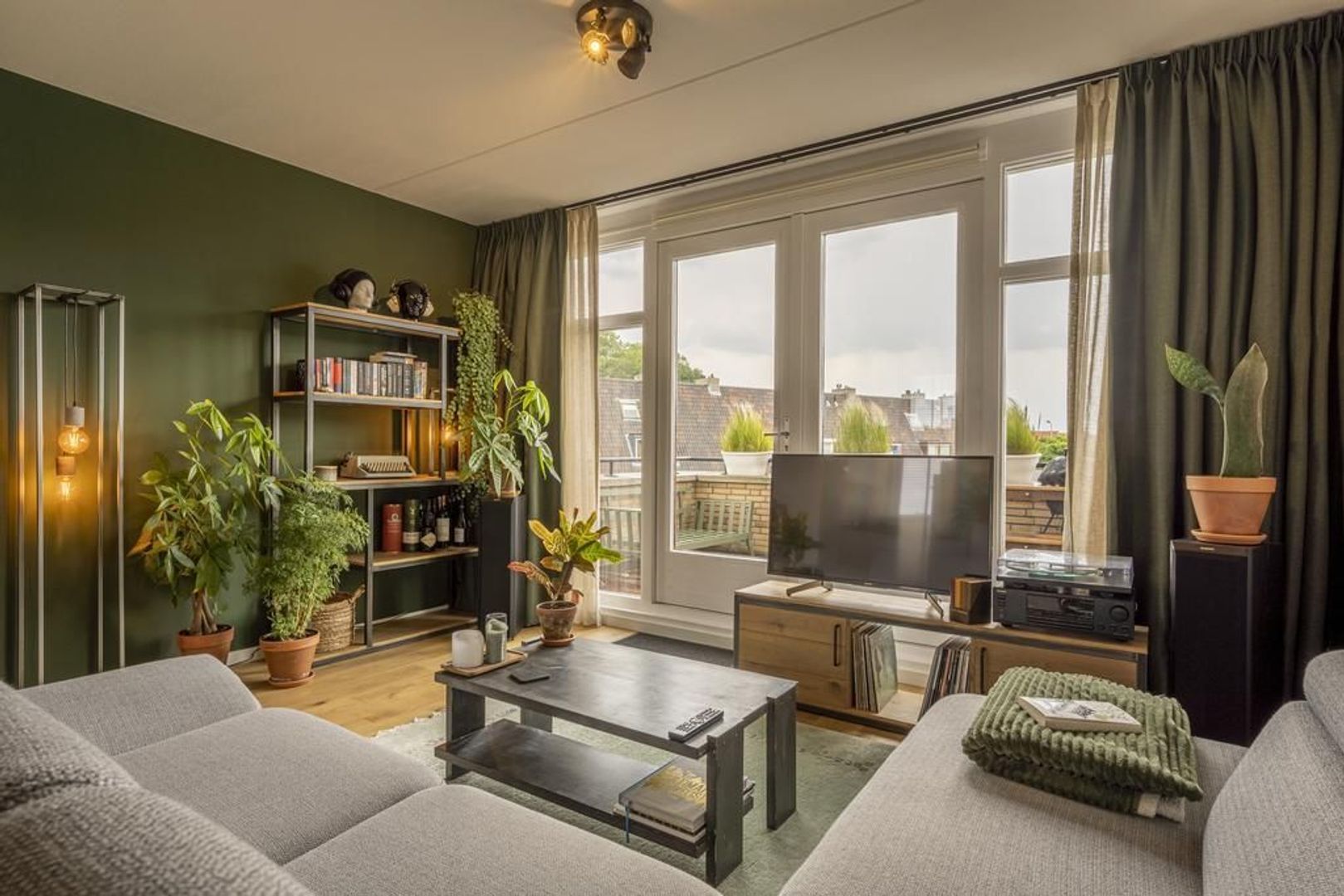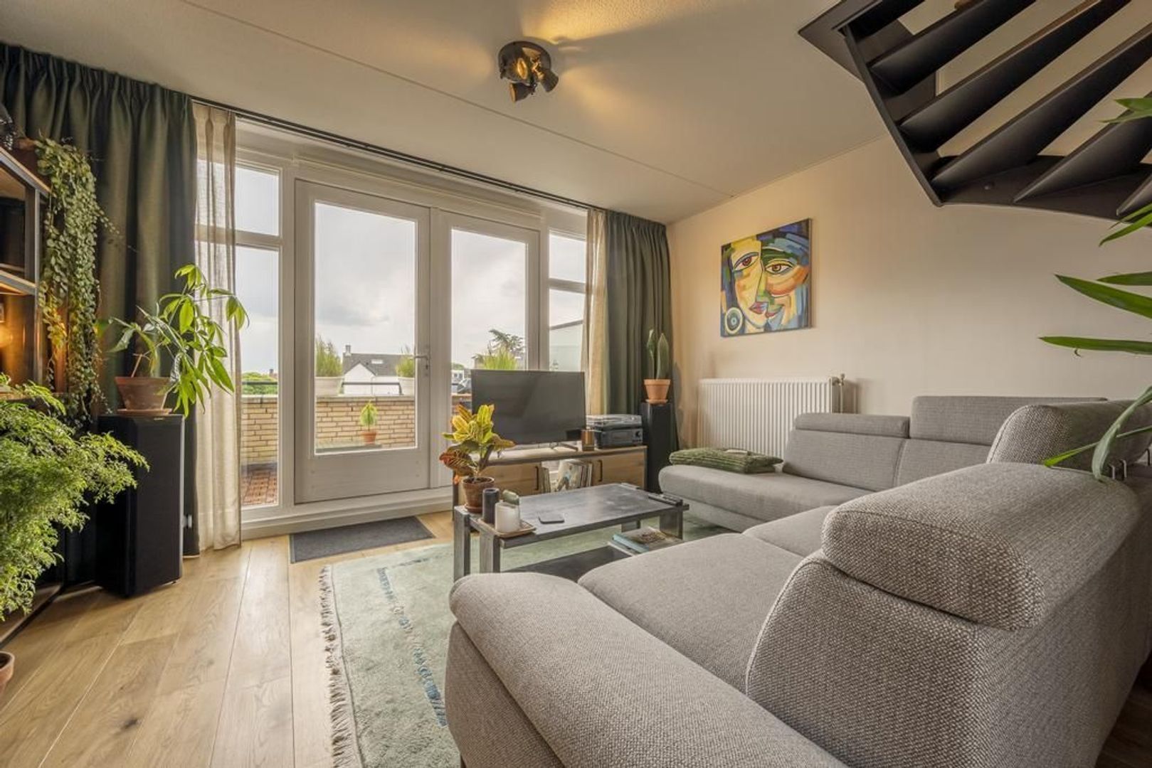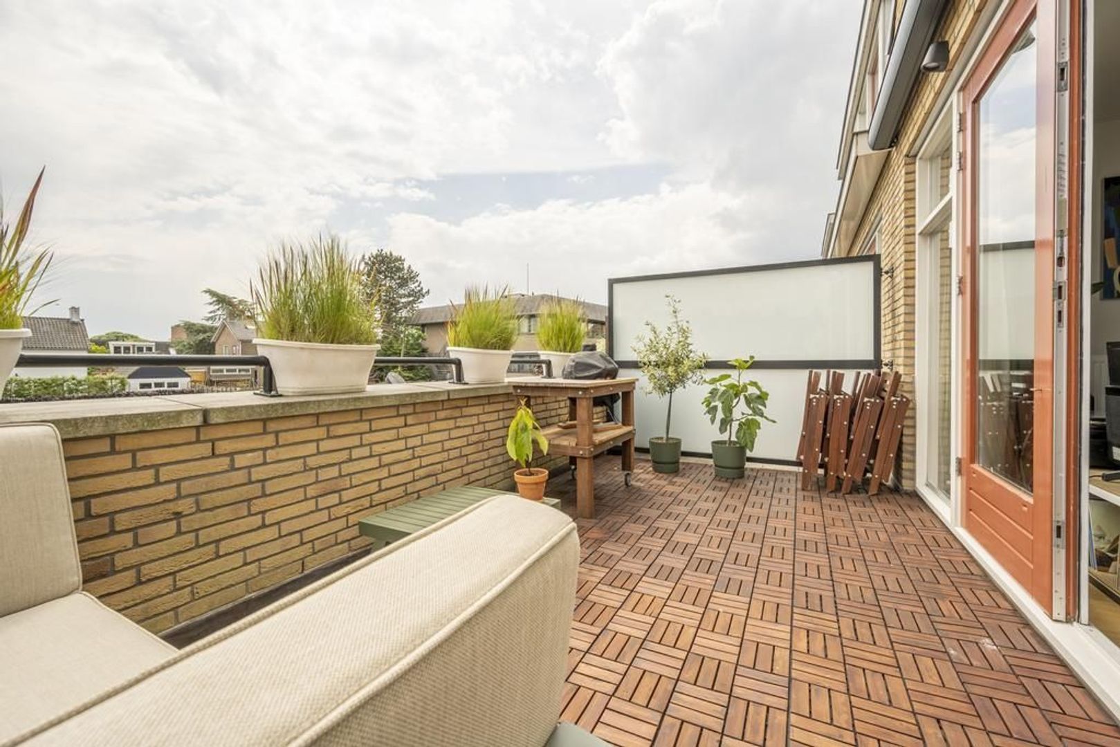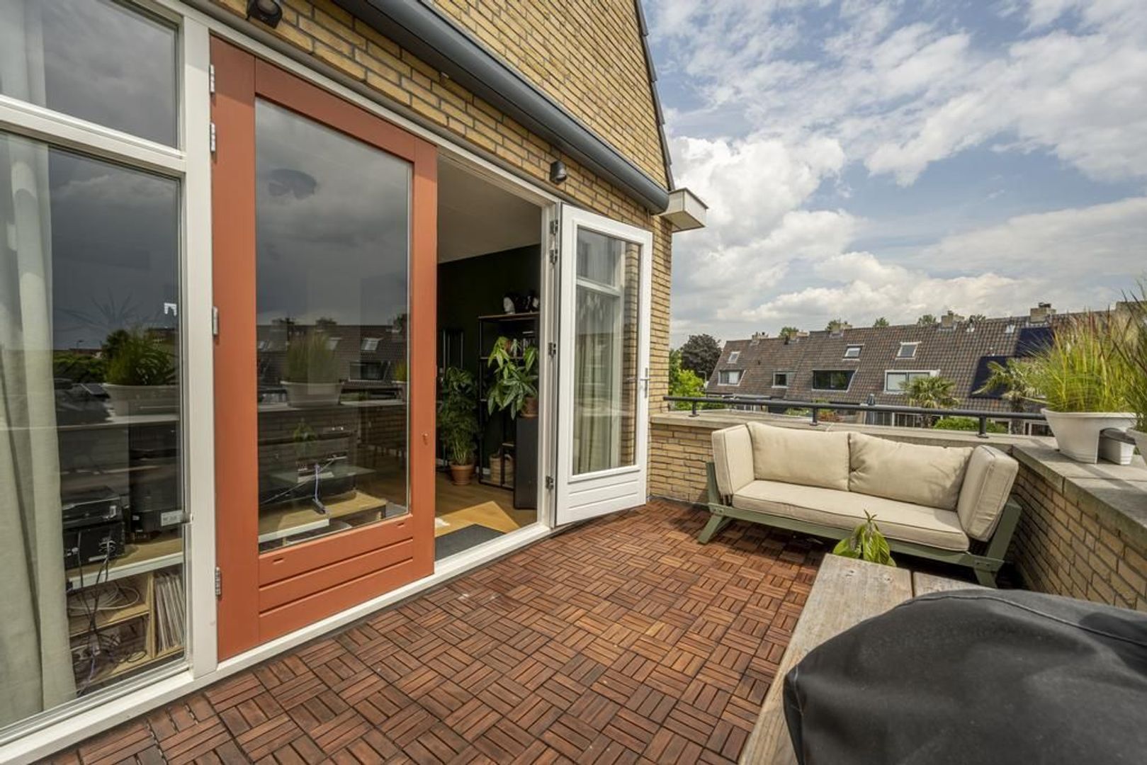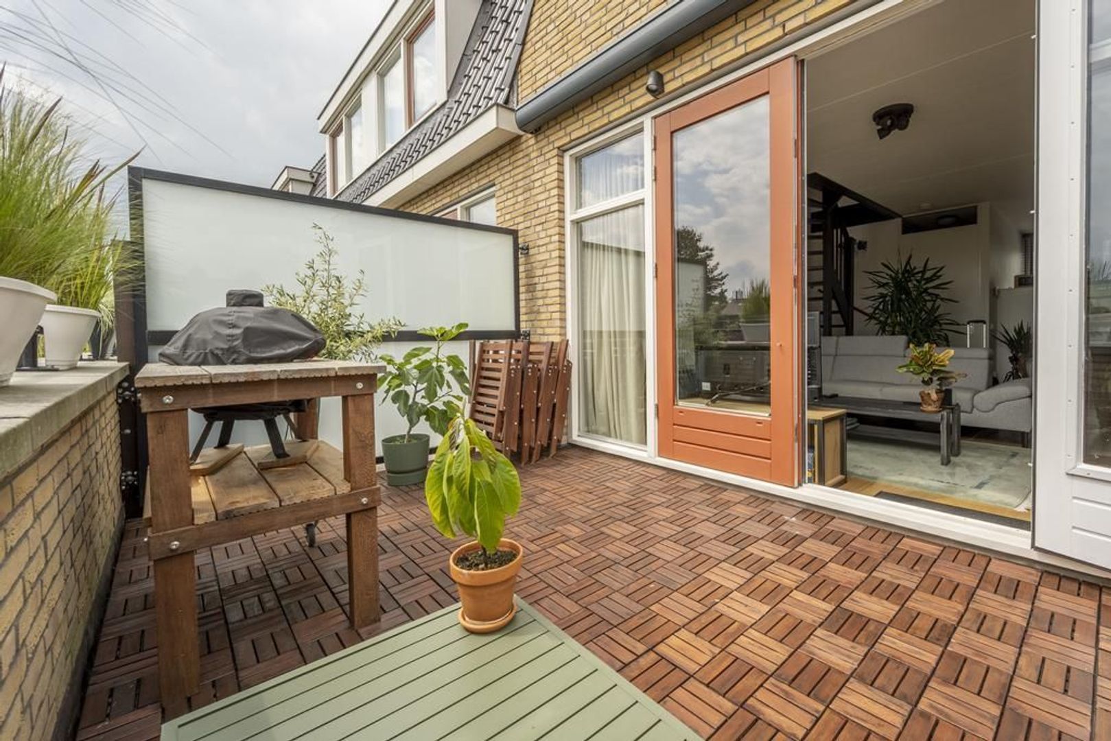 Woonkamer met openslaande deuren naar het terras. Dit is ongeveer 12 m² groot en biedt voldoende ruimte om met meerdere personen te zitten. Aan de gevel is een elektrisch zonnescherm aangebracht.