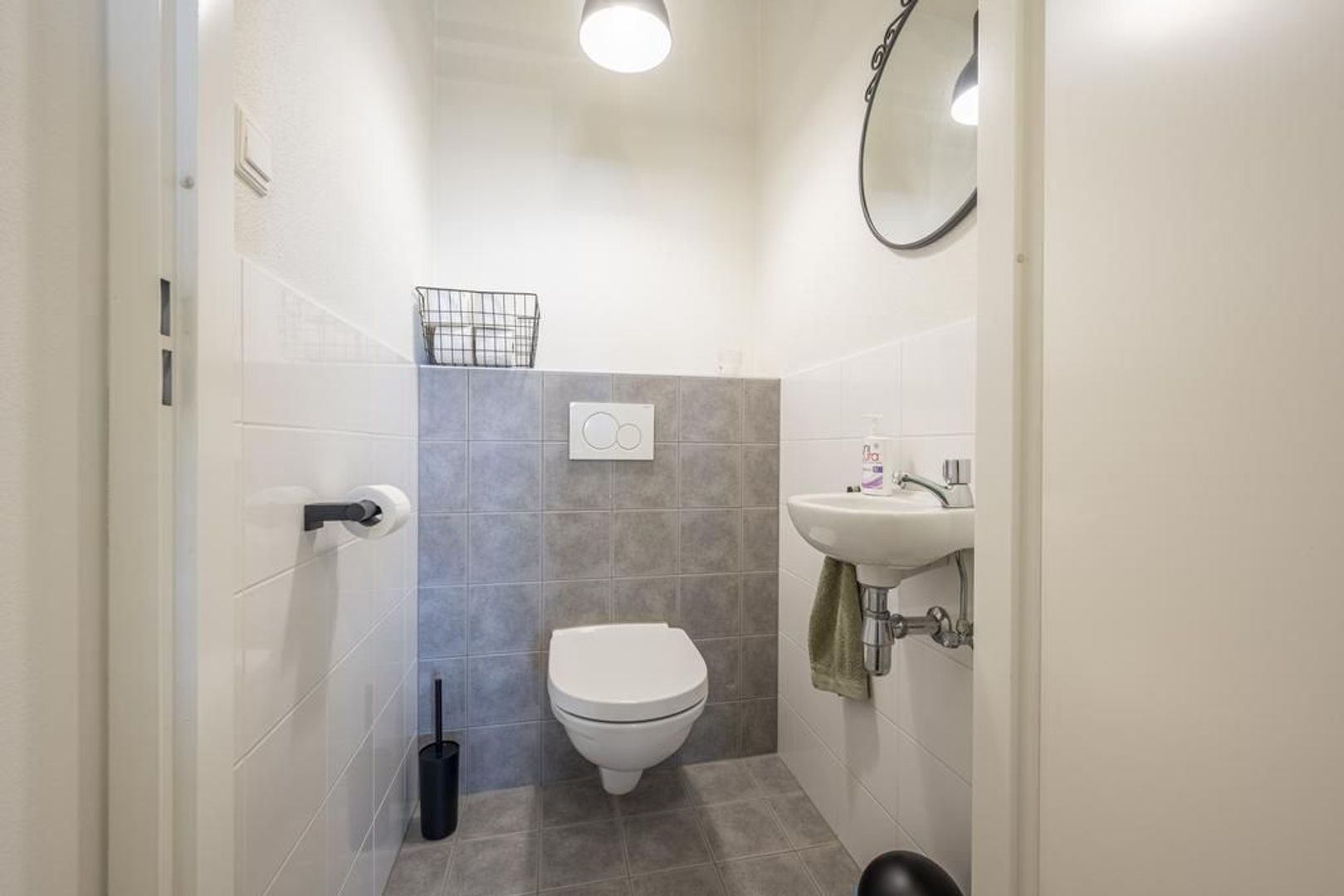 Eerste verdieping: hal met garderobe en toiletruimte met wandcloset en fonteintje.