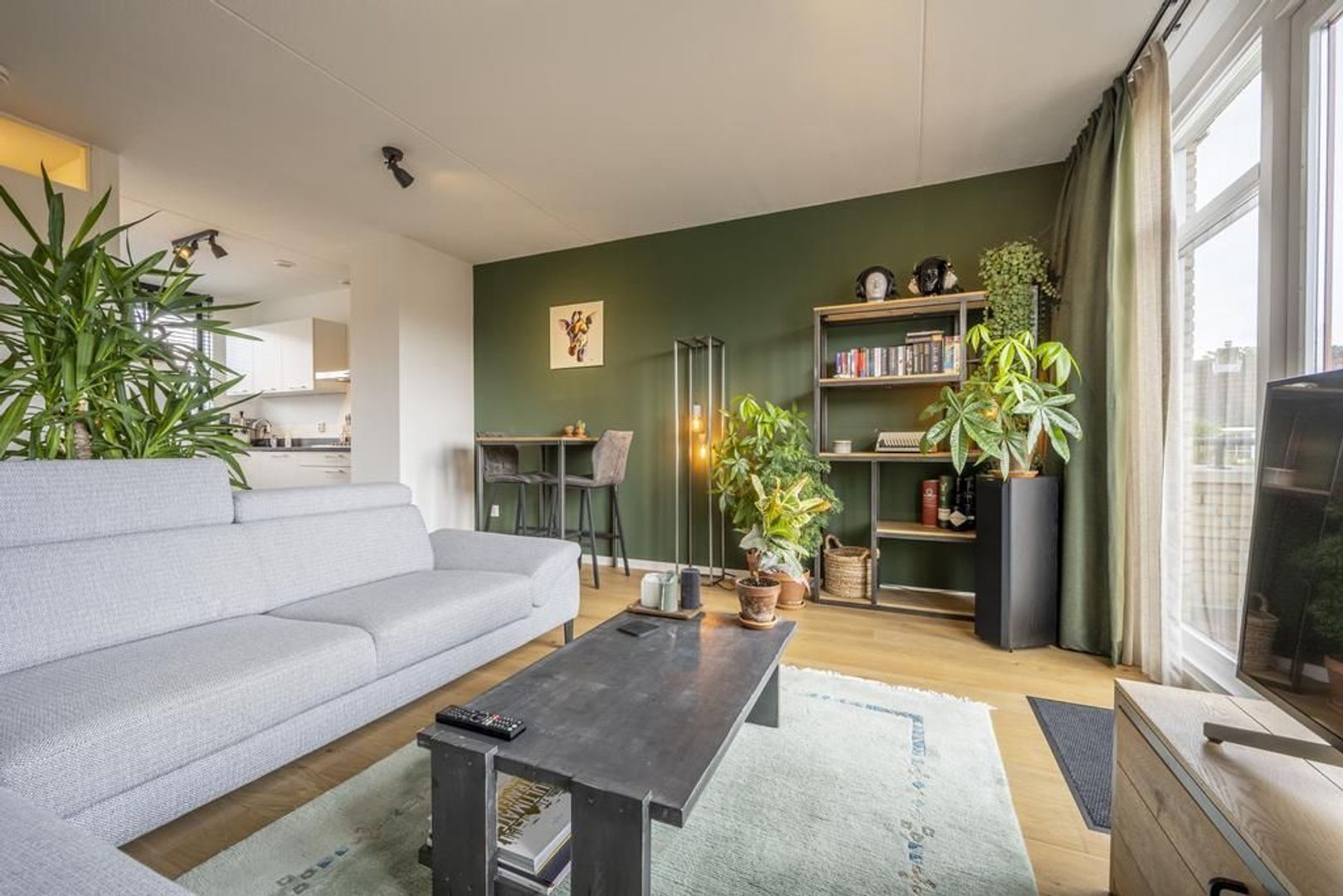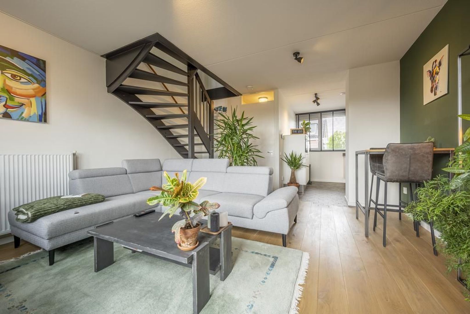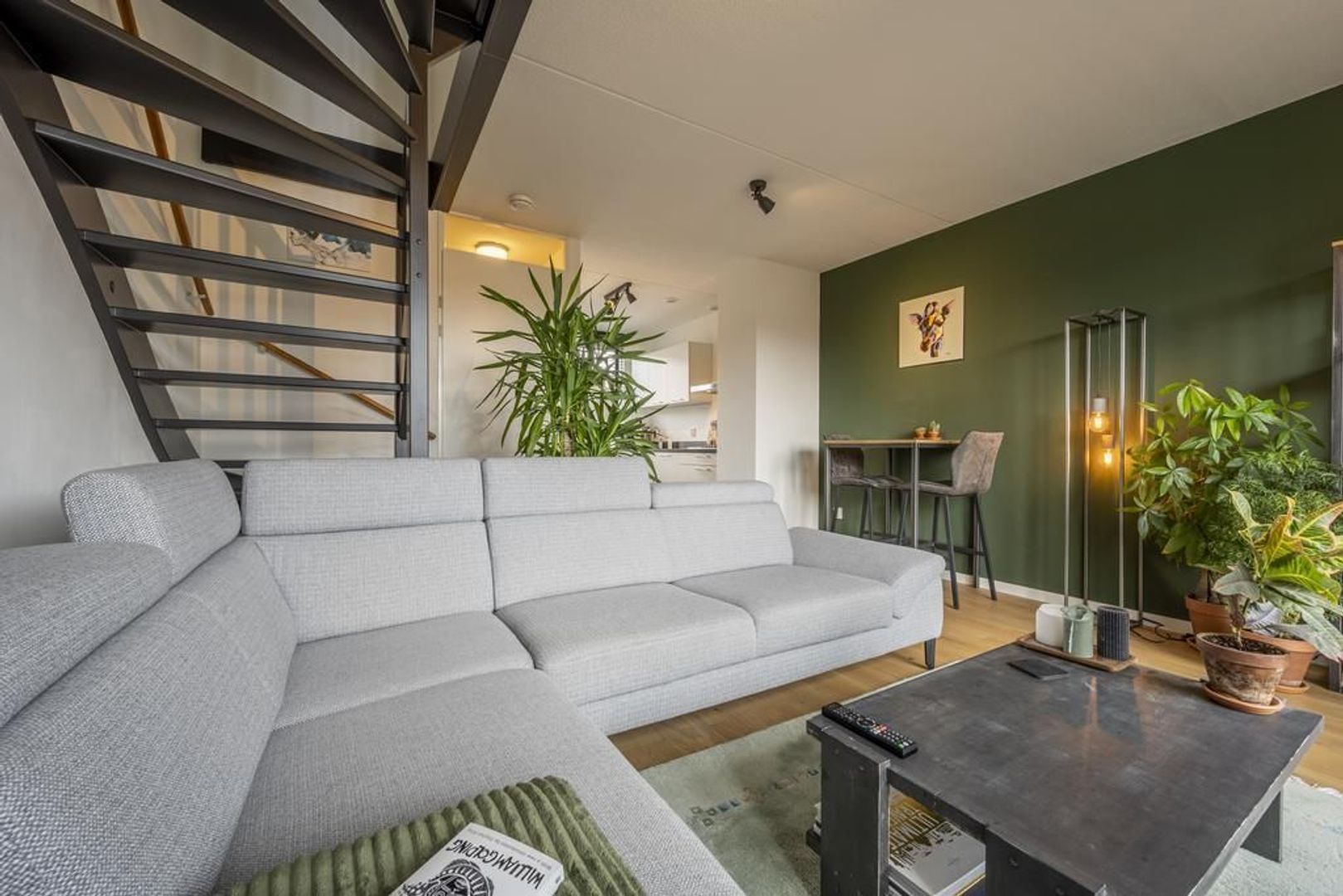 De leefruimte is afgewerkt met een mooie eiken vloer en de wanden zijn gestuukt.