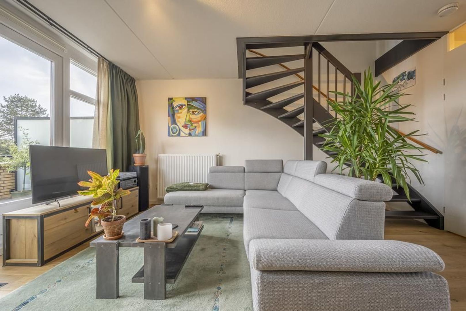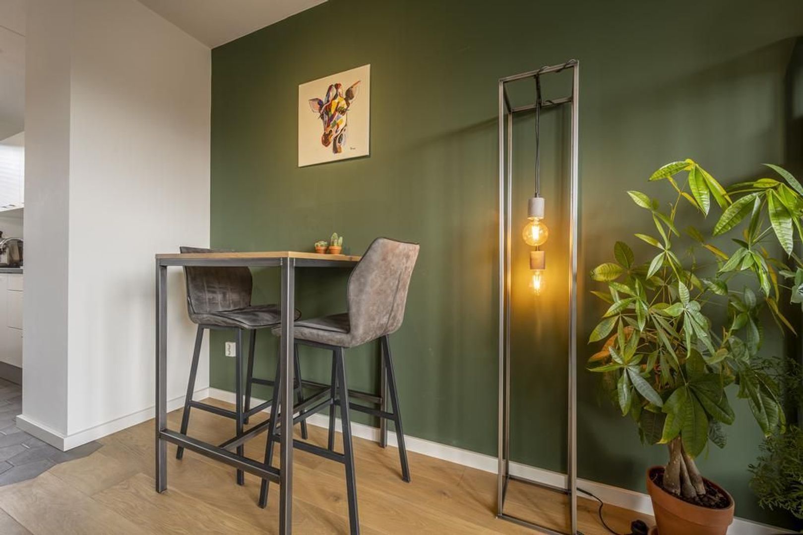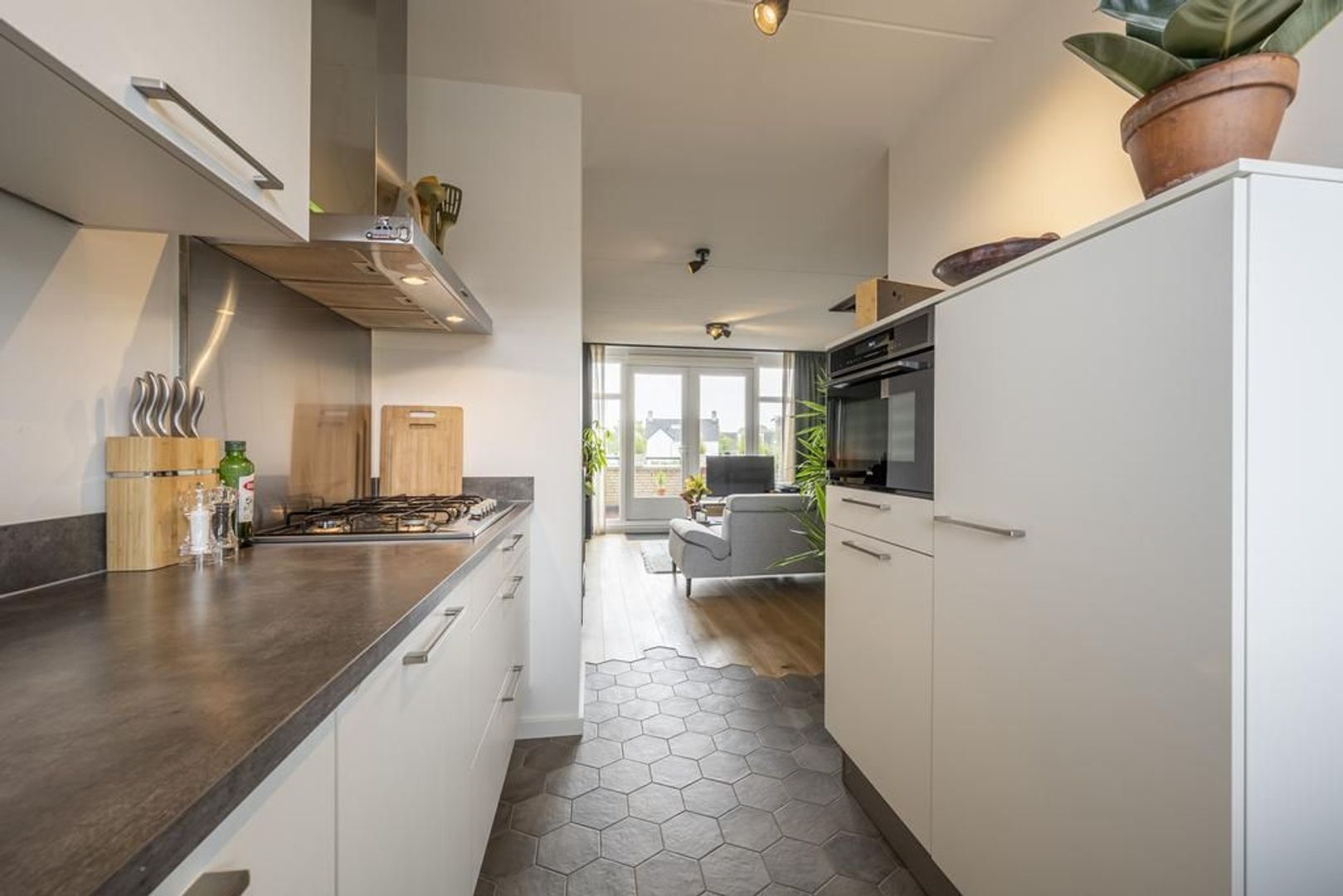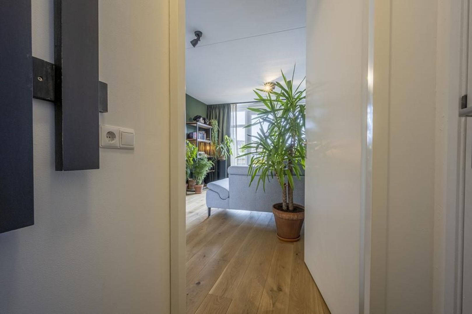 De leefruimte is afgewerkt met een mooie eiken vloer en de wanden zijn gestuukt.