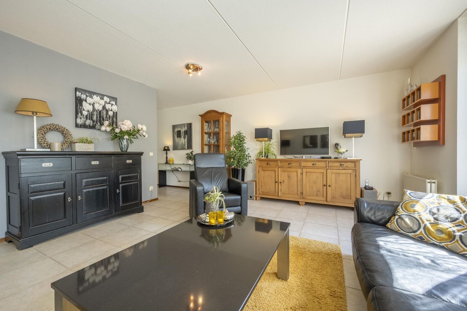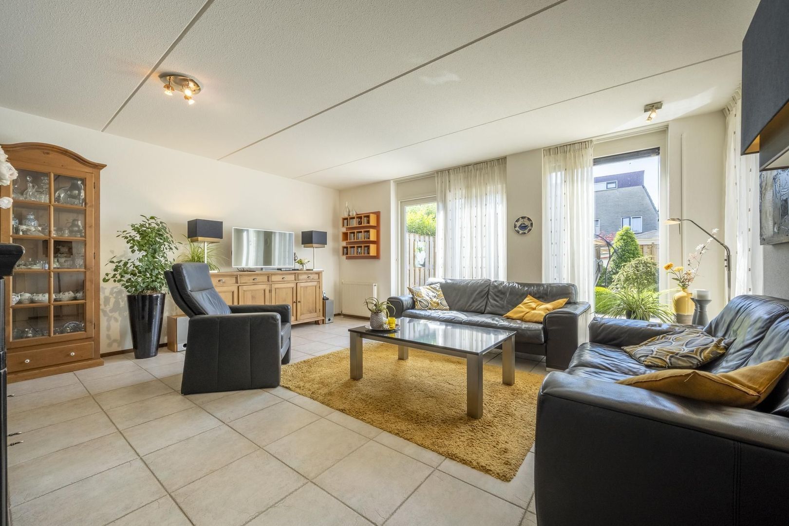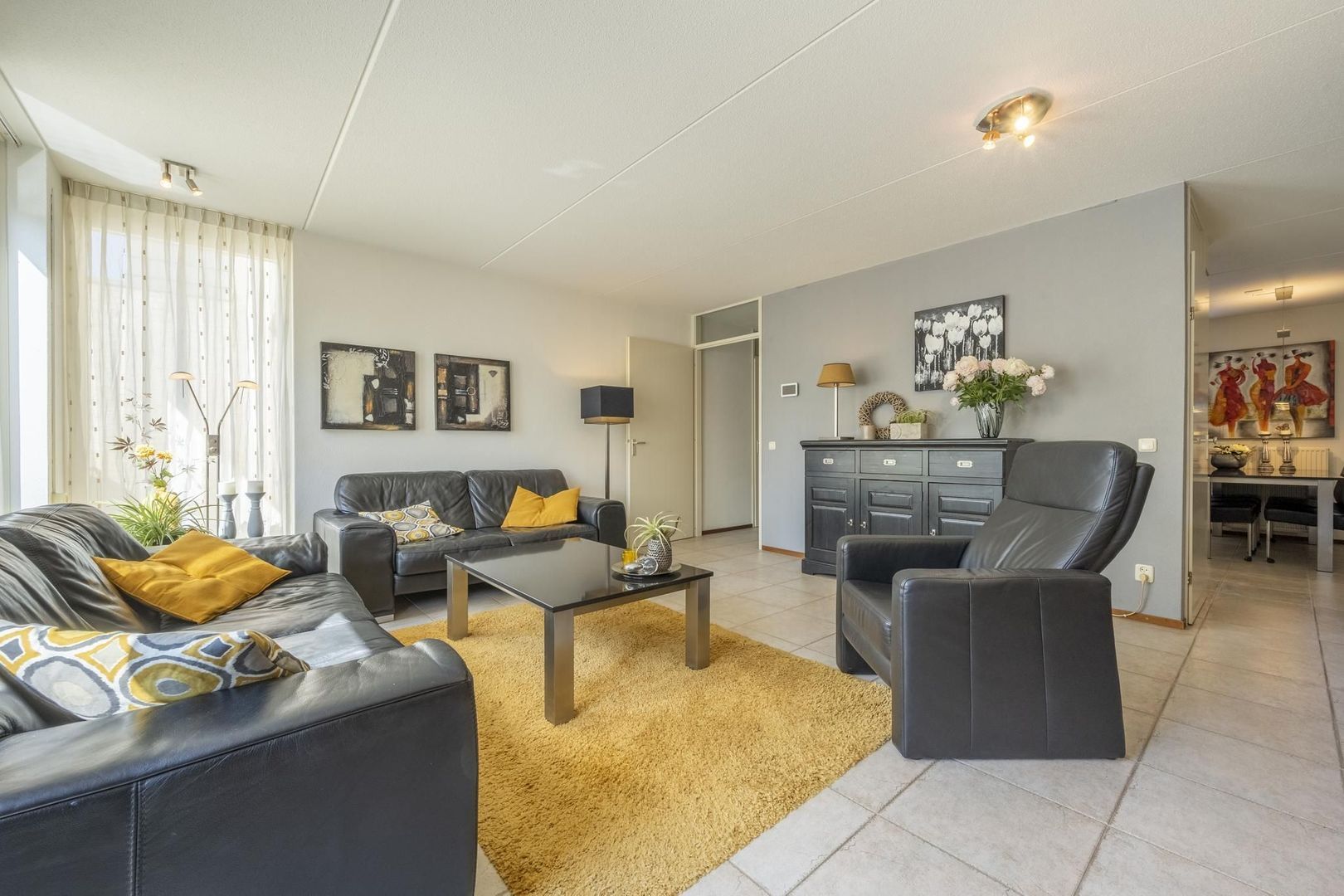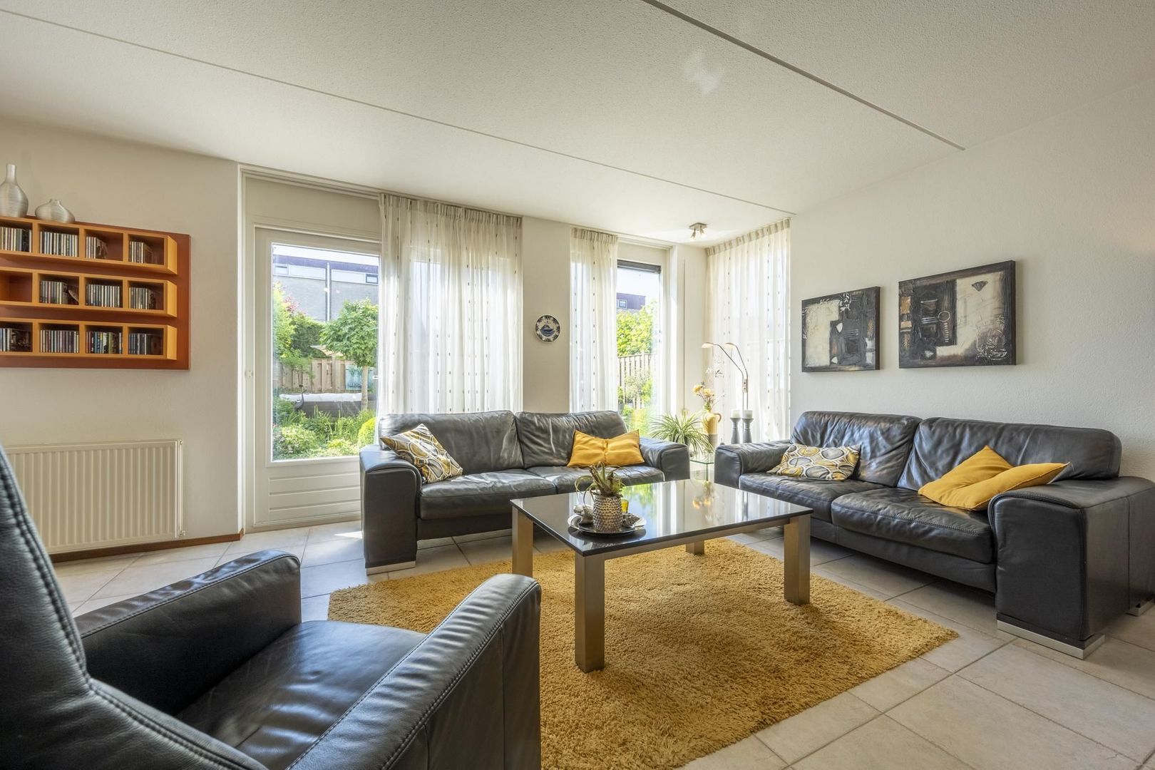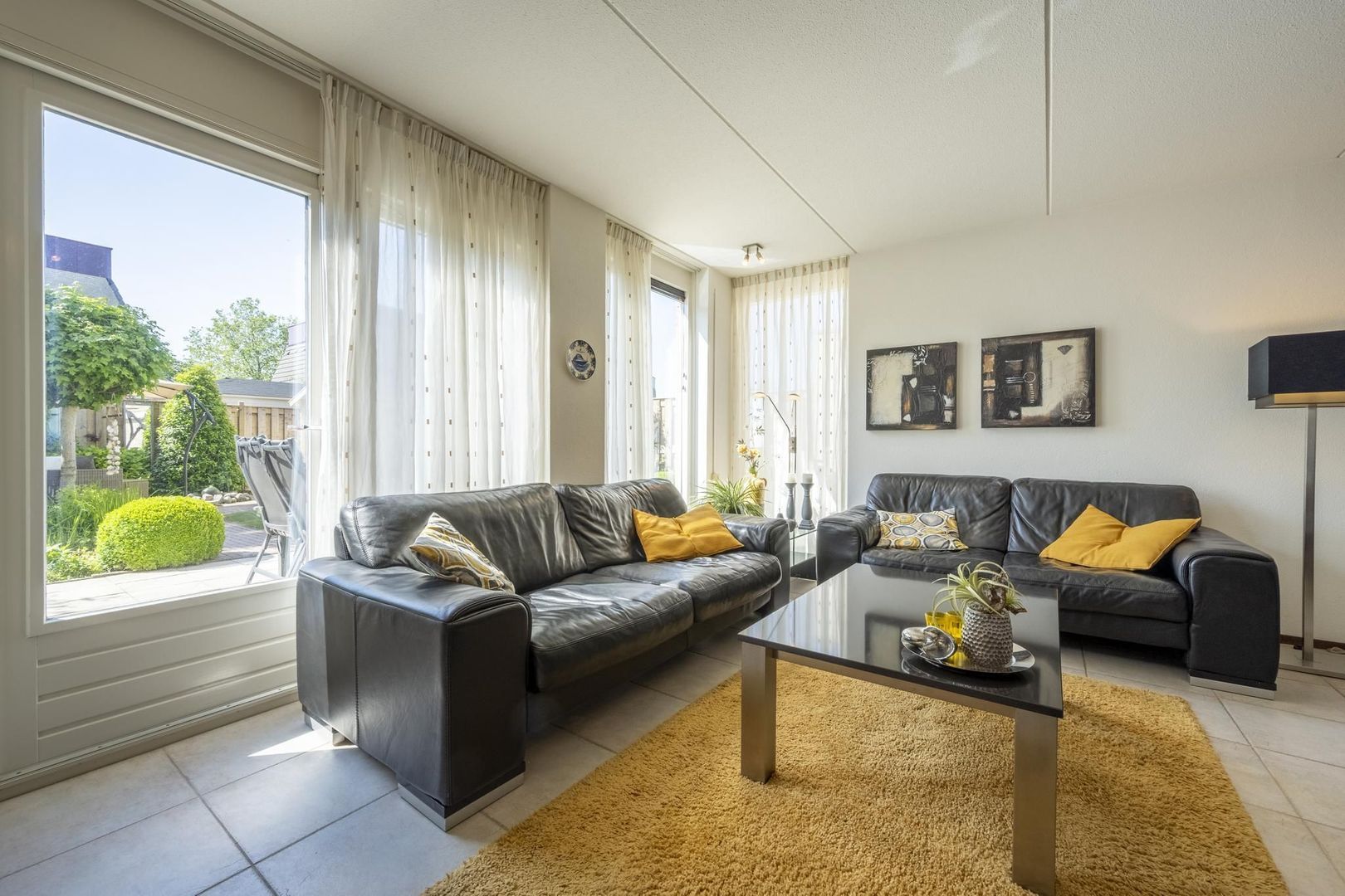 Mooie tuingerichte woonkamer met grote ramen en een zijraam, dus met een prettige lichtinval.