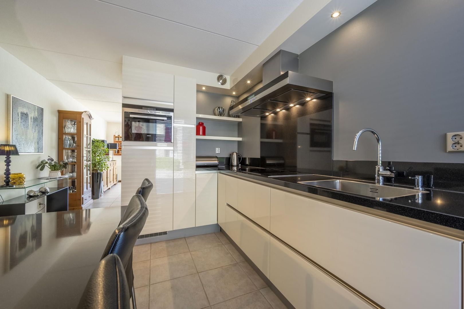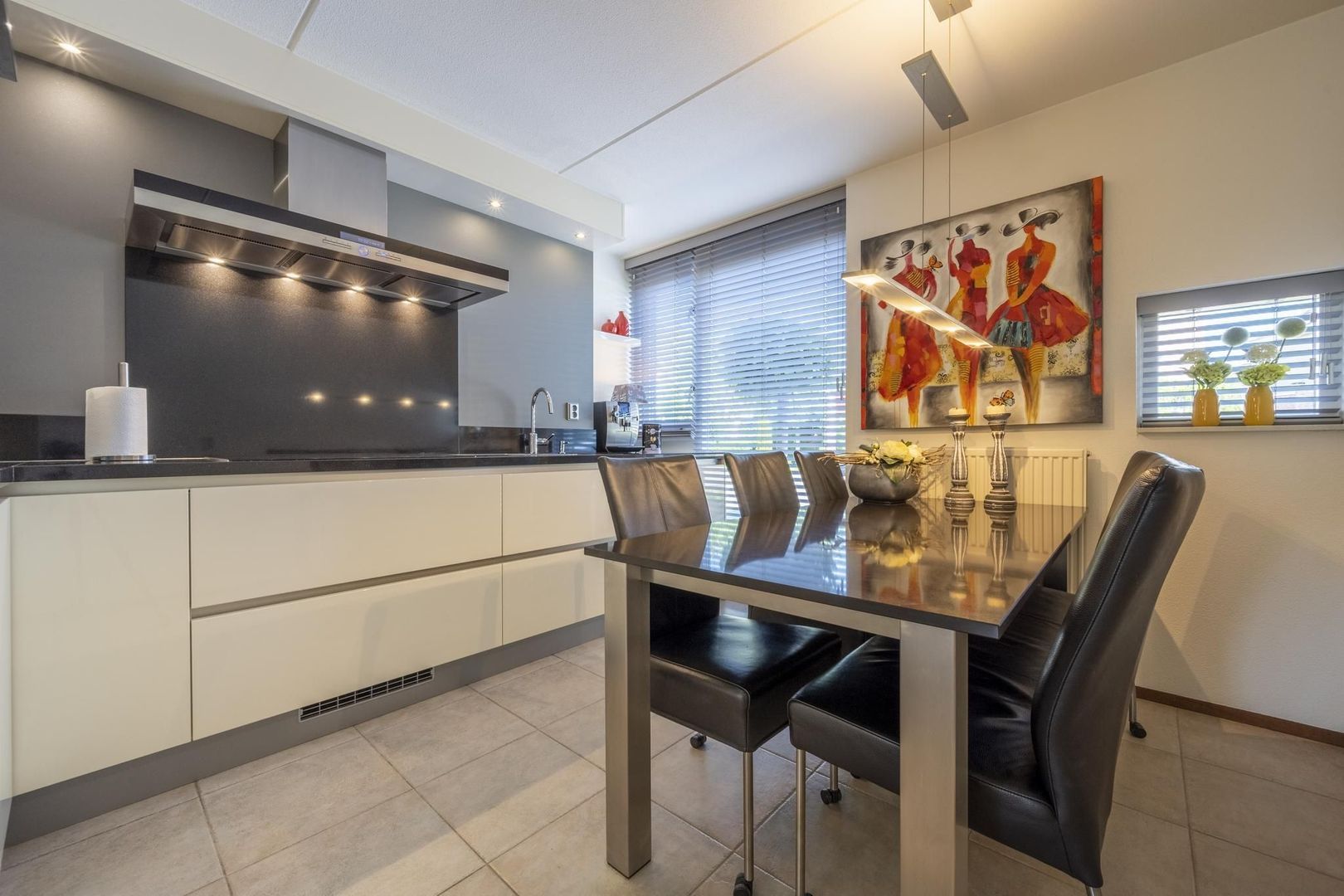 Gezellige keuken aan de straatzijde, met luxe hoekinrichting met composiet aanrechtblad en inbouwapparatuur. In de keuken past ook een flinke eettafel met stoelen.