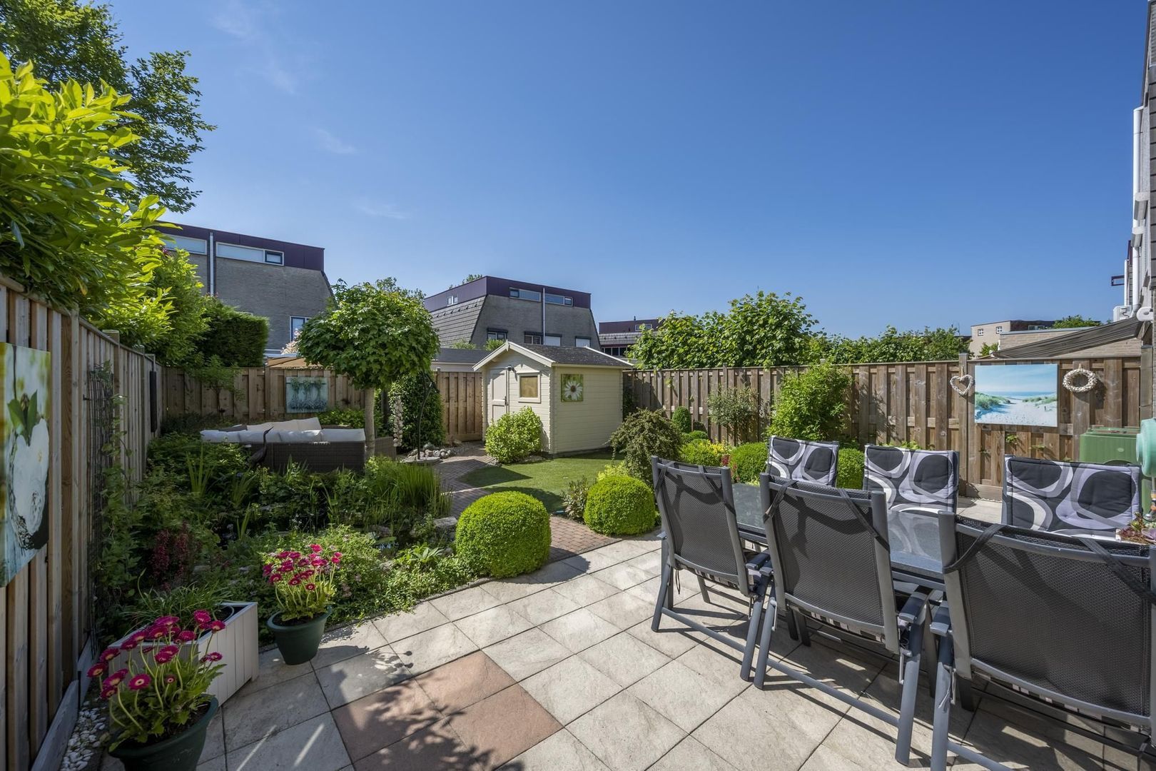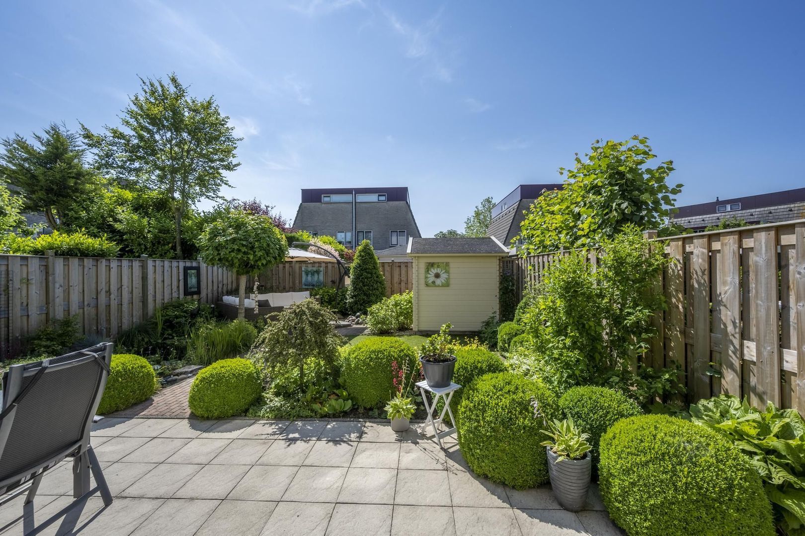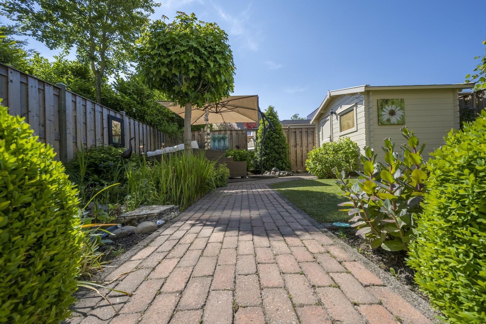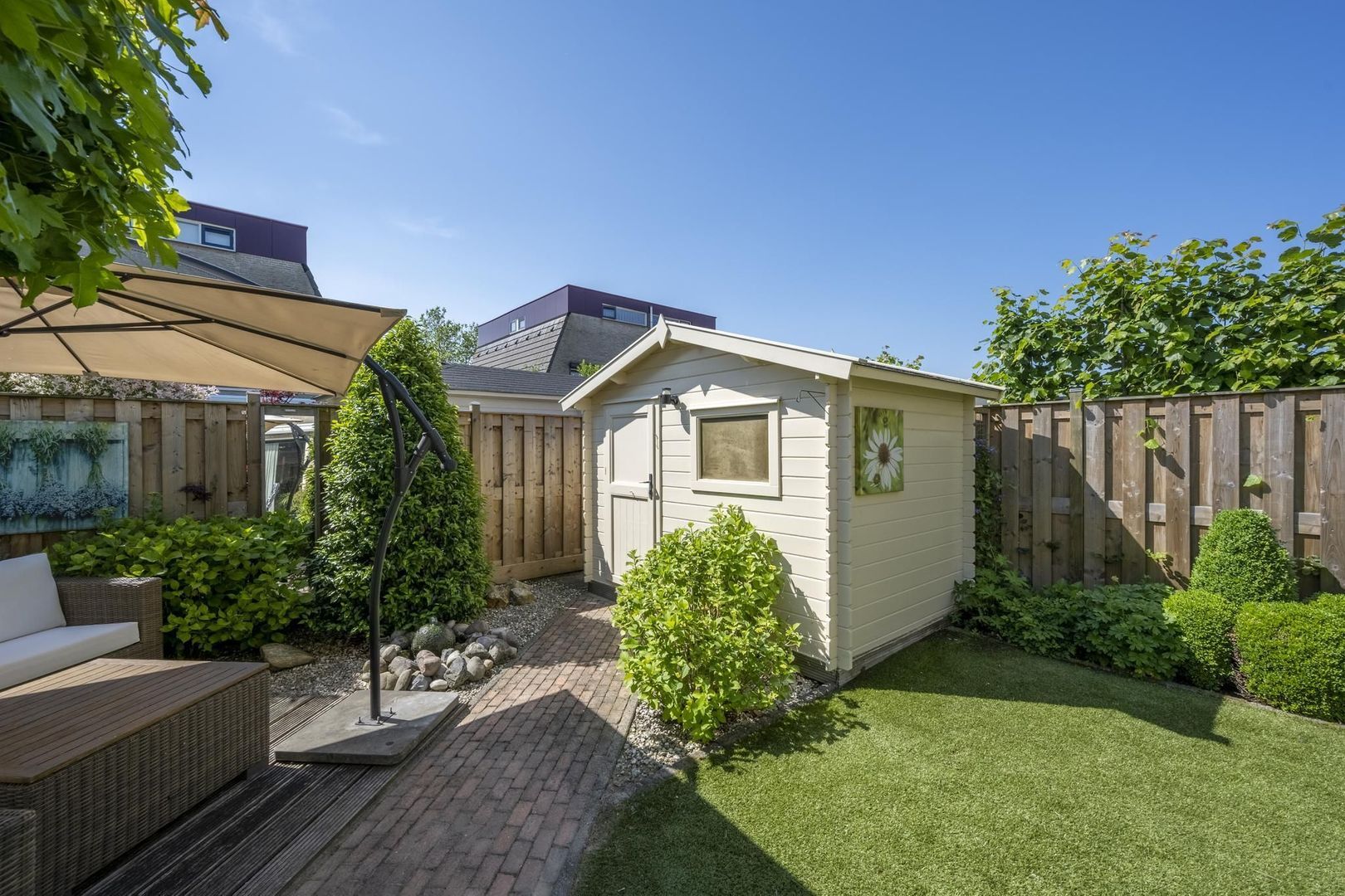 De achtertuin heeft een fijne ligging op het zuidoosten. Deze is mooi aangelegd en goed onderhouden. Achterin staat nog een praktische houten berging voor tuingereedschap of stoelen.