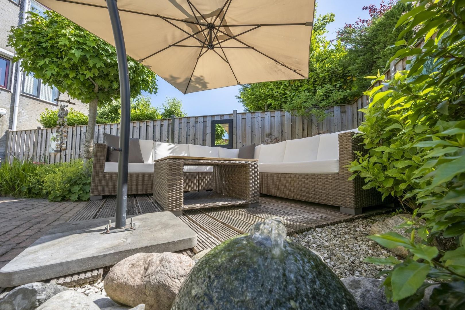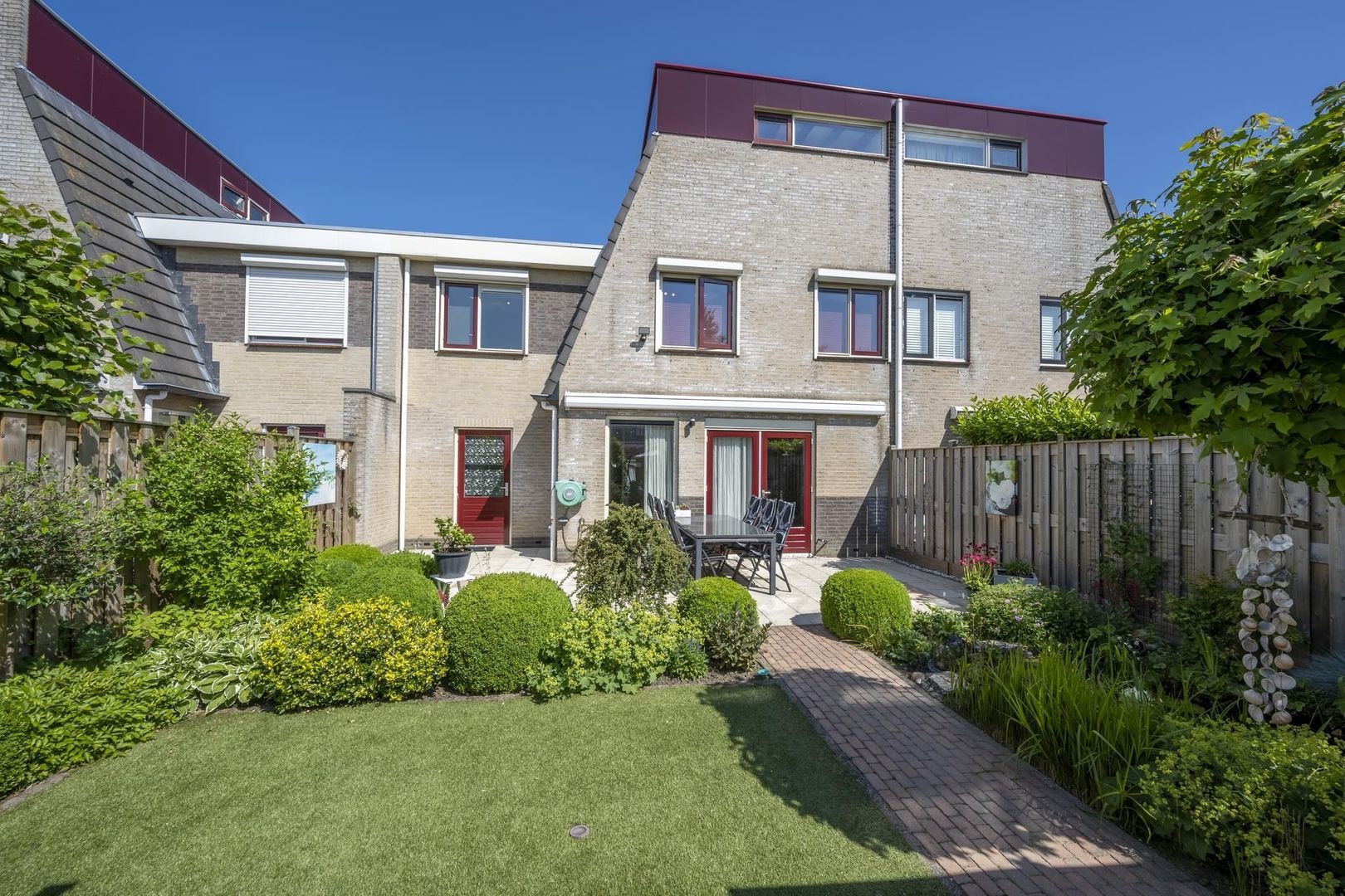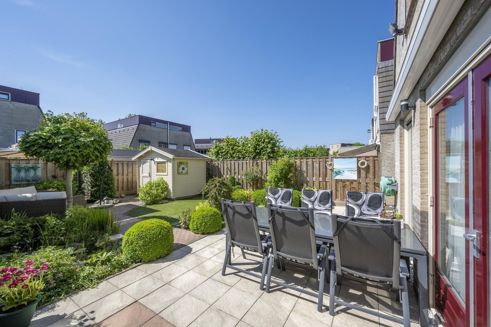 De achtertuin heeft een fijne ligging op het zuidoosten. Deze is mooi aangelegd en goed onderhouden. Achterin staat nog een praktische houten berging voor tuingereedschap of stoelen.