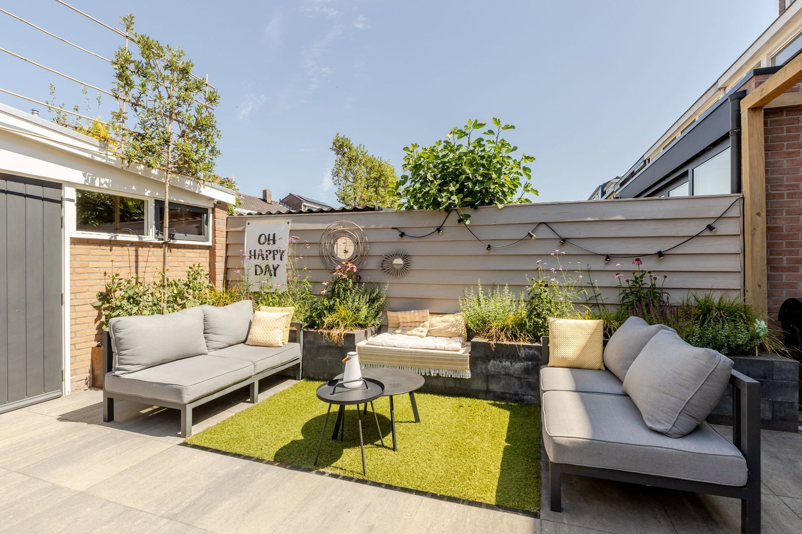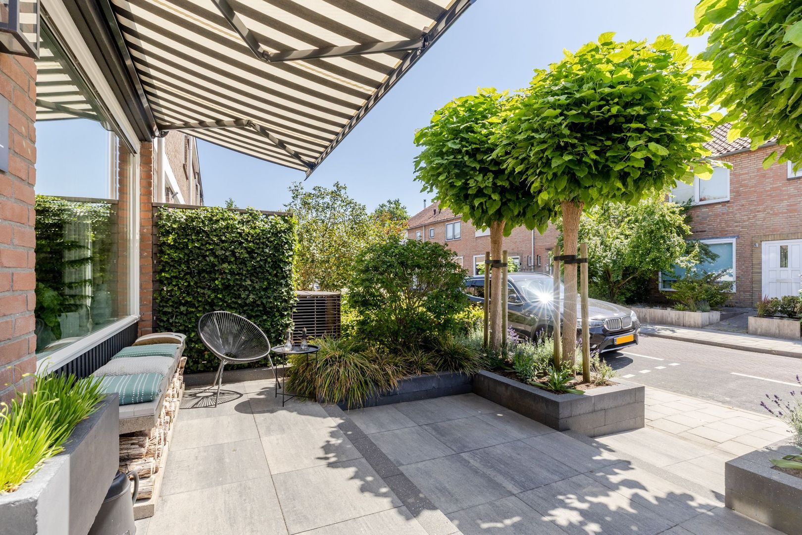 De voortuin ligt op het zuidoosten. Ook deze is prachtig aangelegd en biedt een fijn plekje in de zon.