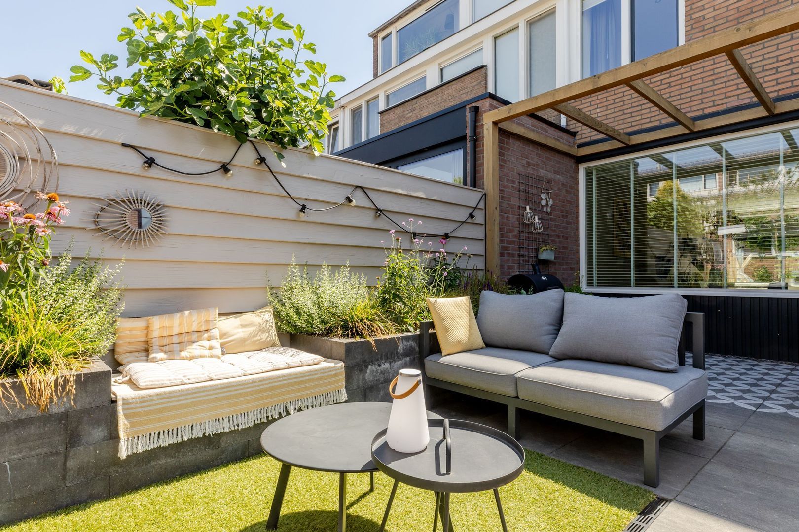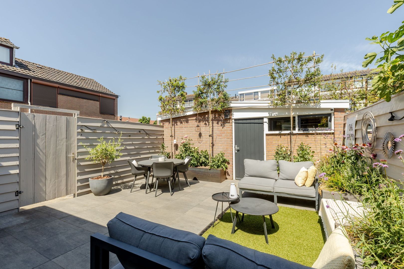 De achtertuin ligt op het noordwesten. Deze is bijzonder smaakvol aangelegd en ingericht met onder andere een pergola, een fraai terras en een gemetselde plantenbak met een geïntegreerd bankje. Achterin de tuin staat een ruime stenen berging.
