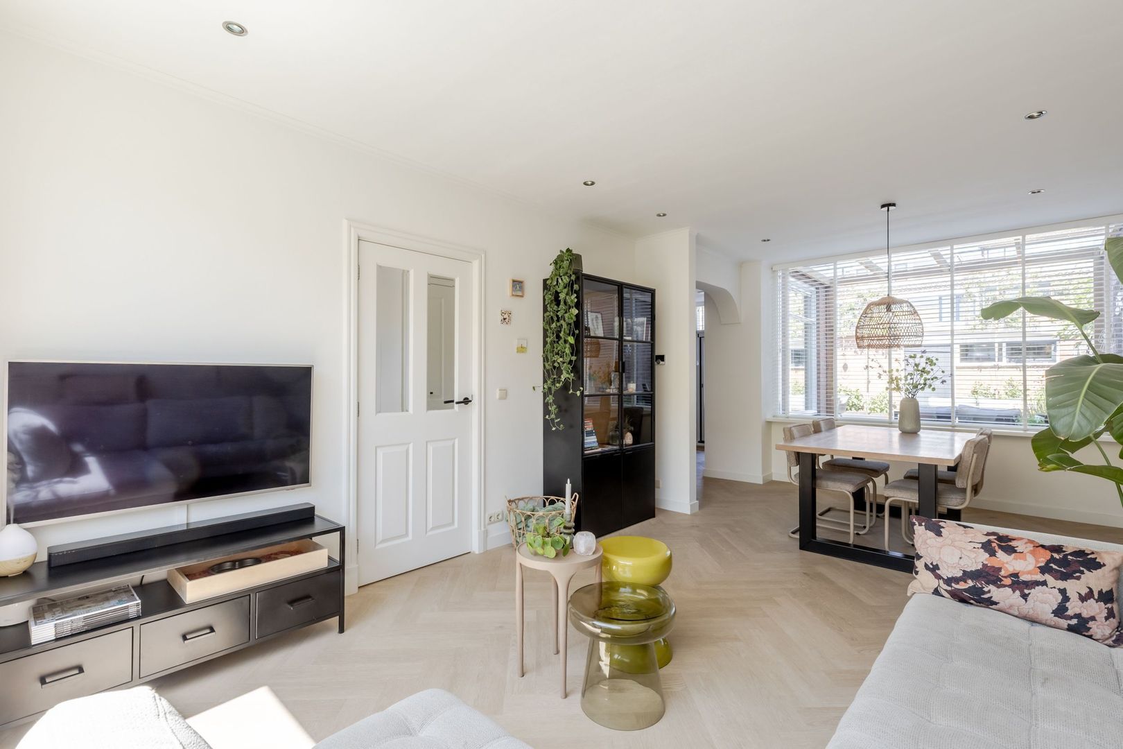 De doorzon woonkamer is strak afgewerkt en uitgevoerd met een plafond met inbouwspots.