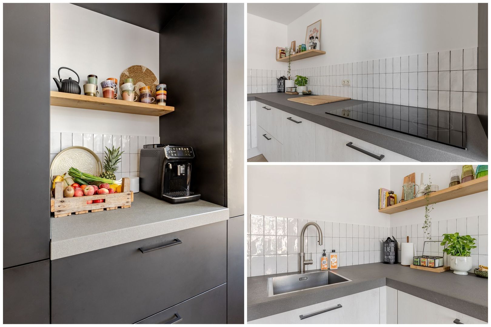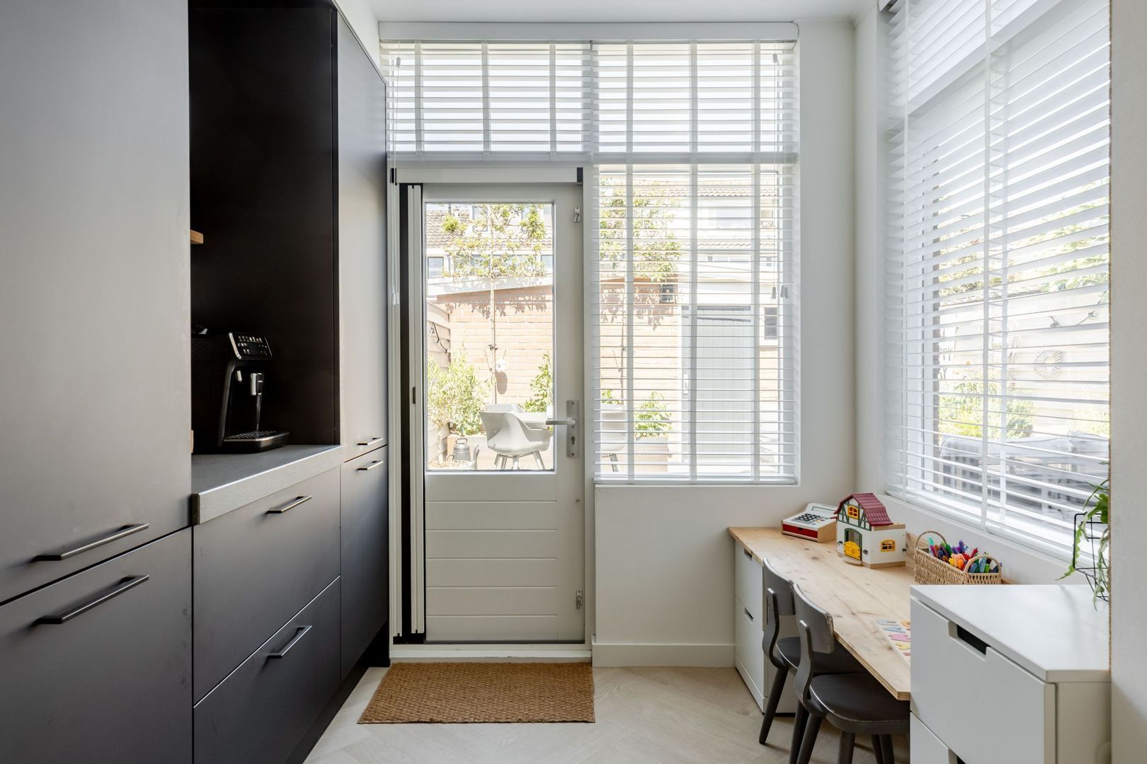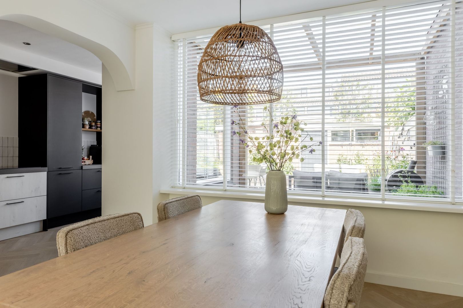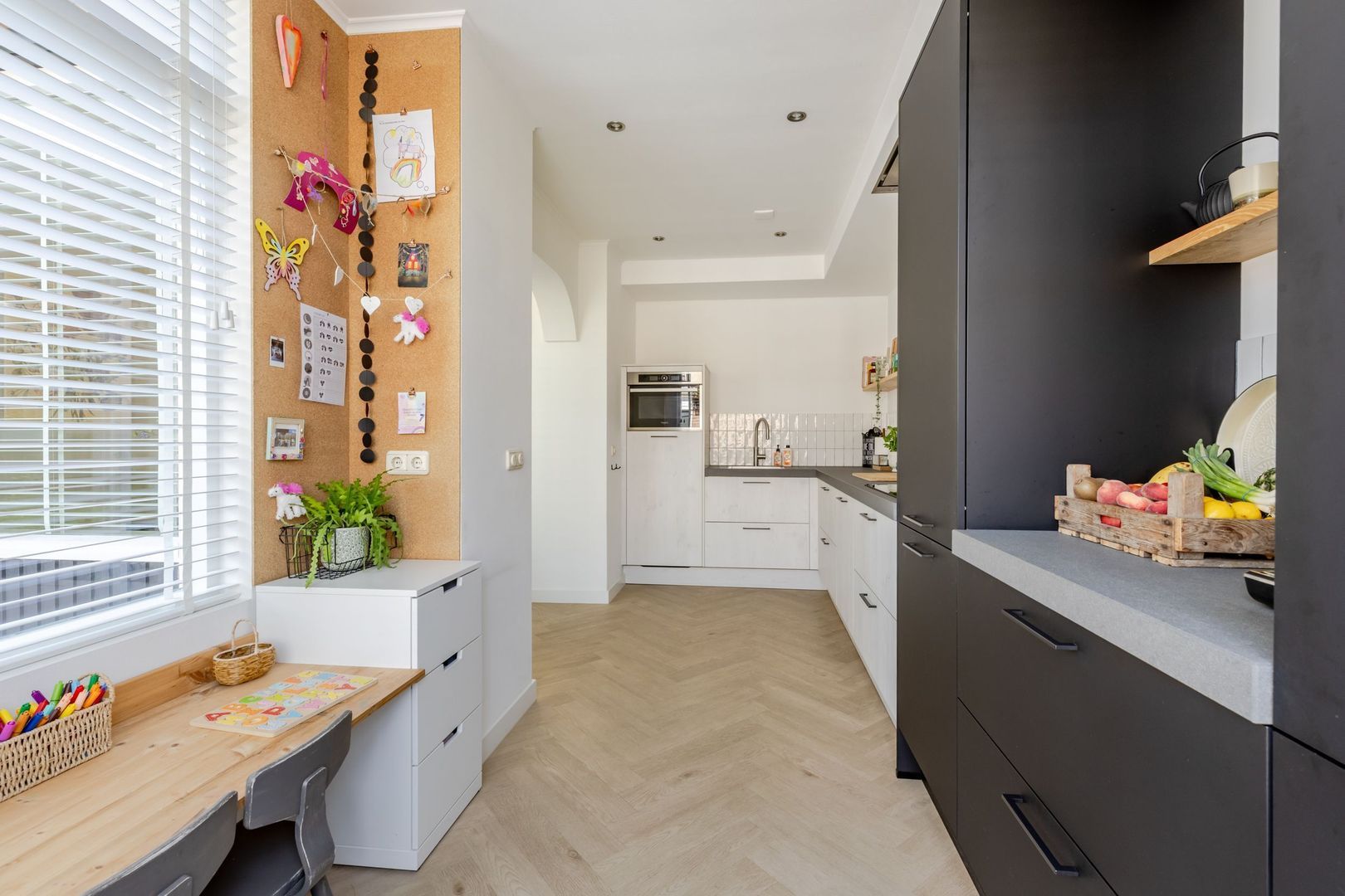 De halfopen keuken is verrassend ruim, wat komt door de aanbouw. Er staat een moderne L-vormige opstelling in, voorzien van inbouwapparatuur en een Quooker.
