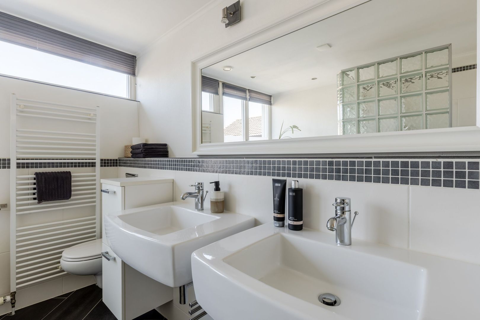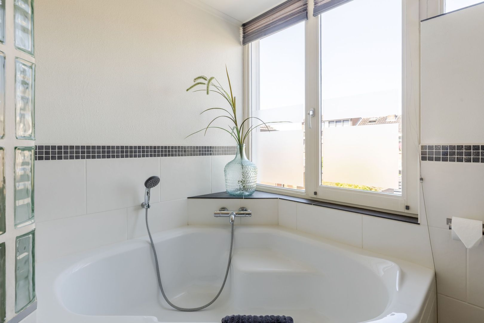 De badkamer is ingericht met een hoekbad, een inloopdouche, een dubbele wastafel en een tweede toilet. Ook hier biedt vloerverwarming comfort en het raam dat open kan, maakt ventileren met frisse buitenlucht mogelijk.