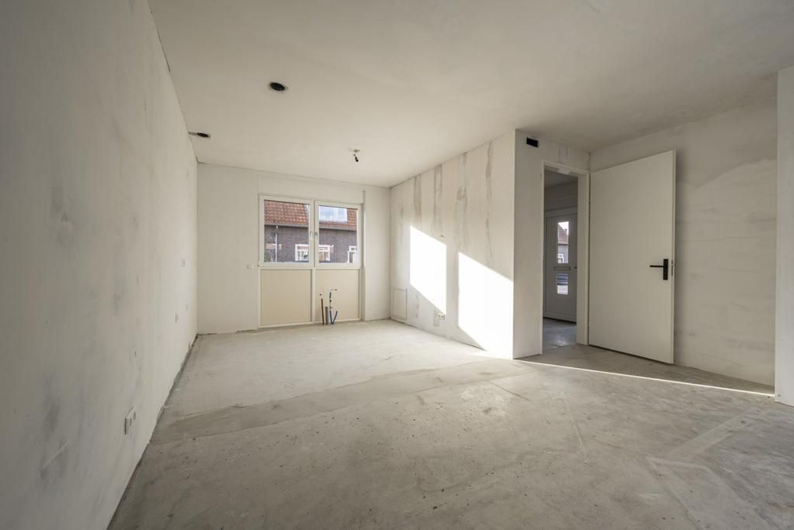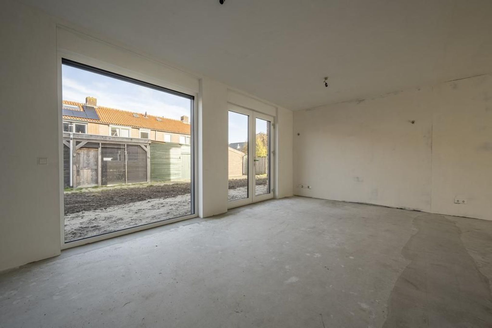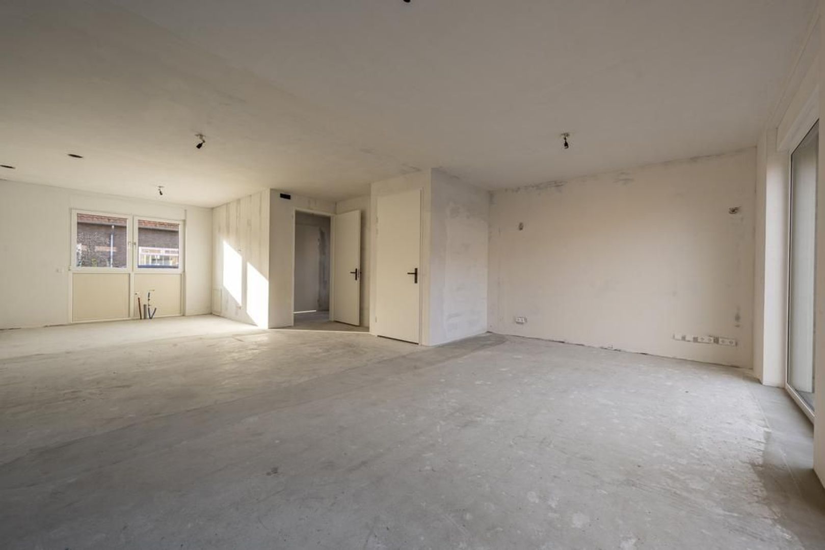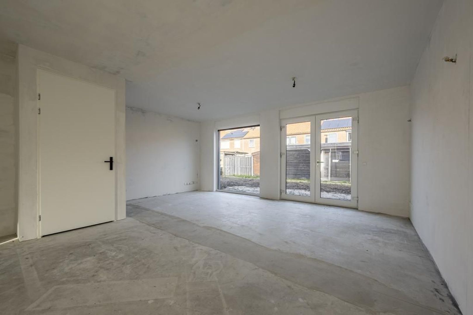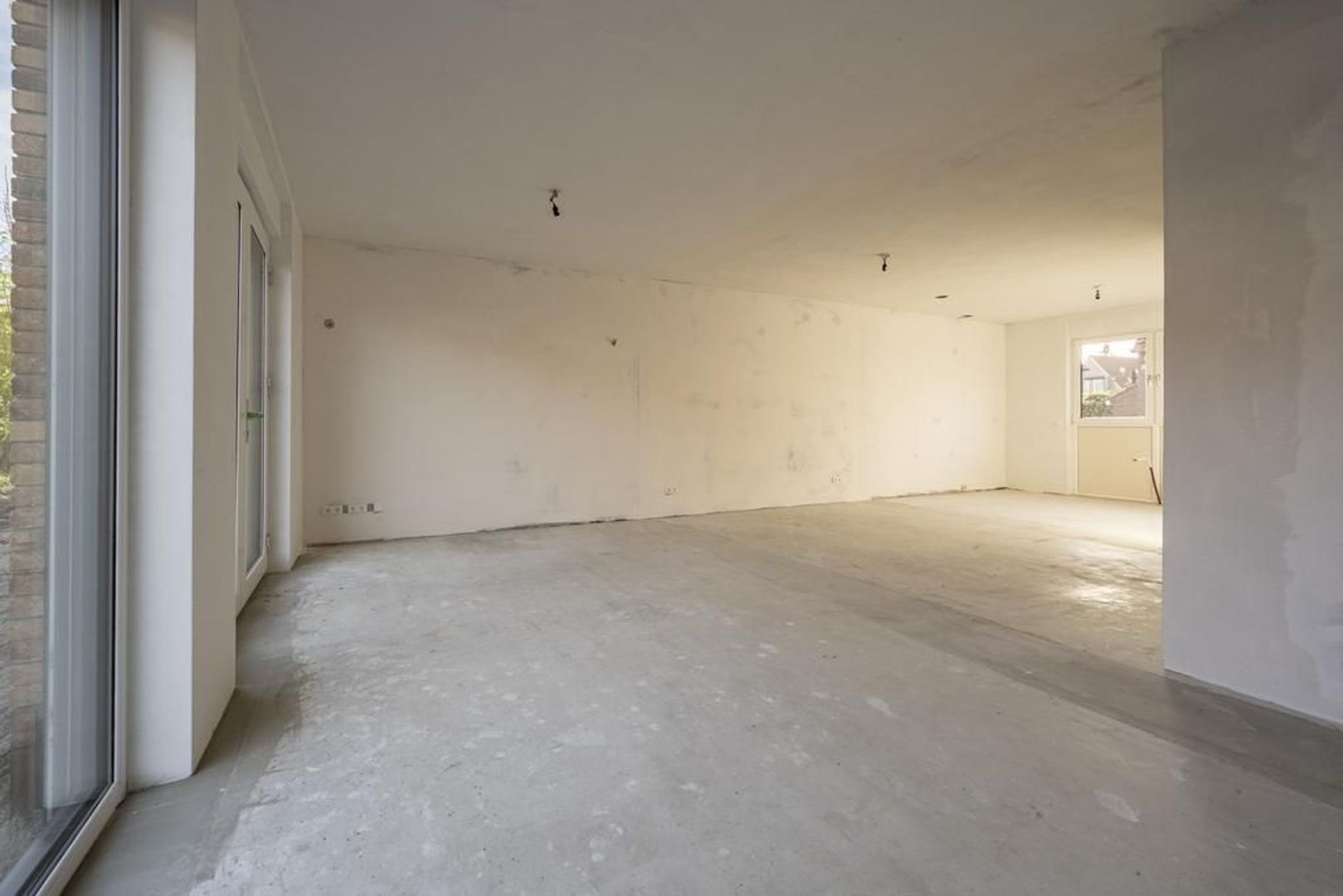 Royale leefruimte met aan de straatzijde de aansluitingen voor de keuken (L-vorm) en aan de tuinzijde dubbele openslaande ramen en een vast raam, of twee keer dubbele openslaande deuren.