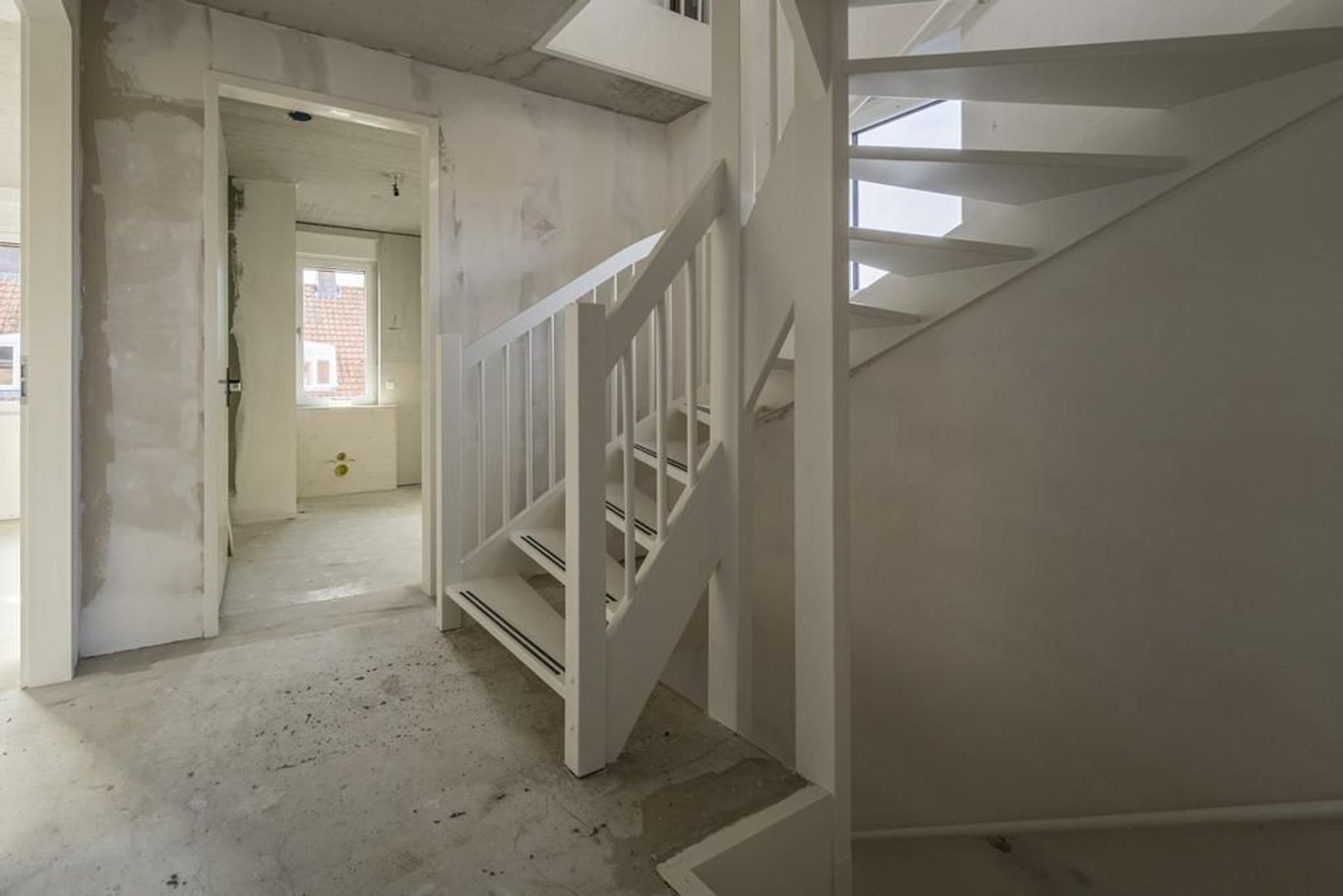 Een heerlijke “luie” trap leidt naar de eerste verdieping, waar drie grote slaapkamers zijn en de casco badkamer. Hierin zijn afvoeren aanwezig voor de douche, een ligbad, wastafelmeubel en een tweede toilet. Er is een groot raam dat open kan.