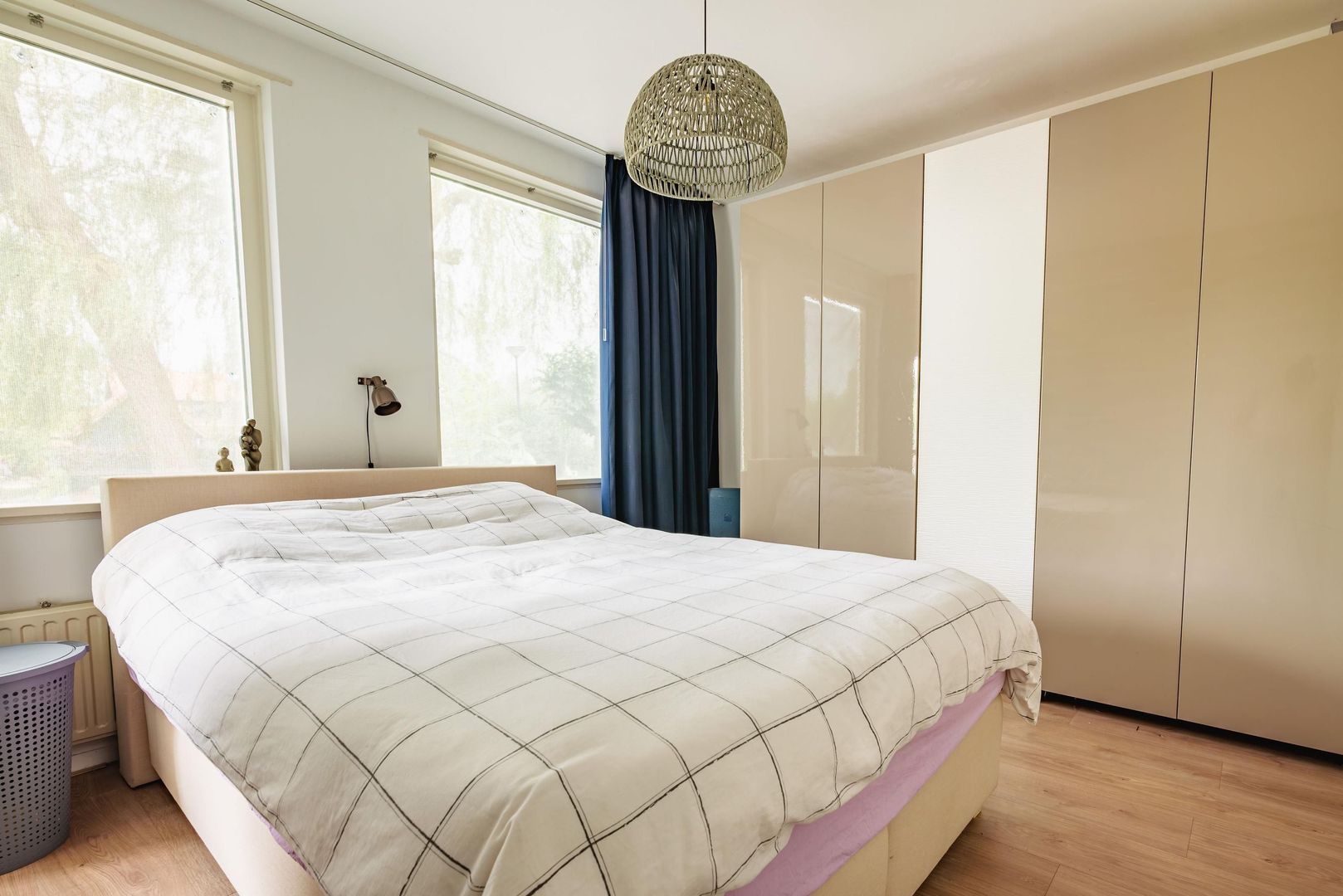 Aan de voorkant van de woning bevindt zich een ruime slaapkamer, afgewerkt met een laminaat vloer. Deze kamer is ook bijzonder geschikt als werkkamer of praktijkruimte, omdat deze een eigen deur naar buiten heeft.