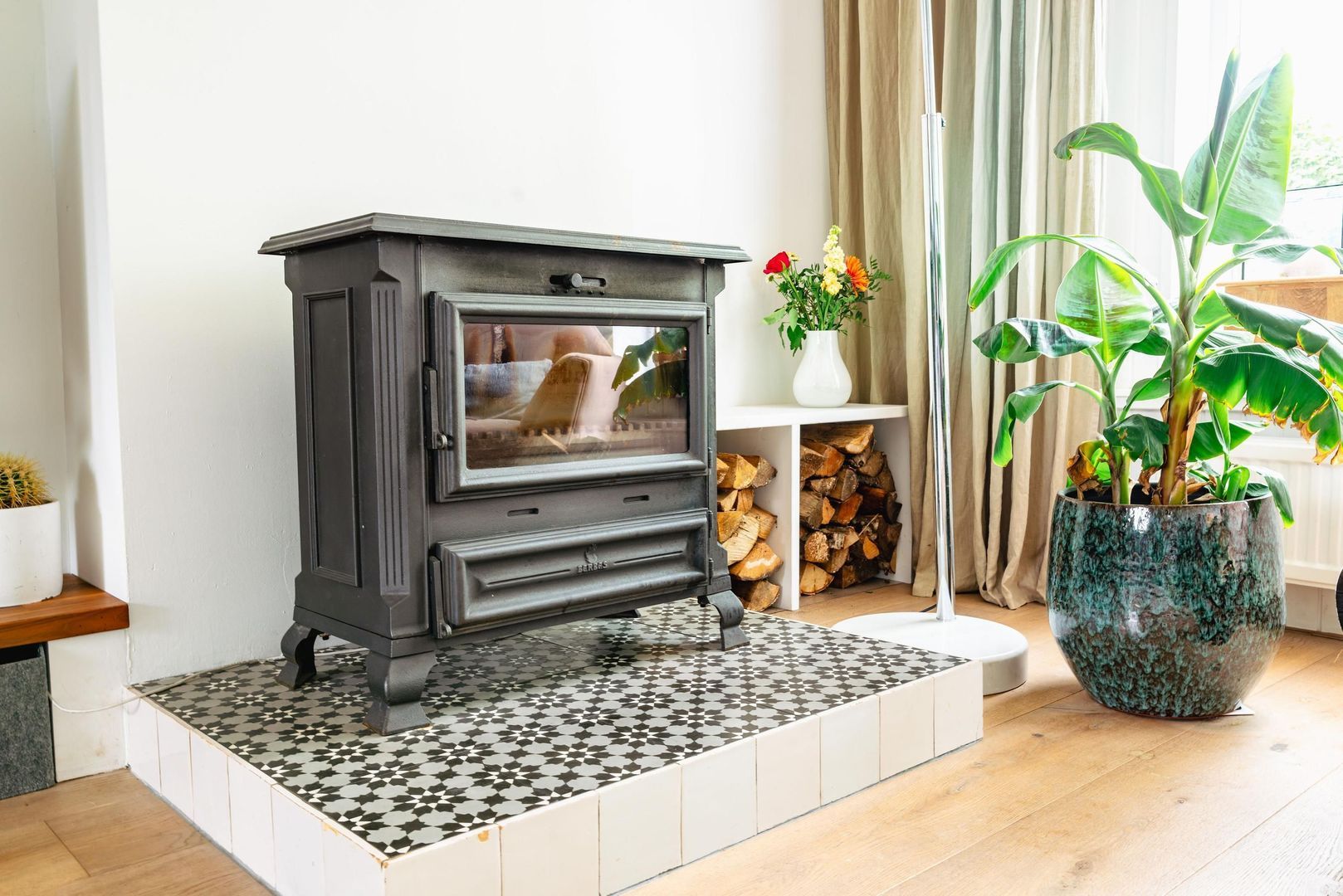 De bijzonder sfeervolle en lichte woonkamer heeft een balkenplafond, op maat gemaakte kasten, een houtkachel en een lamel parketvloer.