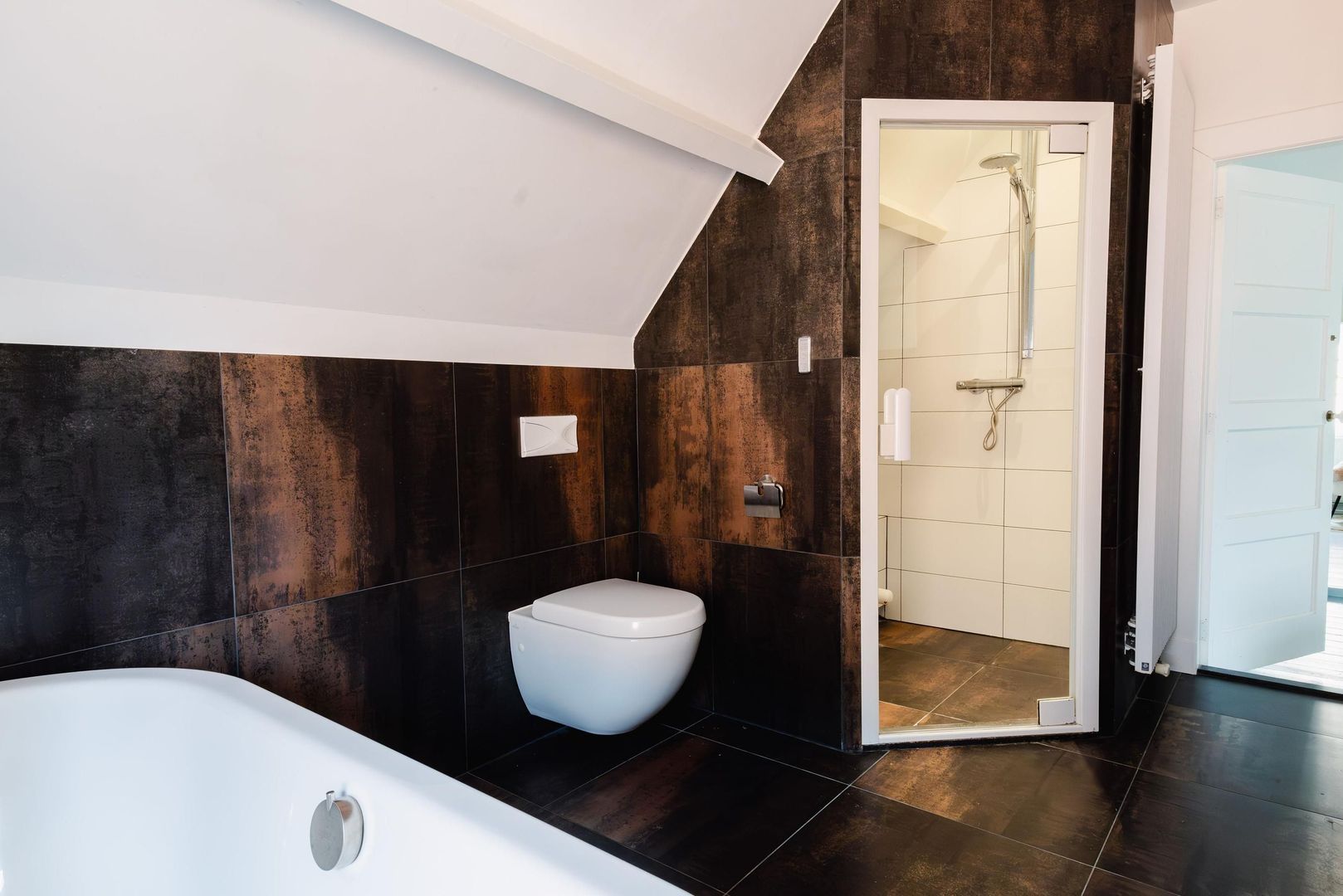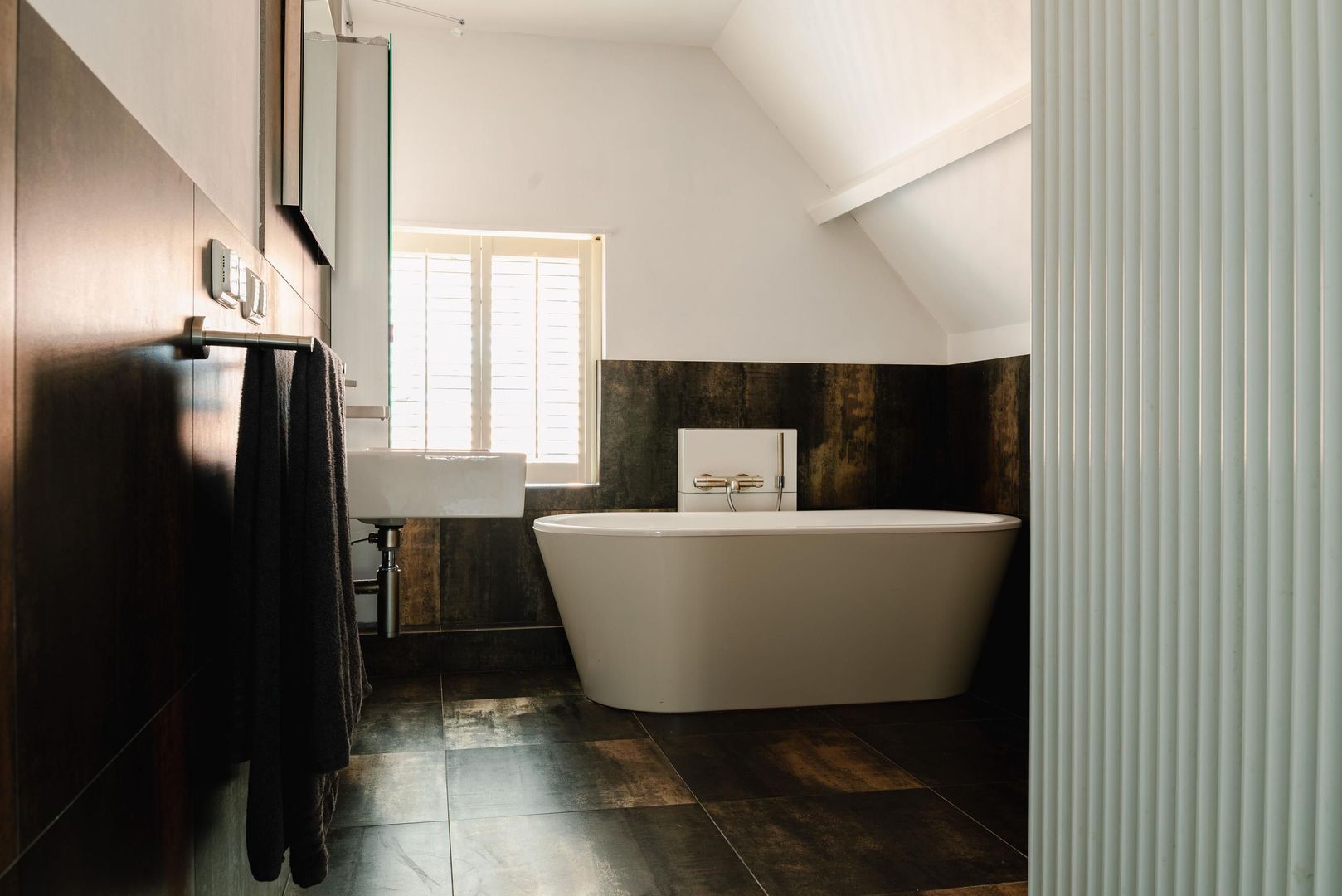De badkamer is ingericht met een mooi vrijstaand bad, een douchegelegenheid met stoomdouche en een wastafel met spiegelkast. Het raam maakt ventileren met frisse buitenlucht mogelijk.