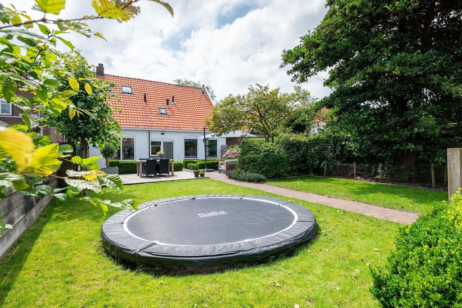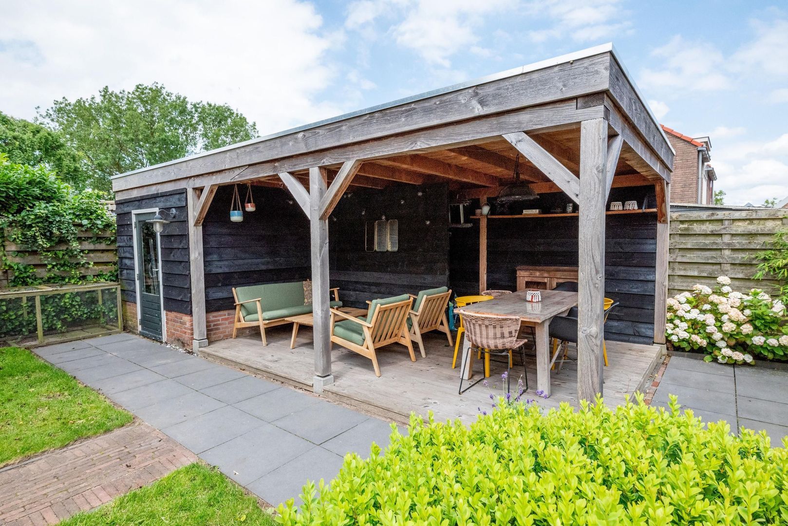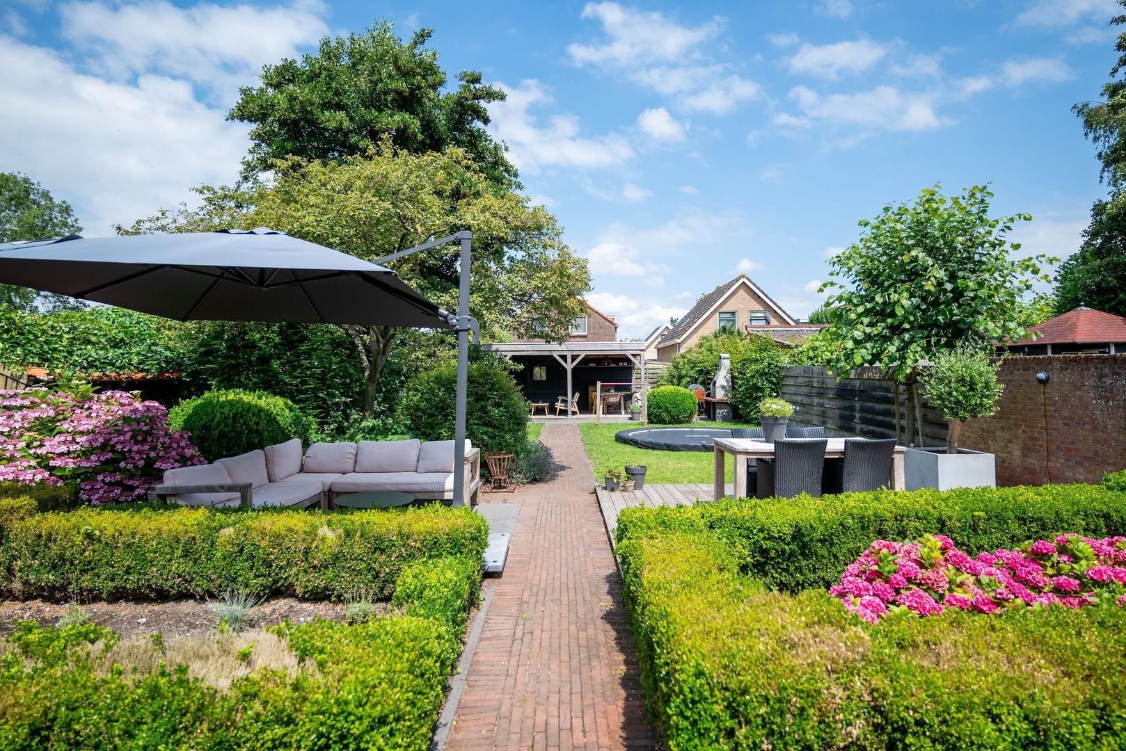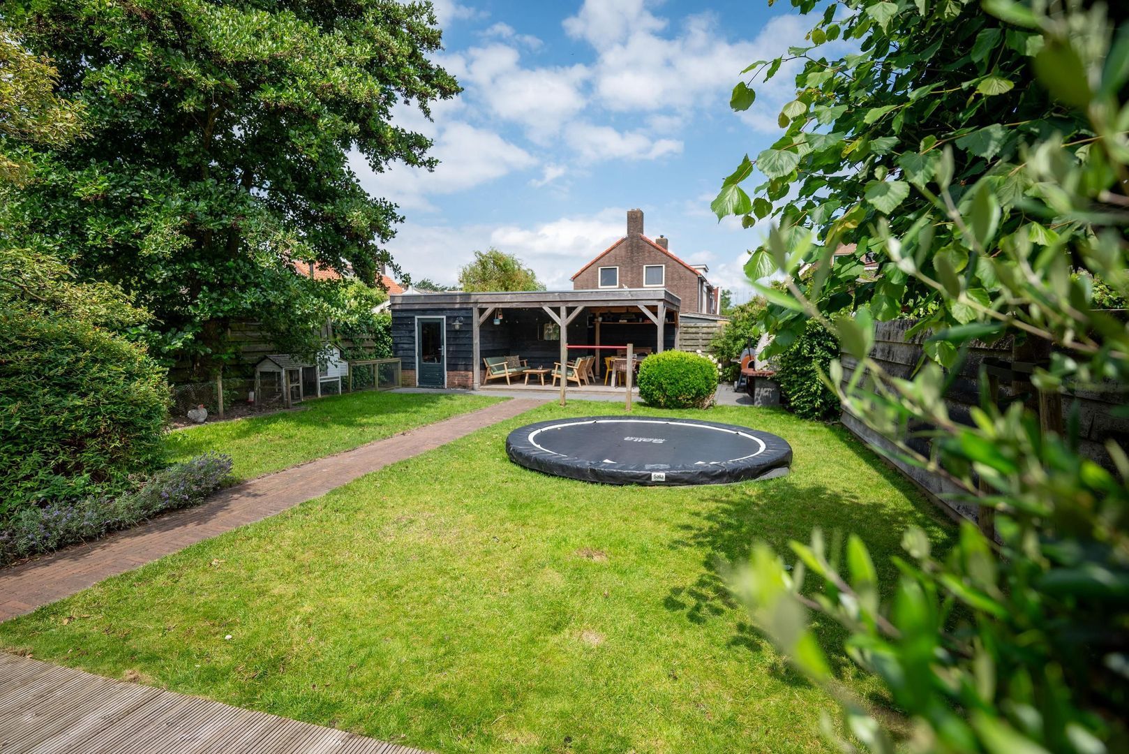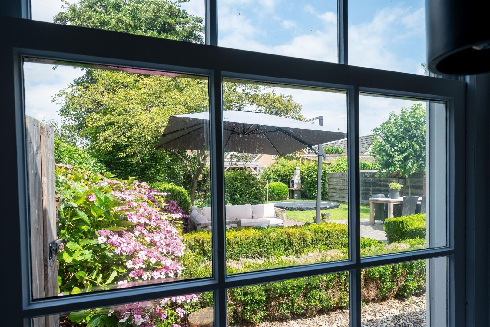 De achtertuin ligt weliswaar op het noordoosten, maar biedt door zijn diepte veel zon. De tuin is mooi aangelegd en goed onderhouden. In 2020 is een mooie nieuwe berging met veranda gebouwd, waar het heerlijk vertoeven is tot laat in de avond.
