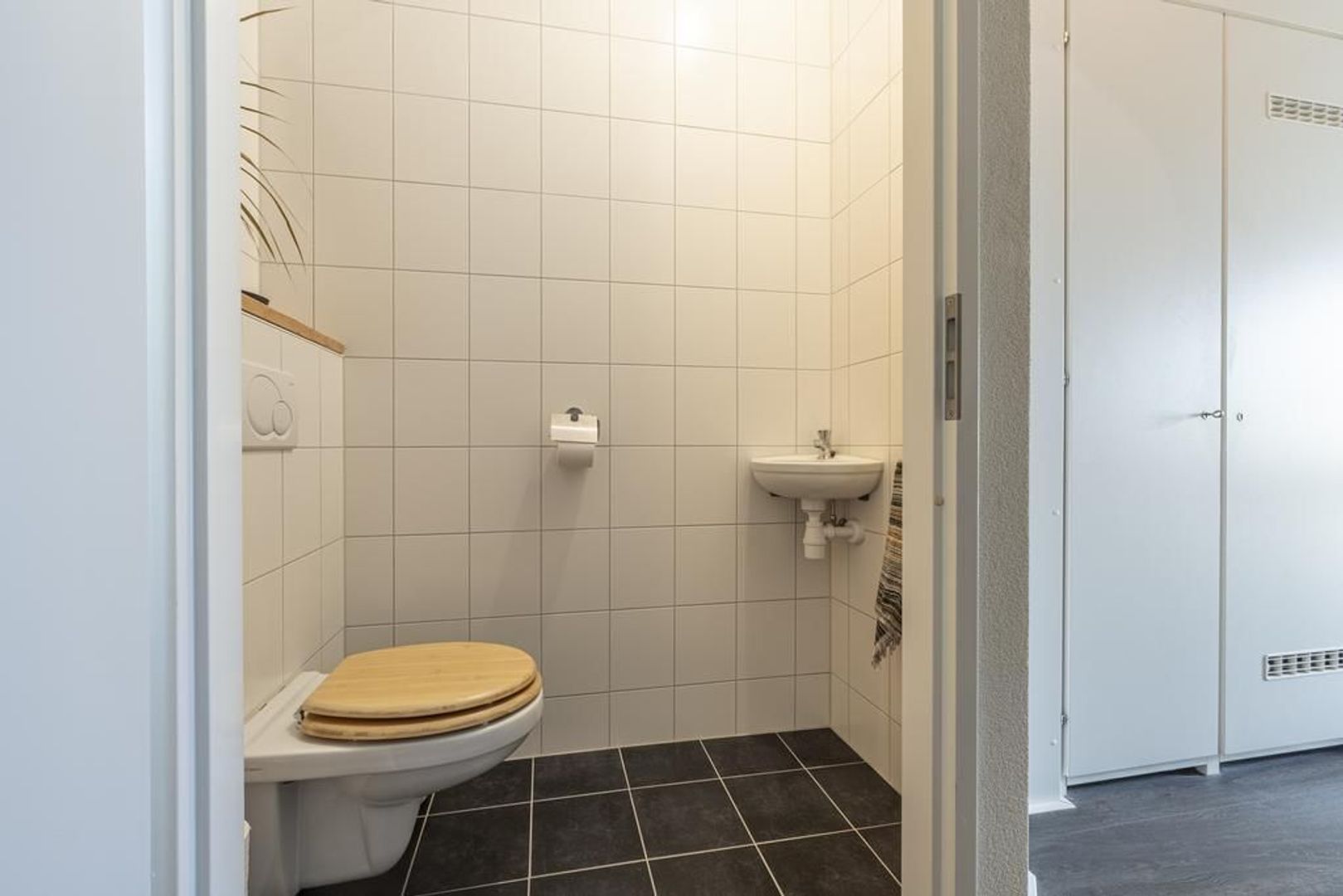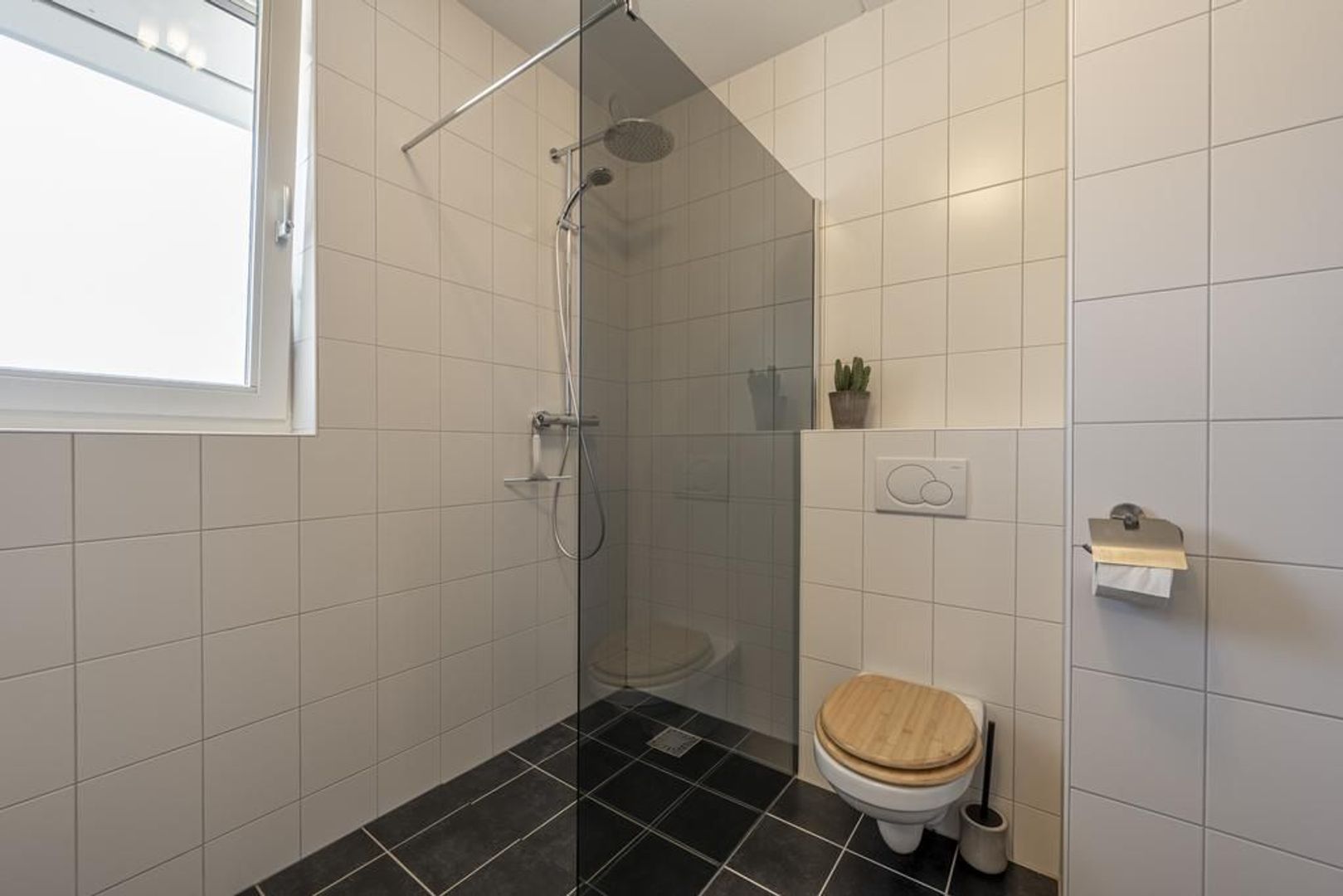 Ook deze heeft een moderne inrichting met inloopdouche met regendouche, een groot wastafelmeubel en een tweede (wand)toilet.