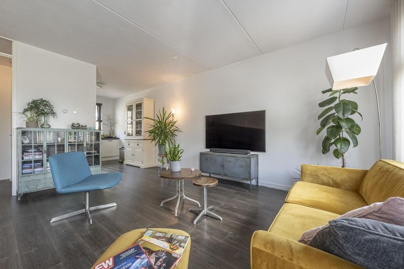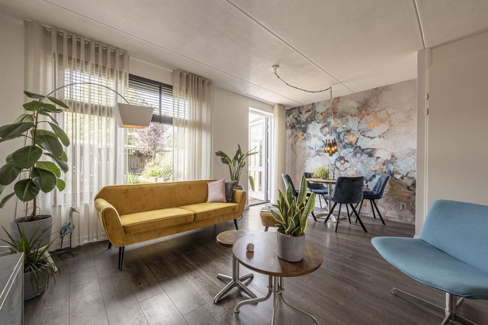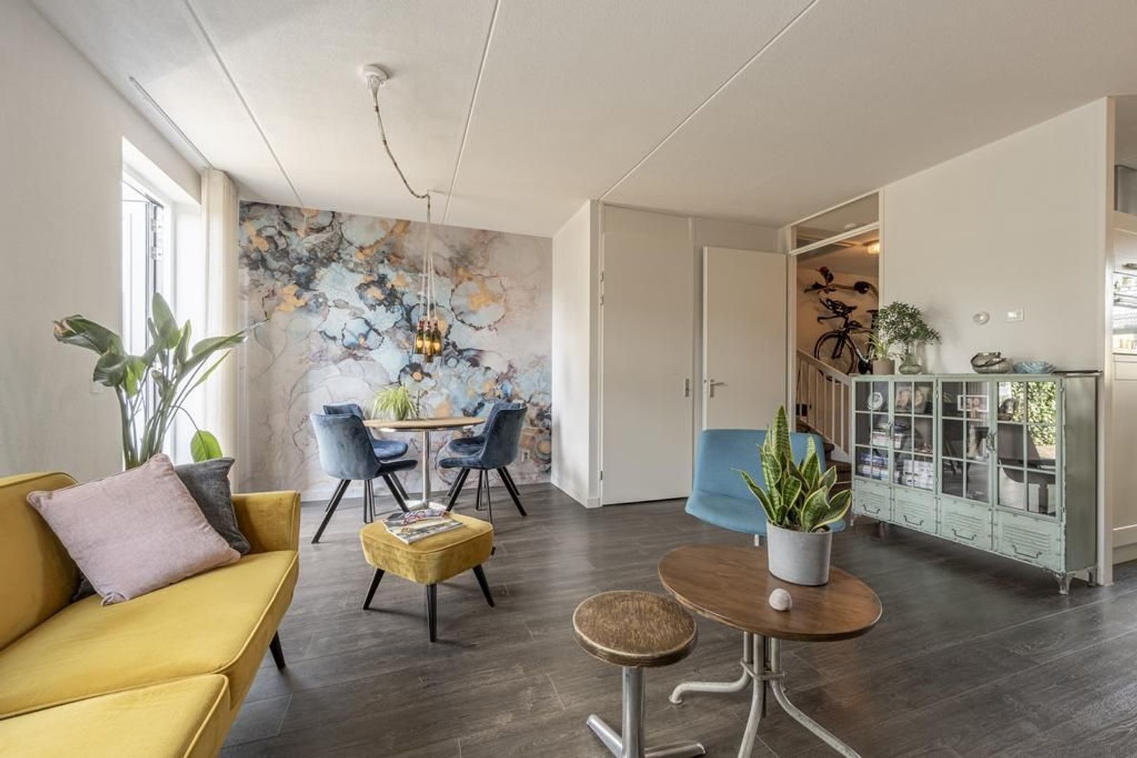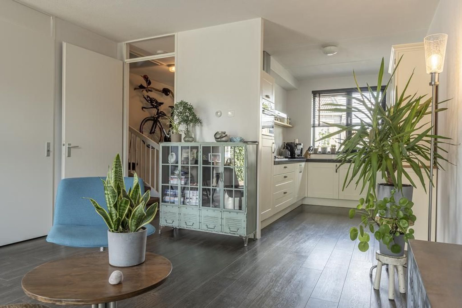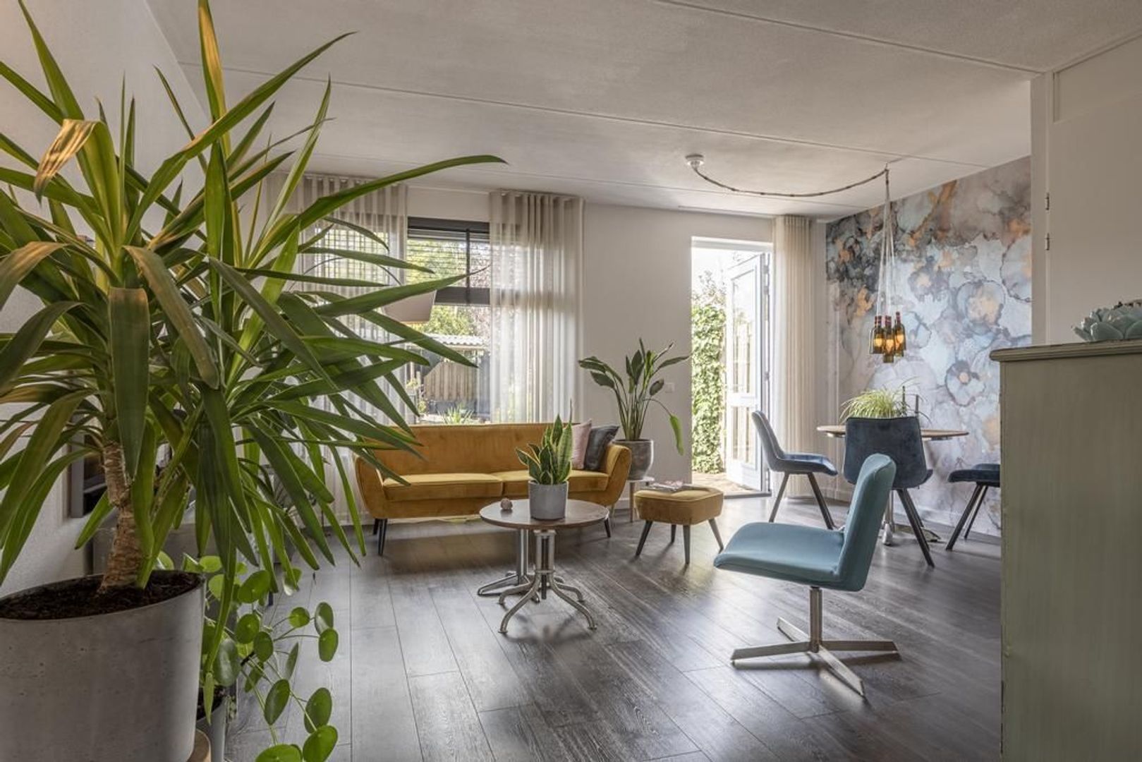 Tuingerichte woonkamer met eigentijdse laminaatvloer en praktische trapkast.