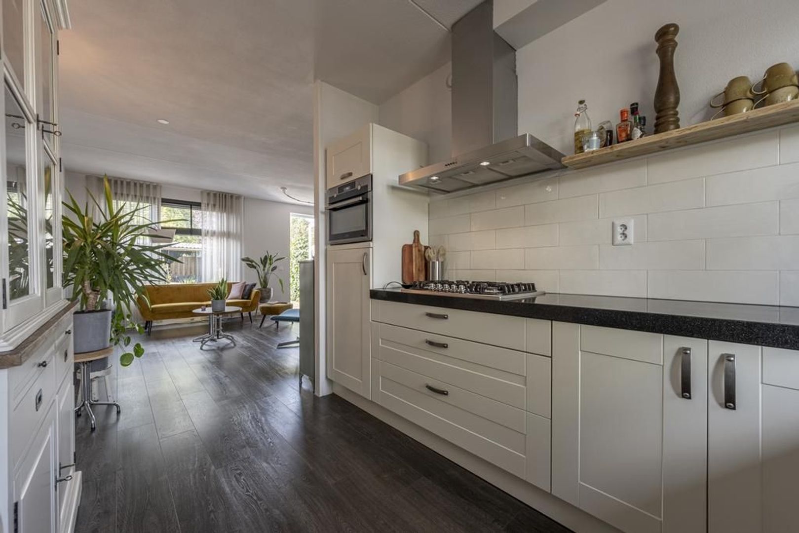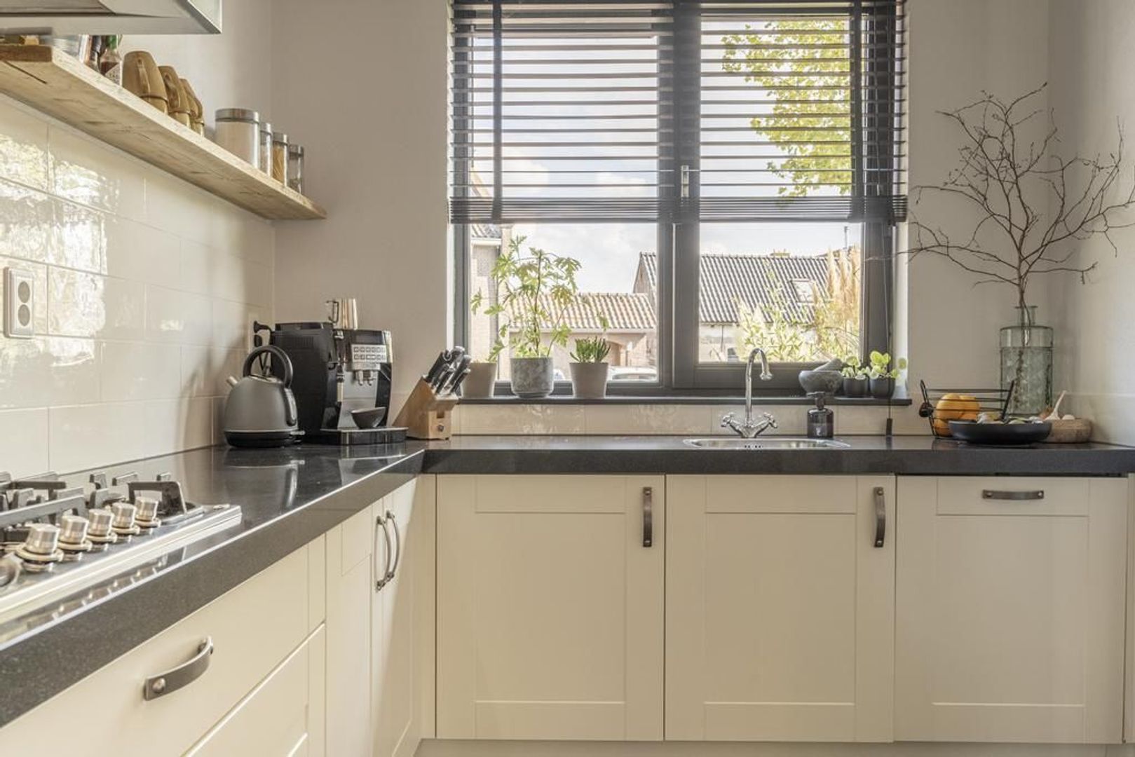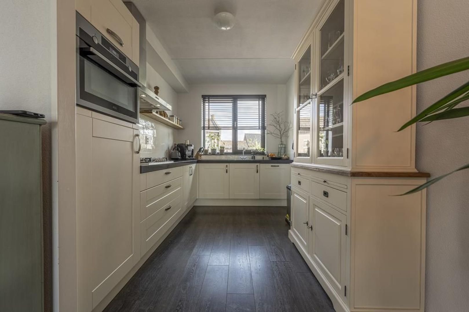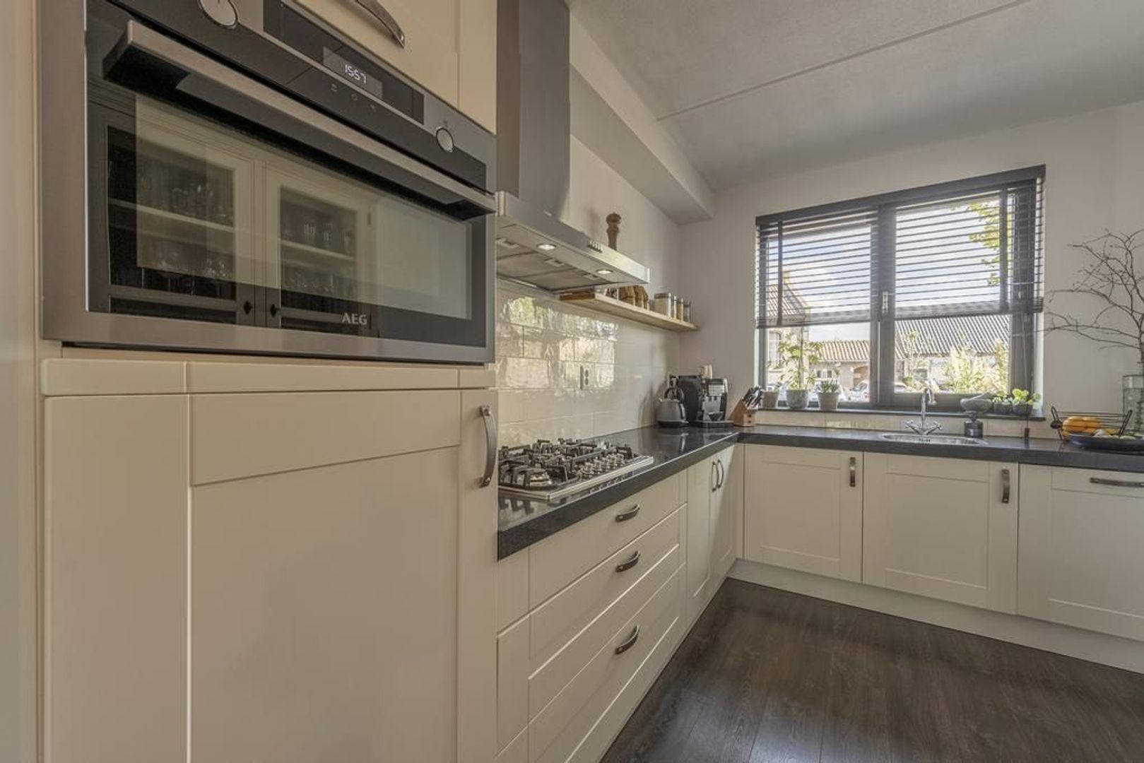 De open keuken staat aan de straatkant. Deze heeft een mooie L-vormige inrichting in een neutrale kleur en is voorzien van een composiet aanrechtblad, met een 5-pits gaskookplaat, afzuigkap, vaatwasser, combi-magnetron en koelkast.