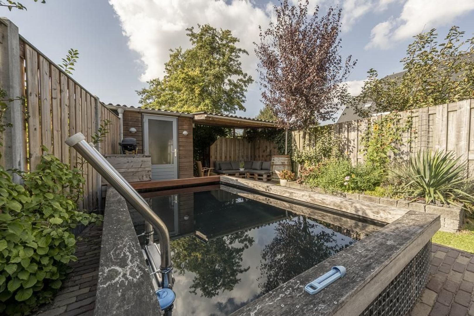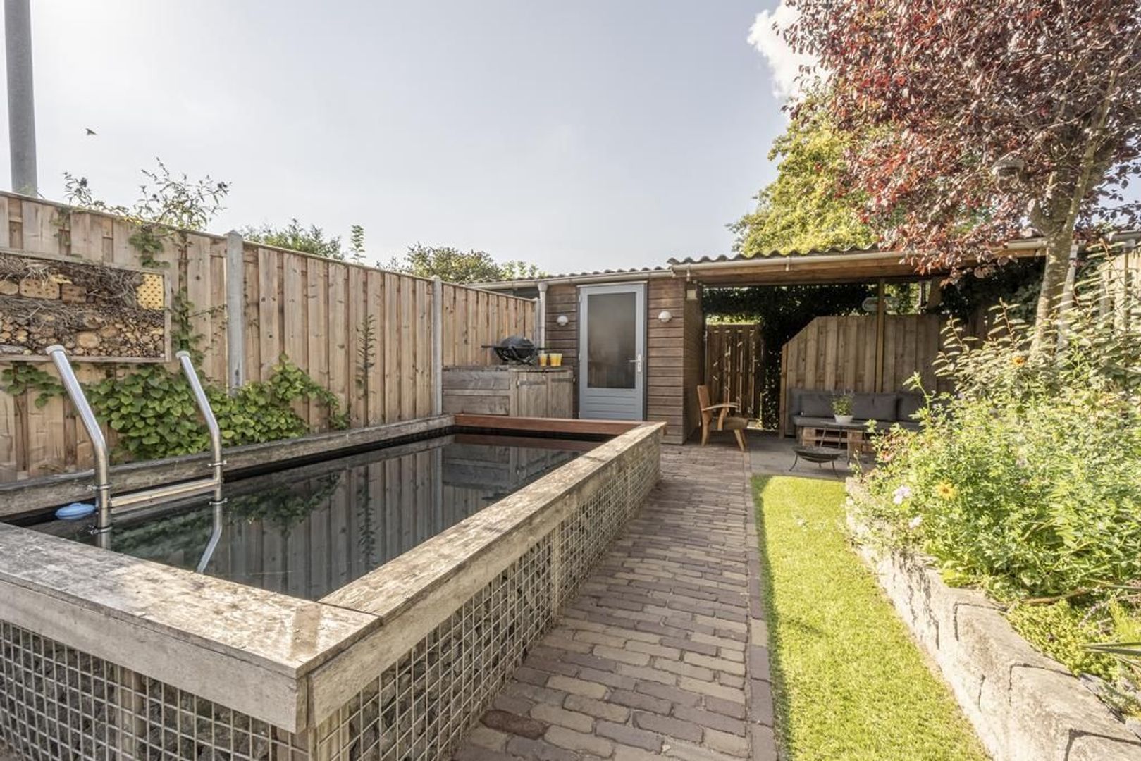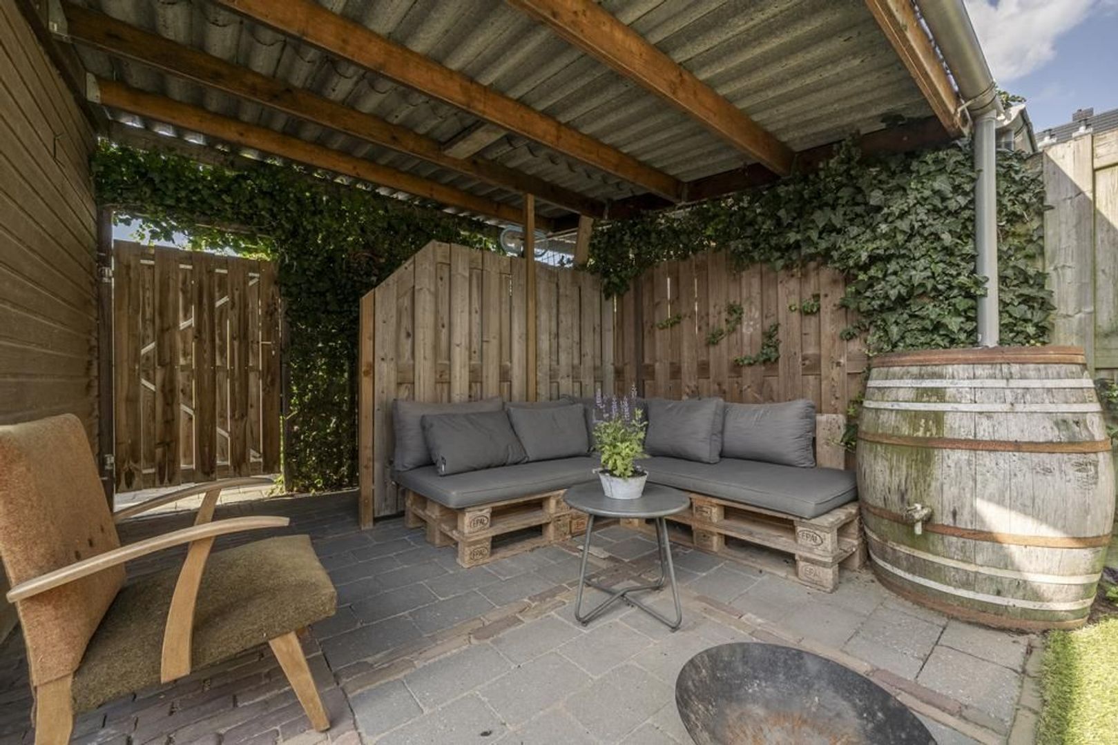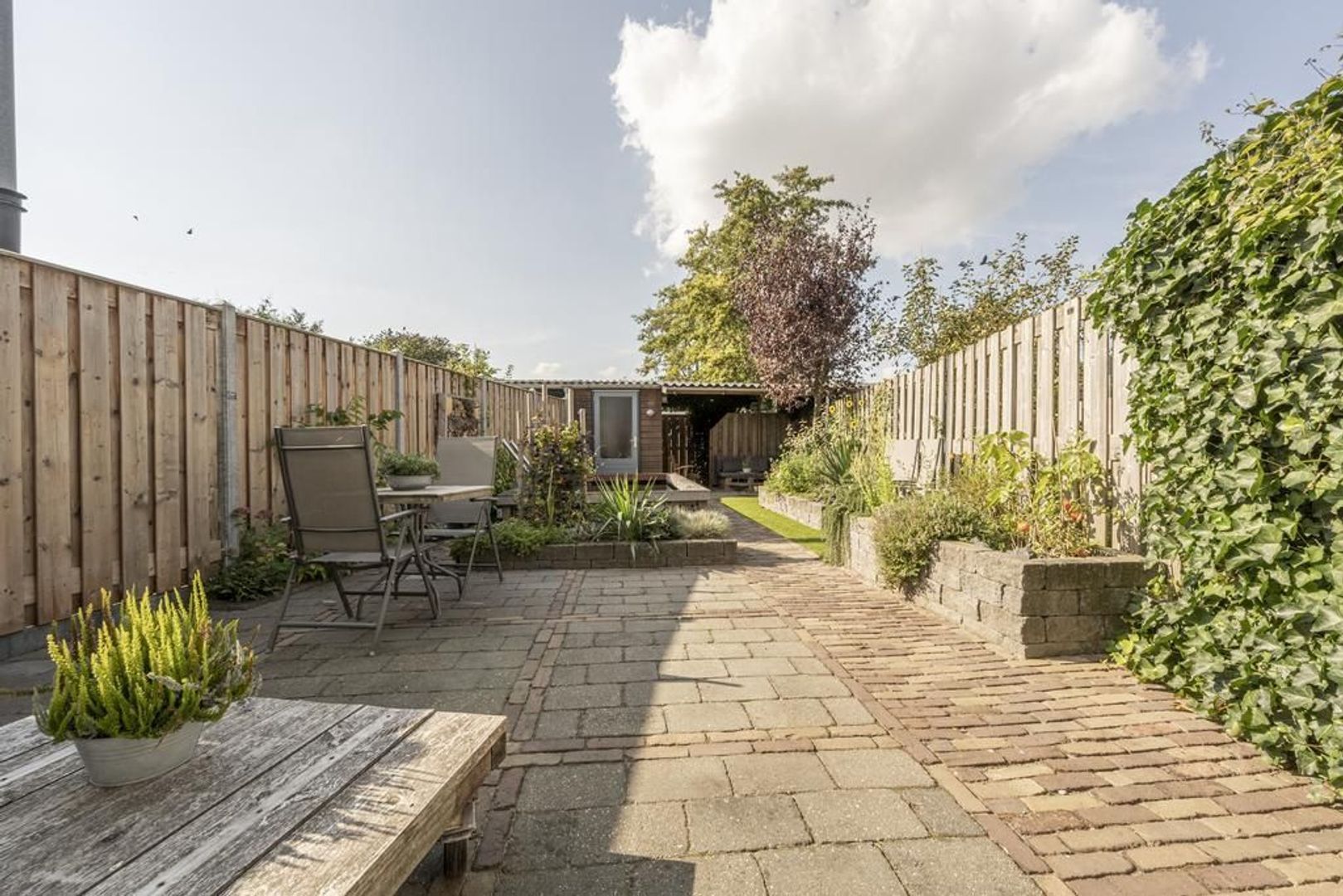 Achterin staat een houten berging, waaraan een gezellige overkapping is gemaakt.