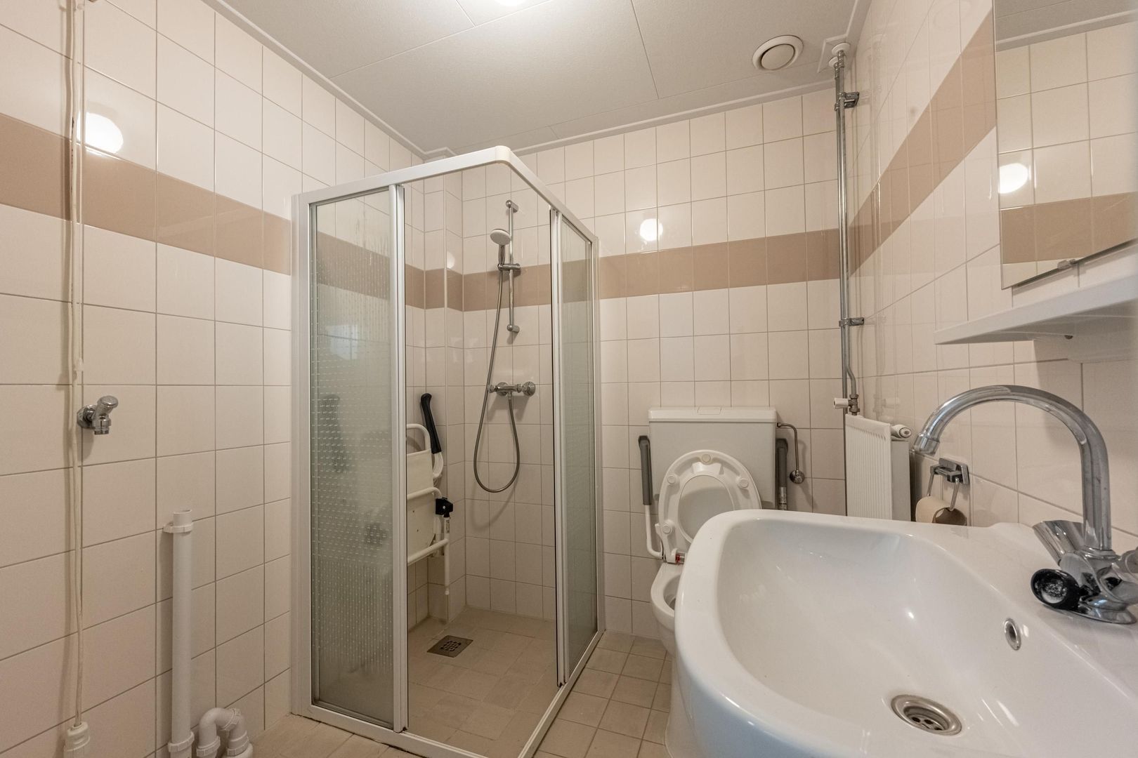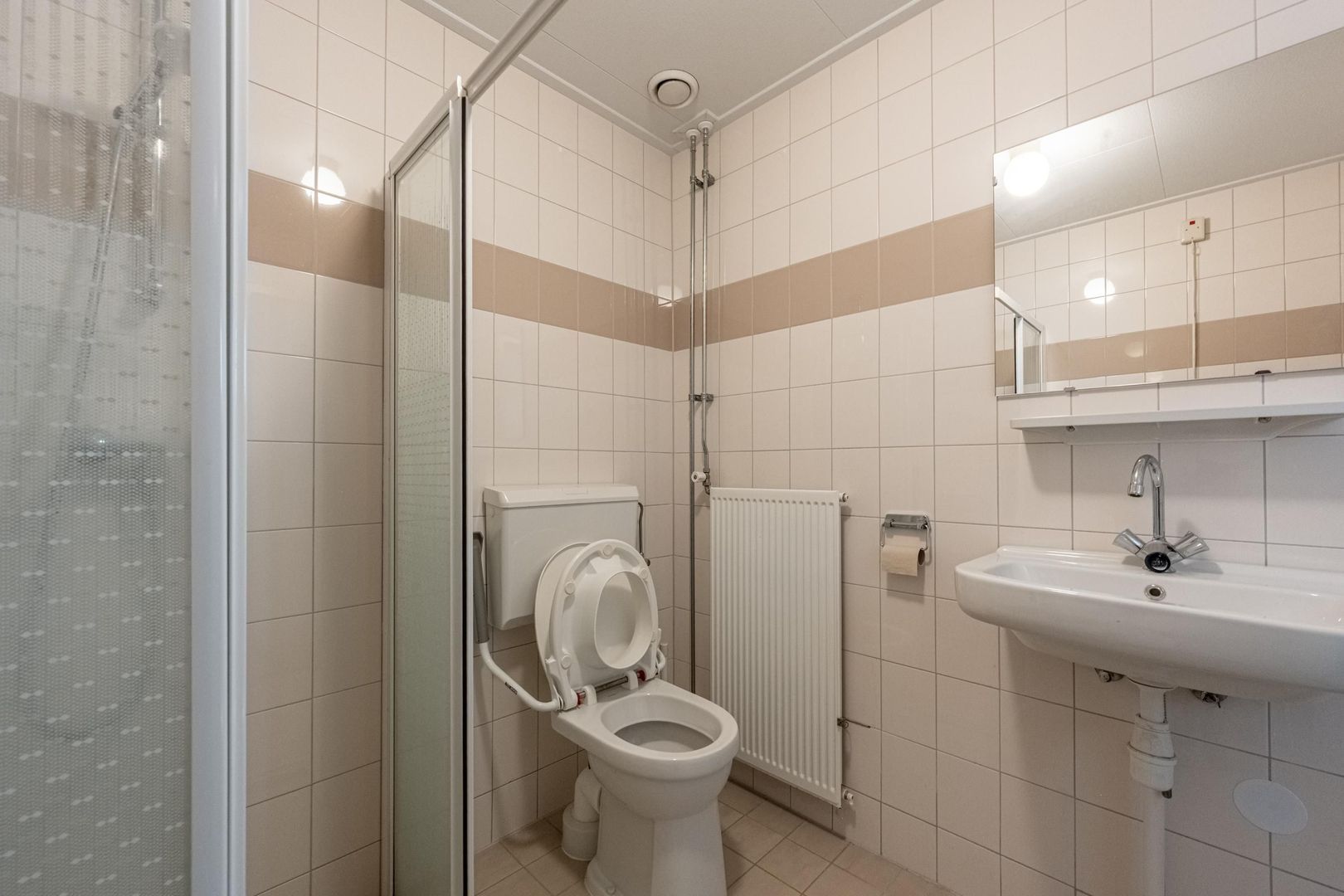 Op de eerste verdieping zijn twee slaapkamers en een badkamer met douchegelegenheid, wastafel, een tweede toilet en de aansluiting voor de wasmachine.