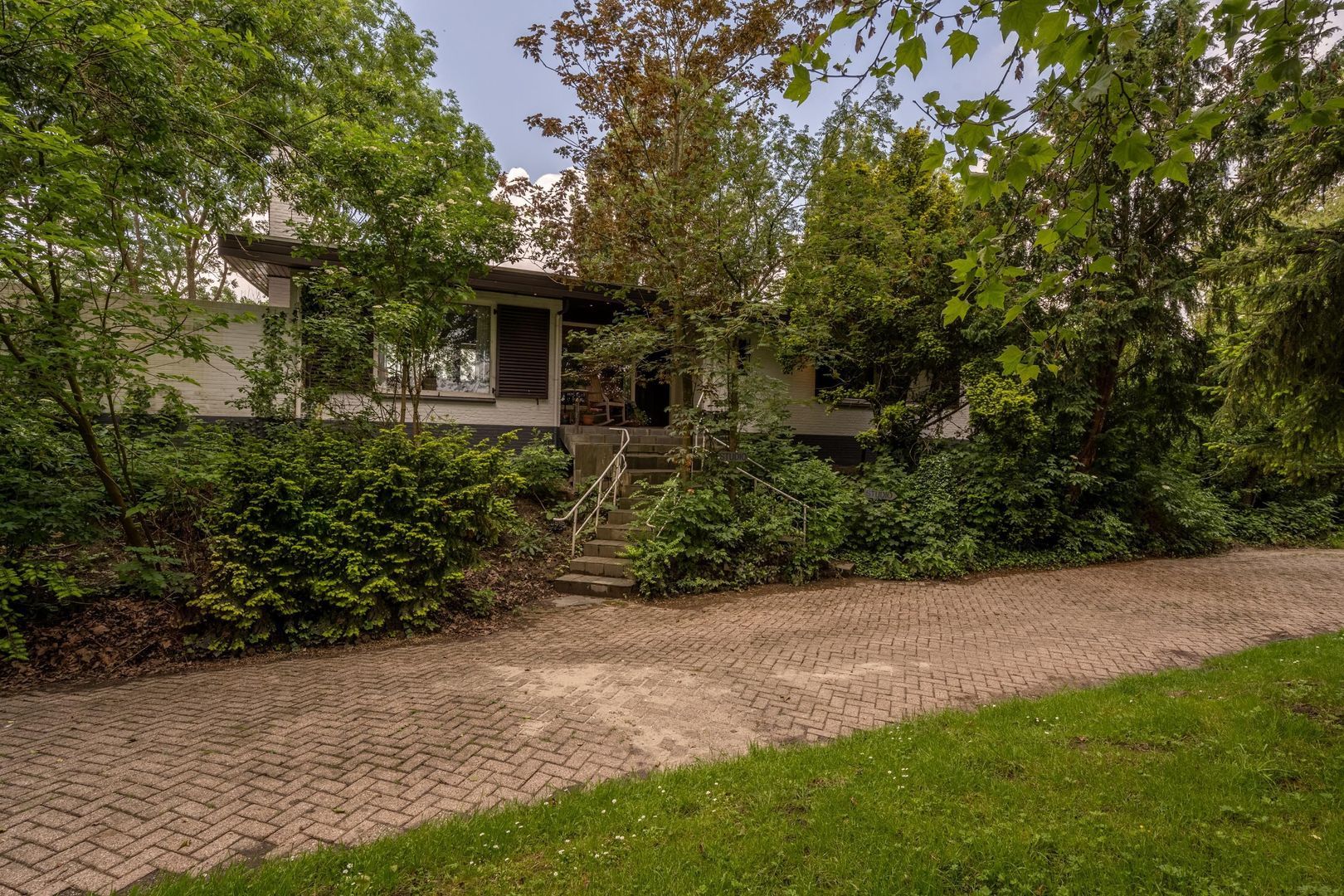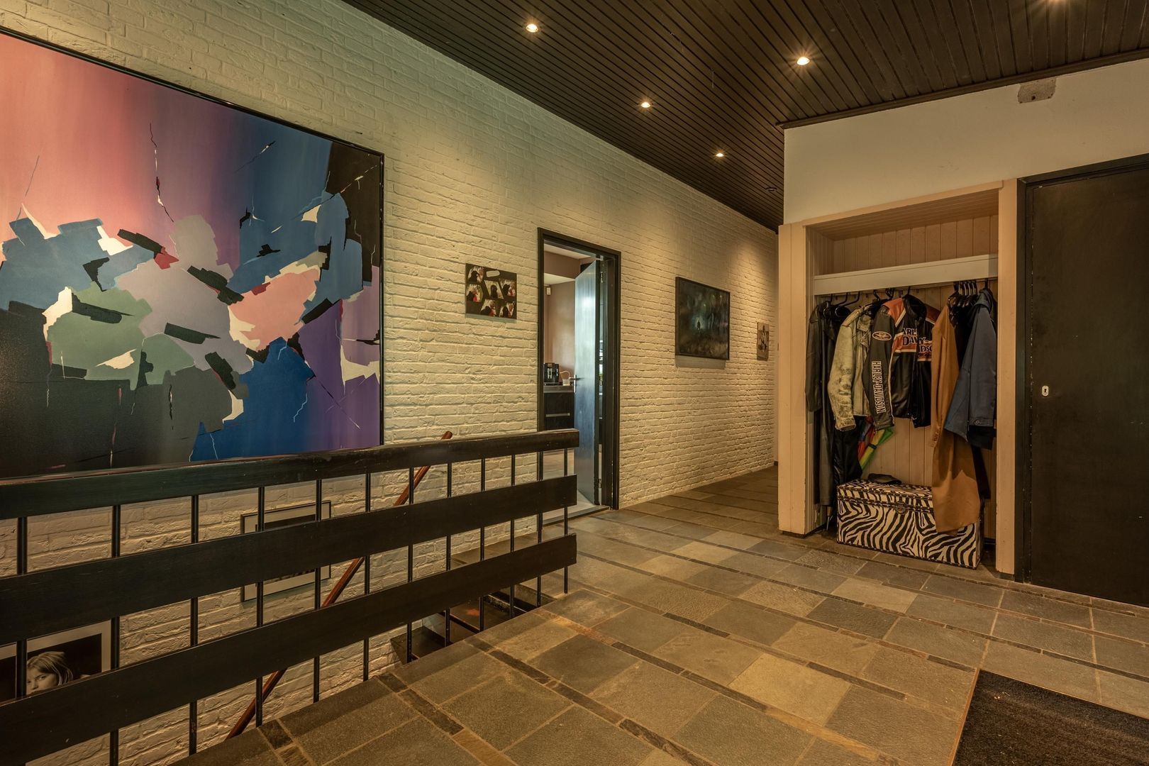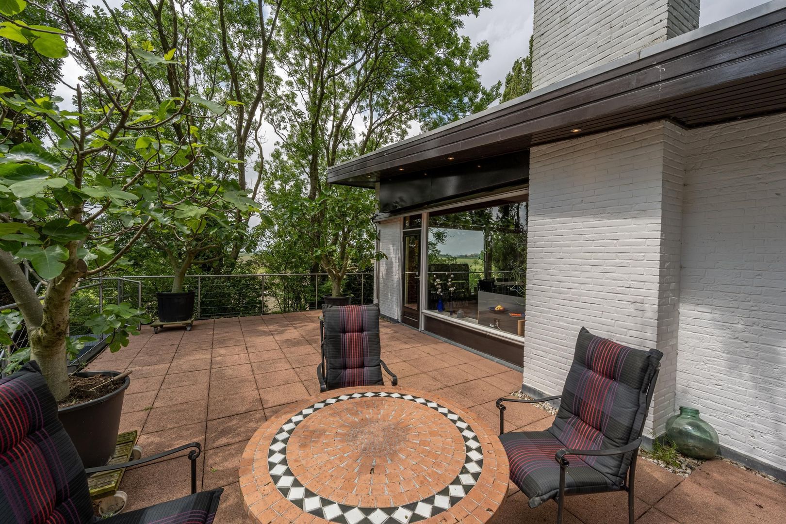 Dit landhuis dateert van 1967. Destijds gebouwd als groot, strak en modern gebouw met lessenaars dak, grote ramen en veel lichtinval. Het woongedeelte bevindt zich op de eerste verdieping. Daar treffen we een royale L-vormige huiskamer met open haard, een moderne keuken, een ruime ‘master bedroom, met aansluitende badkamer en een logeerkamer aan. Op de begane grond is - met onder andere vijf kamers - een zee van ruimte. Het terras dat grenst aan de woonkamer, biedt een onbetaalbaar uitzicht en een optimale privacy.