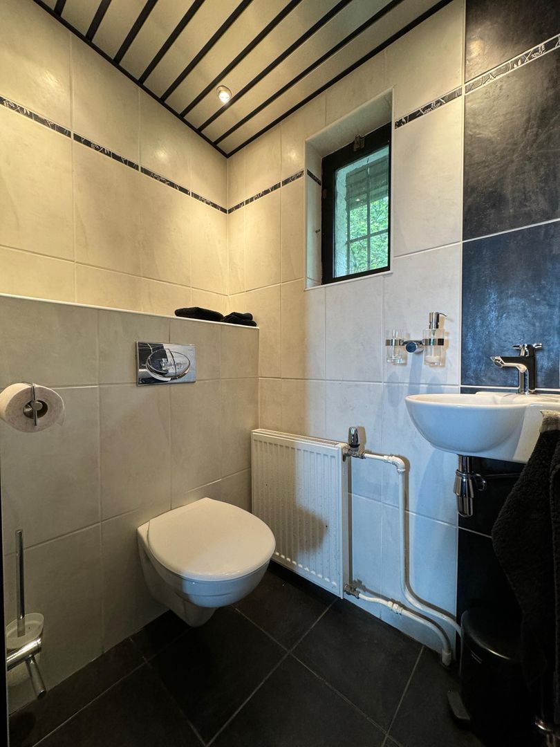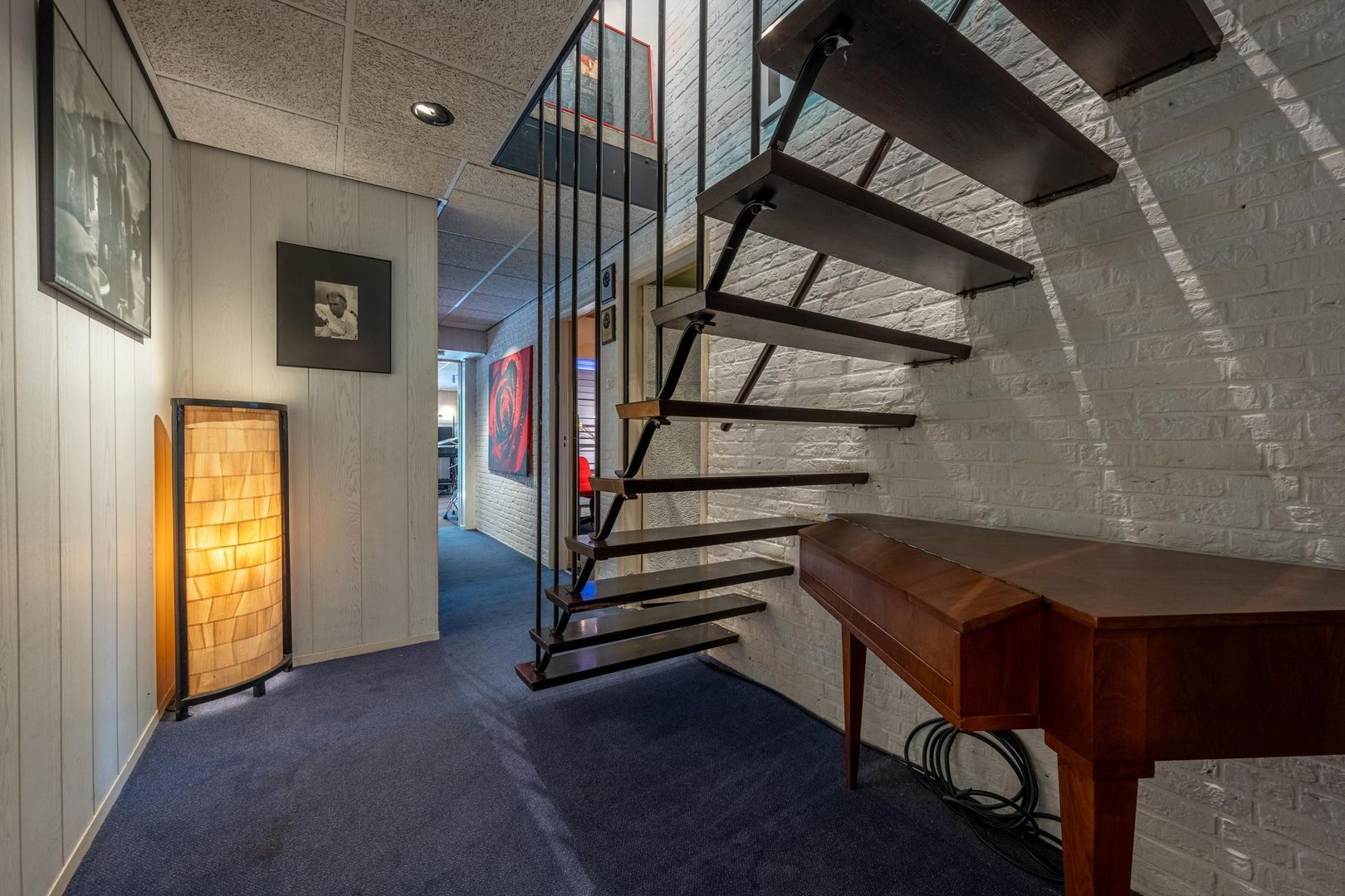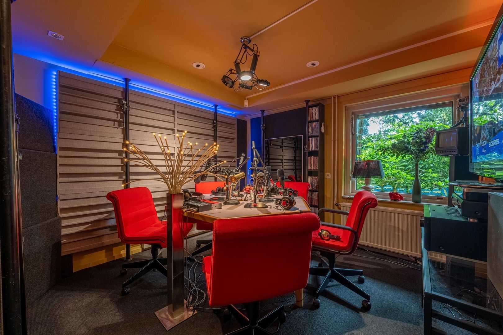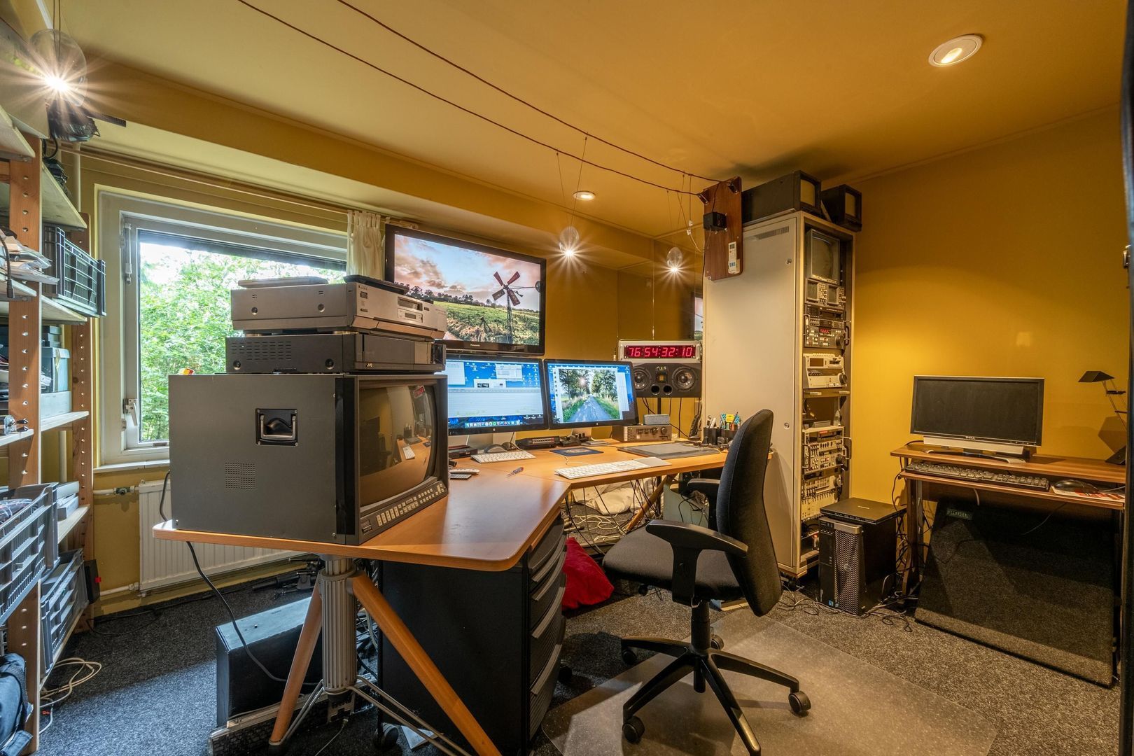 Grenzend aan de huidige muziekopnameruimte (tuinkamer) treffen we een tweede open haard en een kitchenette aan. Op de vloer ligt ook hier PVC kliklaminaat. Aan de 16 meter lange gang treffen we een moderne badkamer met toilet en een CV-ruimte annex berging aan. De vier kamers zijn geschikt om als slaapkamer te worden gebruikt. Een kleine vijfde ruimte kan als kinderkamer, berging of inloopkast worden benut.