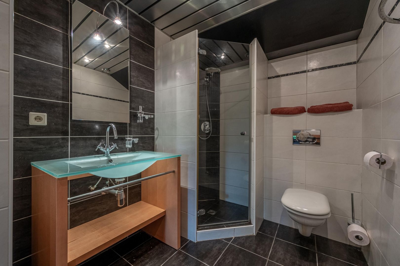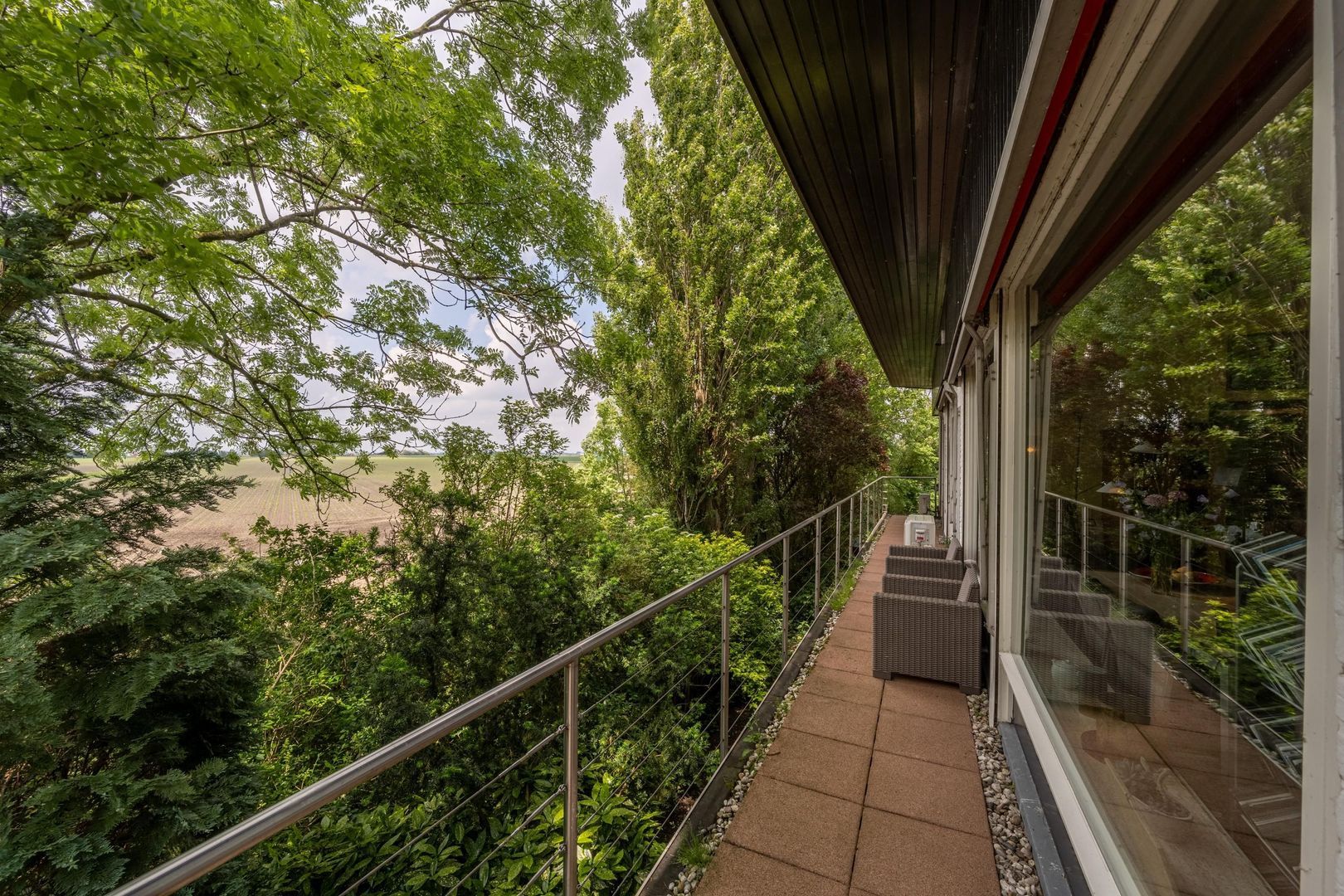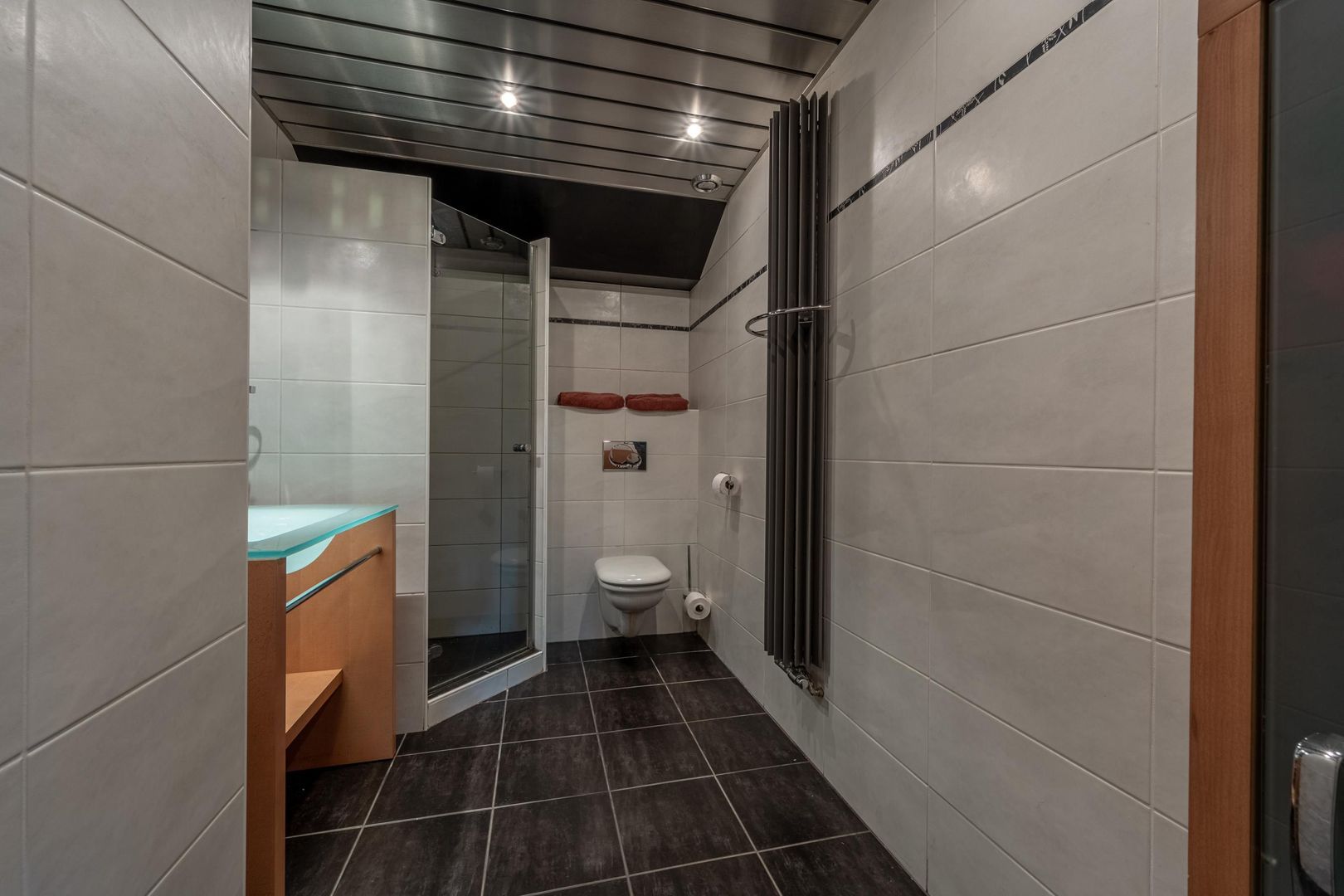 Het woongedeelte met open haard, eetgedeelte en keuken zijn met uitzicht op het zuidwesten gesitueerd, wat een adembenemend landelijk panorama oplevert. Het terras en aansluitend langgerekt balkon zijn zowel vanuit de woon- als slaapkamer bereikbaar.