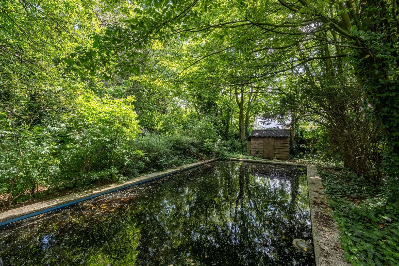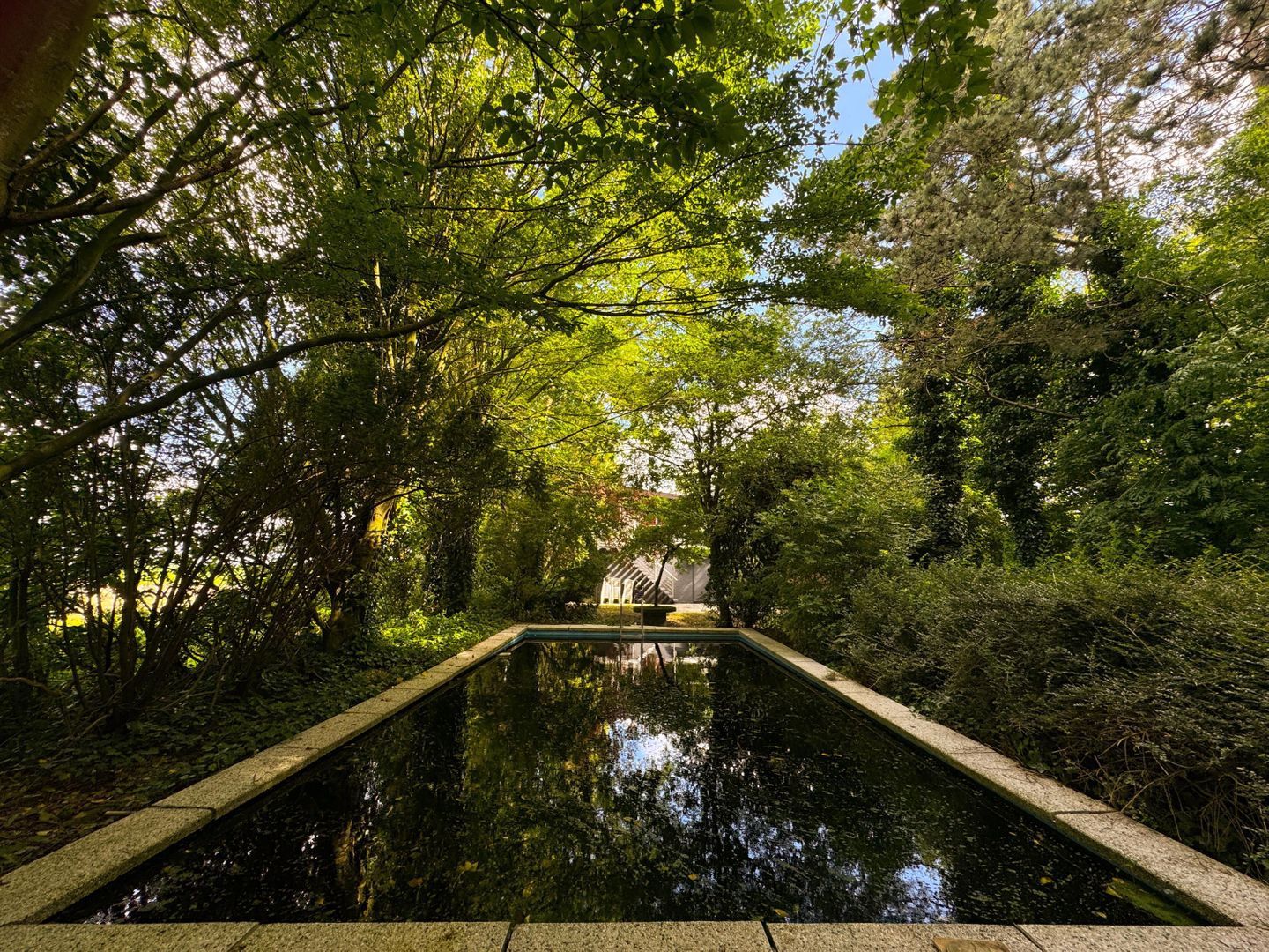 In een door bomen en struiken beschut gedeelte van de tuin ligt het buitenzwembad.