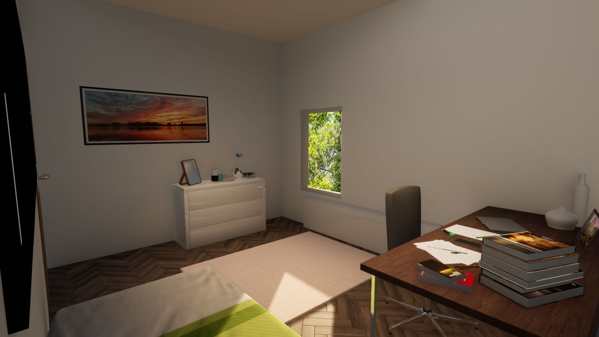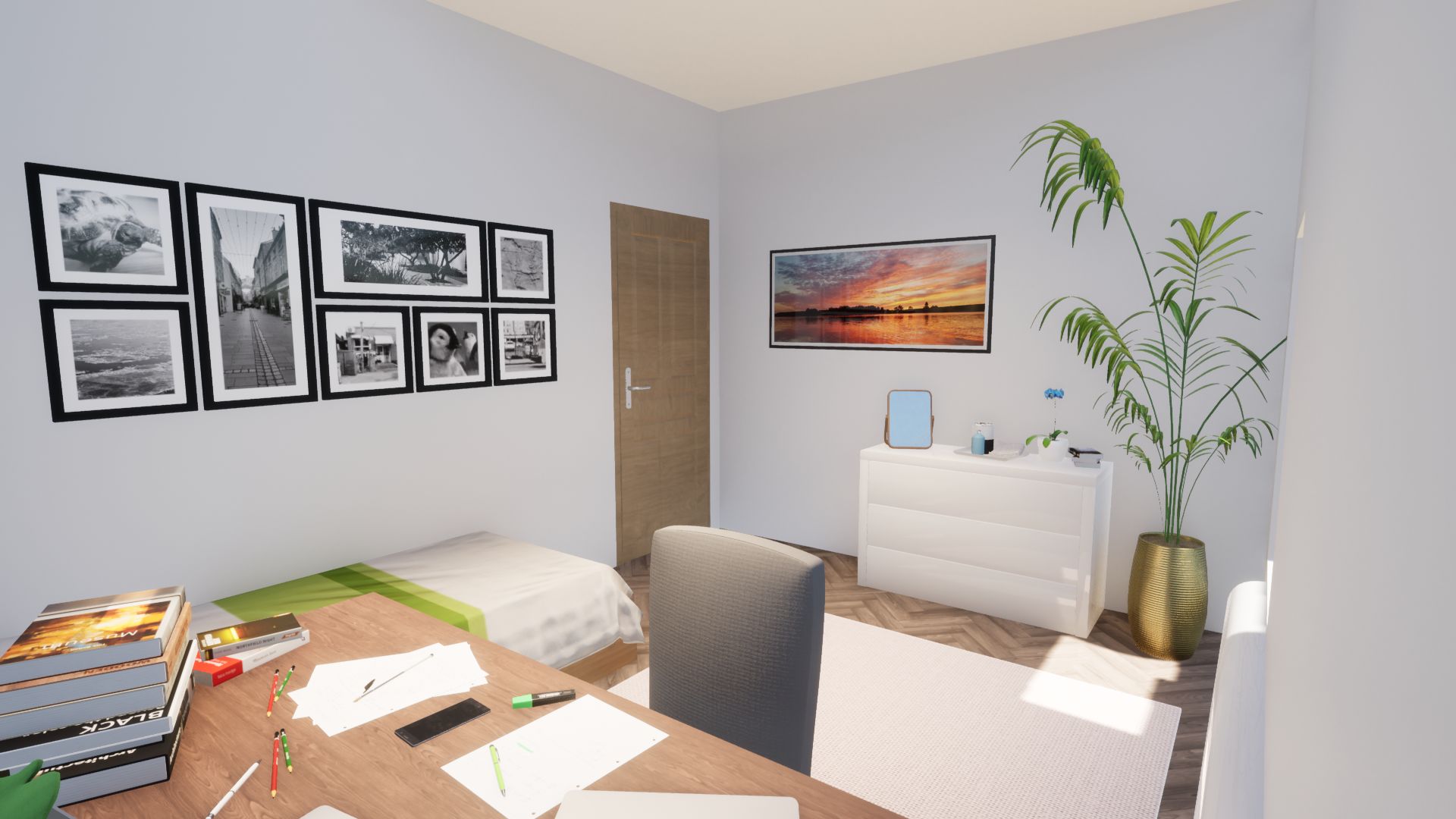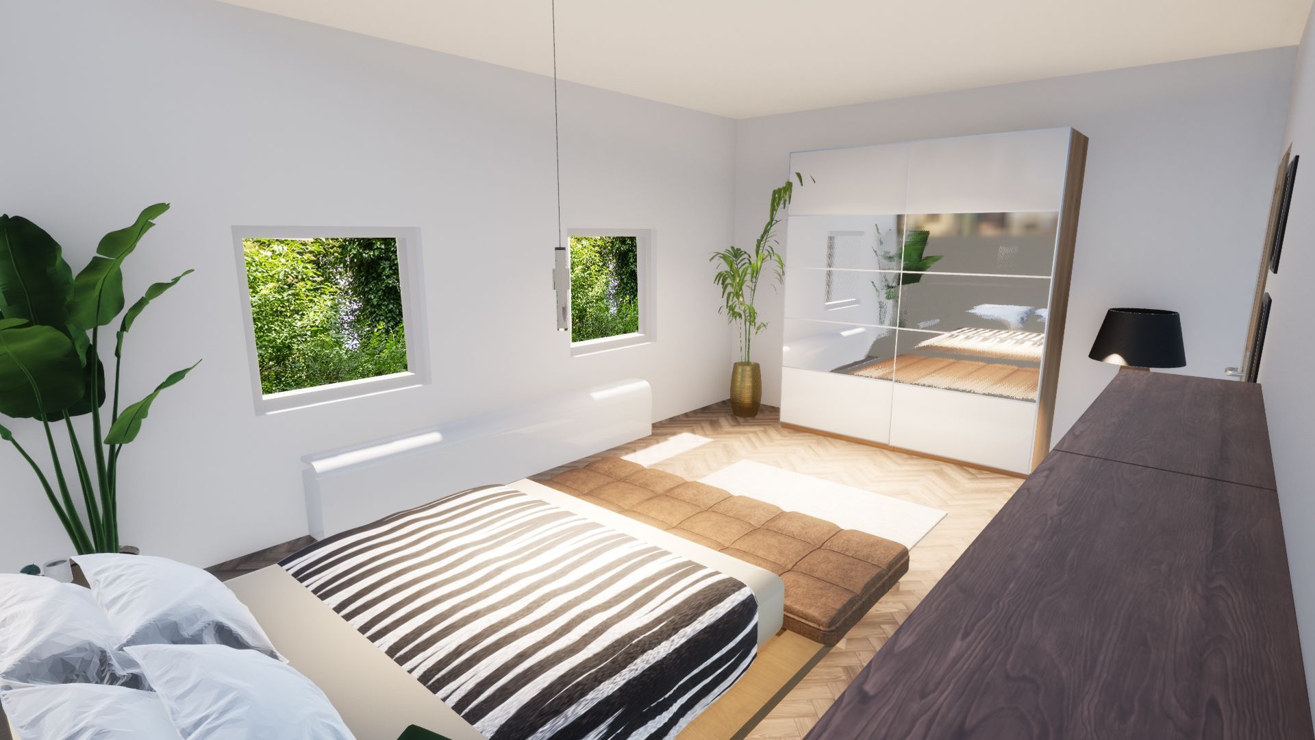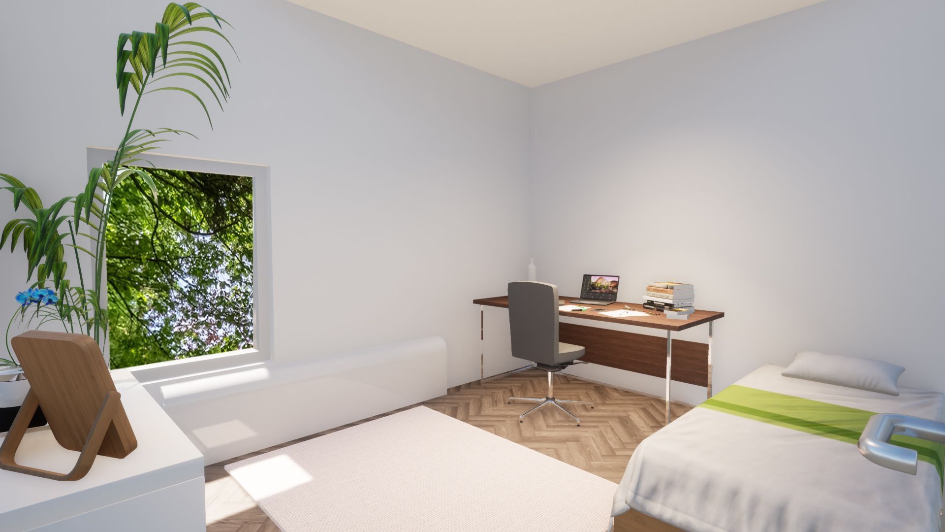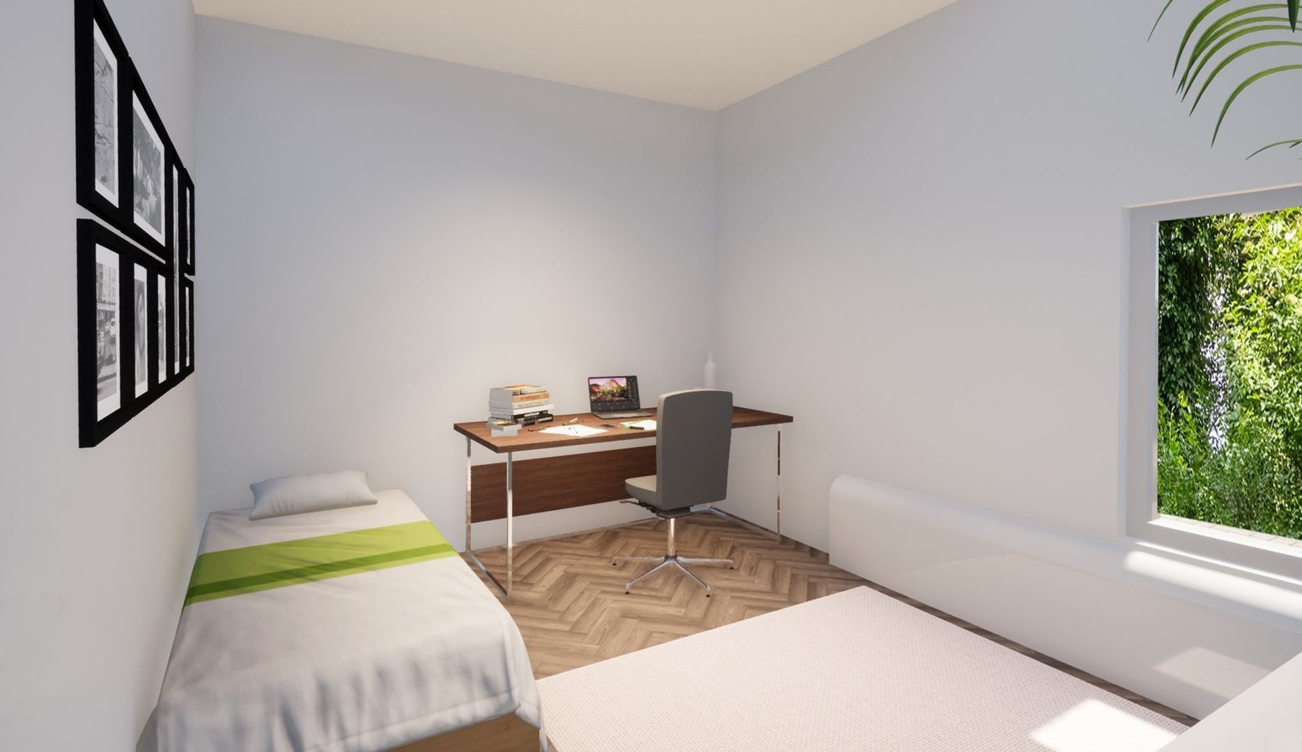 Op de begane grond zijn nu vier kamers beschikbaar. Nu ingericht als bedrijfsruimte toont een ‘artist impression’ hoe drie daarvan als woon-, slaap- of werkkamer zouden kunnen worden benut.