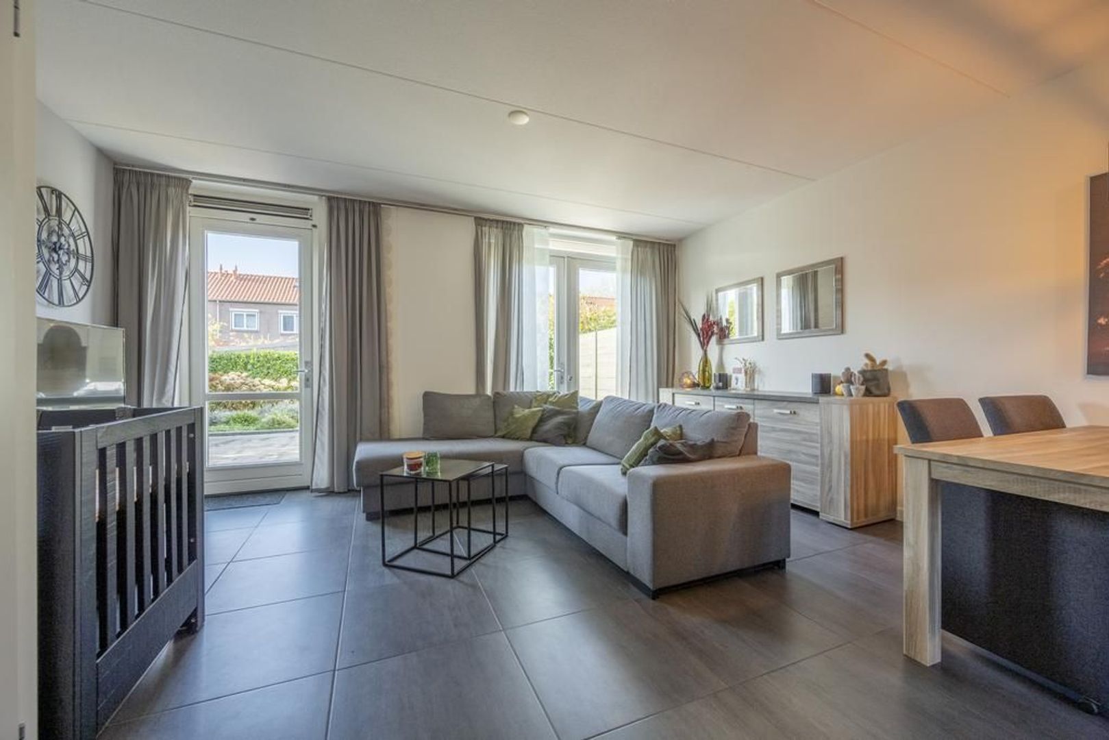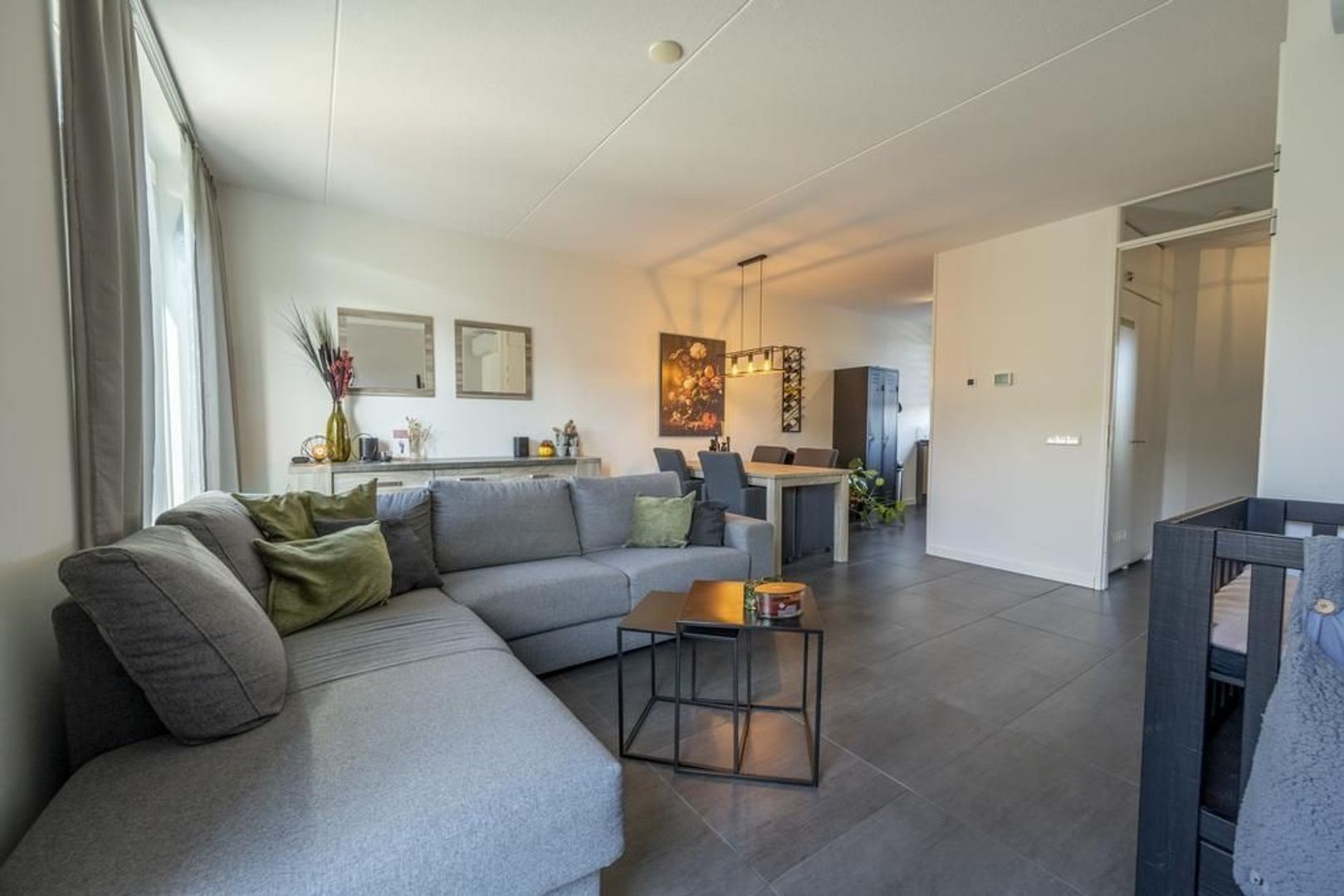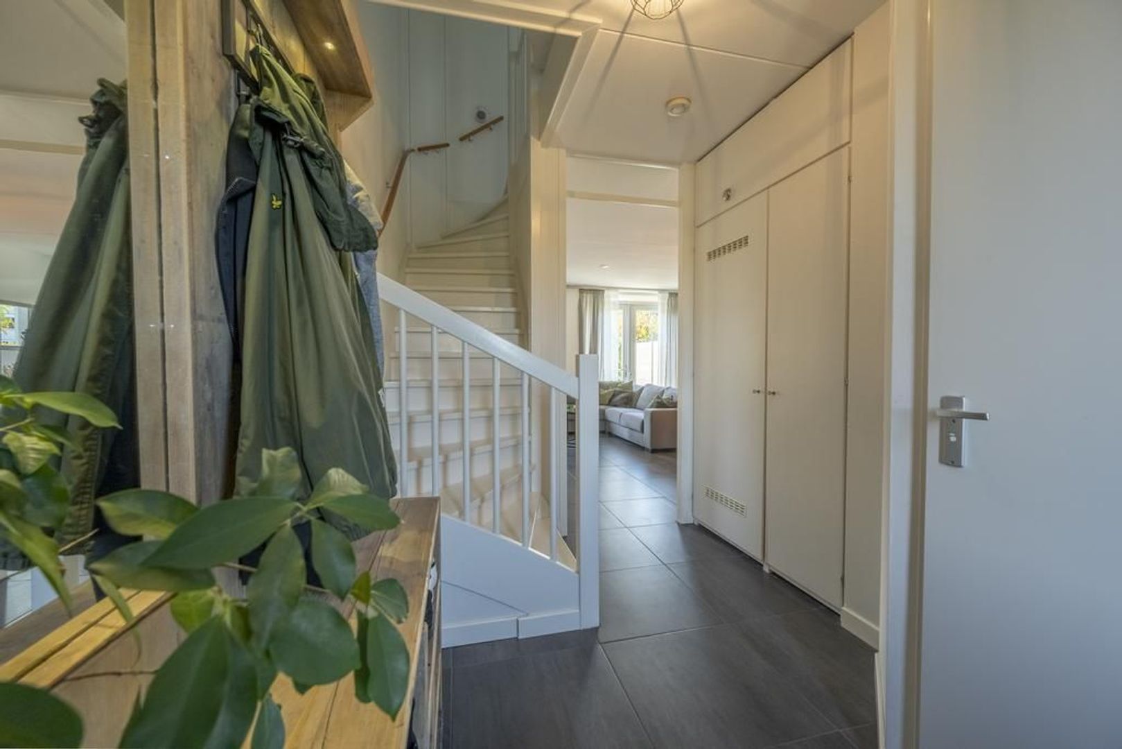 De begane grond is geheel voorzien van moderne plavuizen met daaronder comfortabele vloerverwarming. De wanden zijn voorzien van glasvliesbehang.