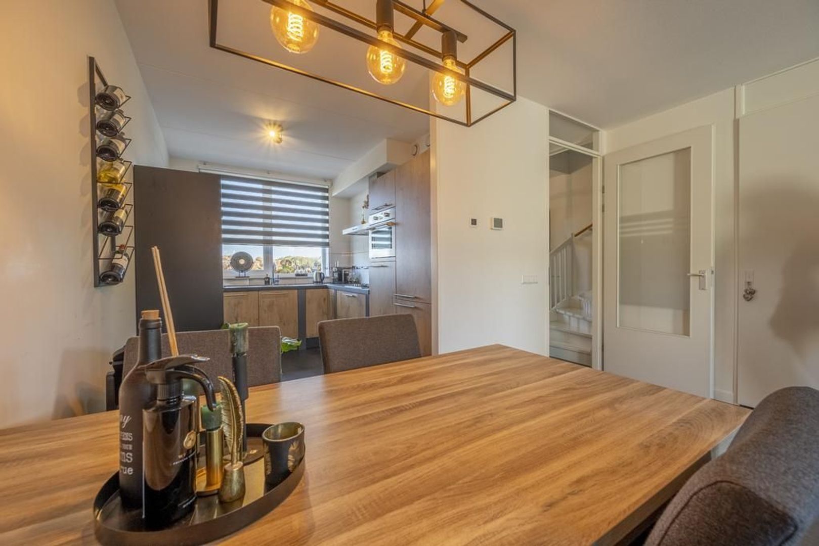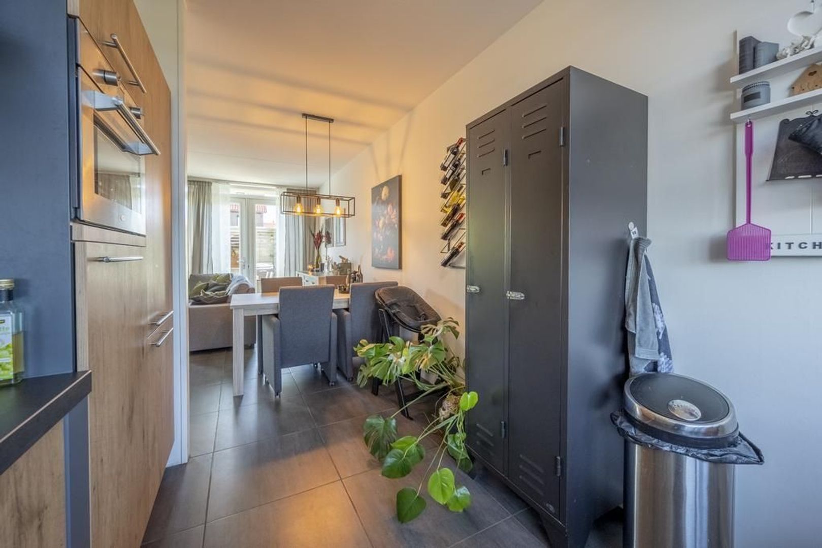 De woonkamer is gesitueerd aan de achterzijde en heeft openslaande deuren naar de gezellige tuin. De open keuken bevindt zich aan de straatzijde en biedt een fraai uitzicht over de landerijen.